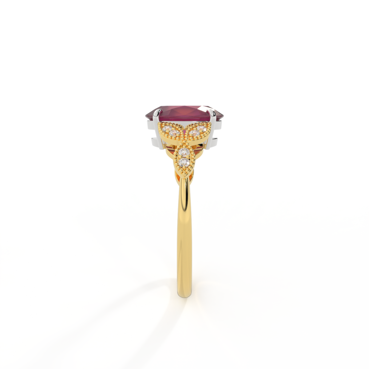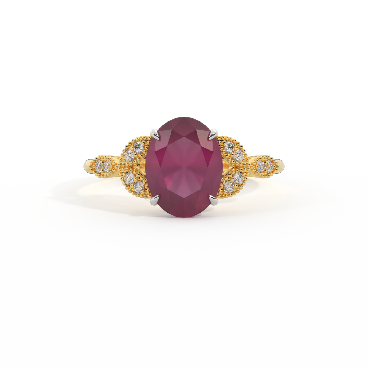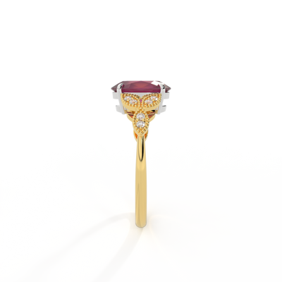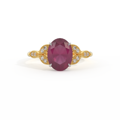 The beauty of a flower, re-imagined for eternity. Inspired by the romance of the Victorian era, this Oval cut Ruby is accentuated by a duo of delicate diamond-set petals with millegrain detail for an elegant twist on a timeless classic.
