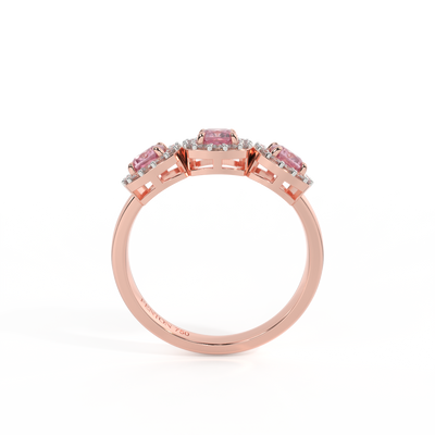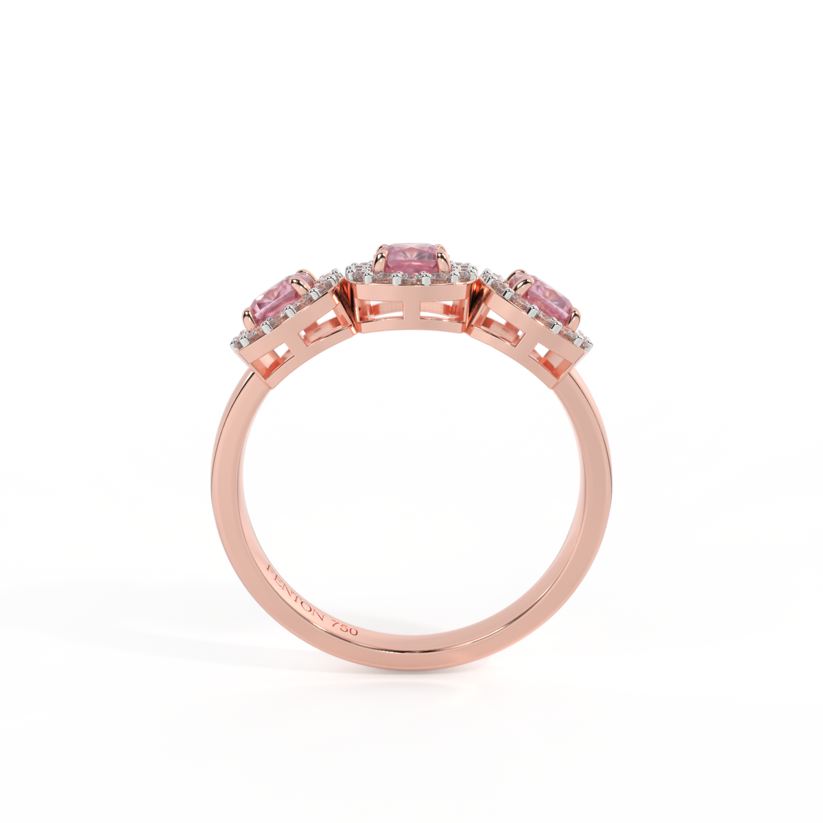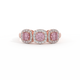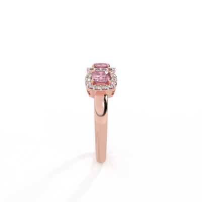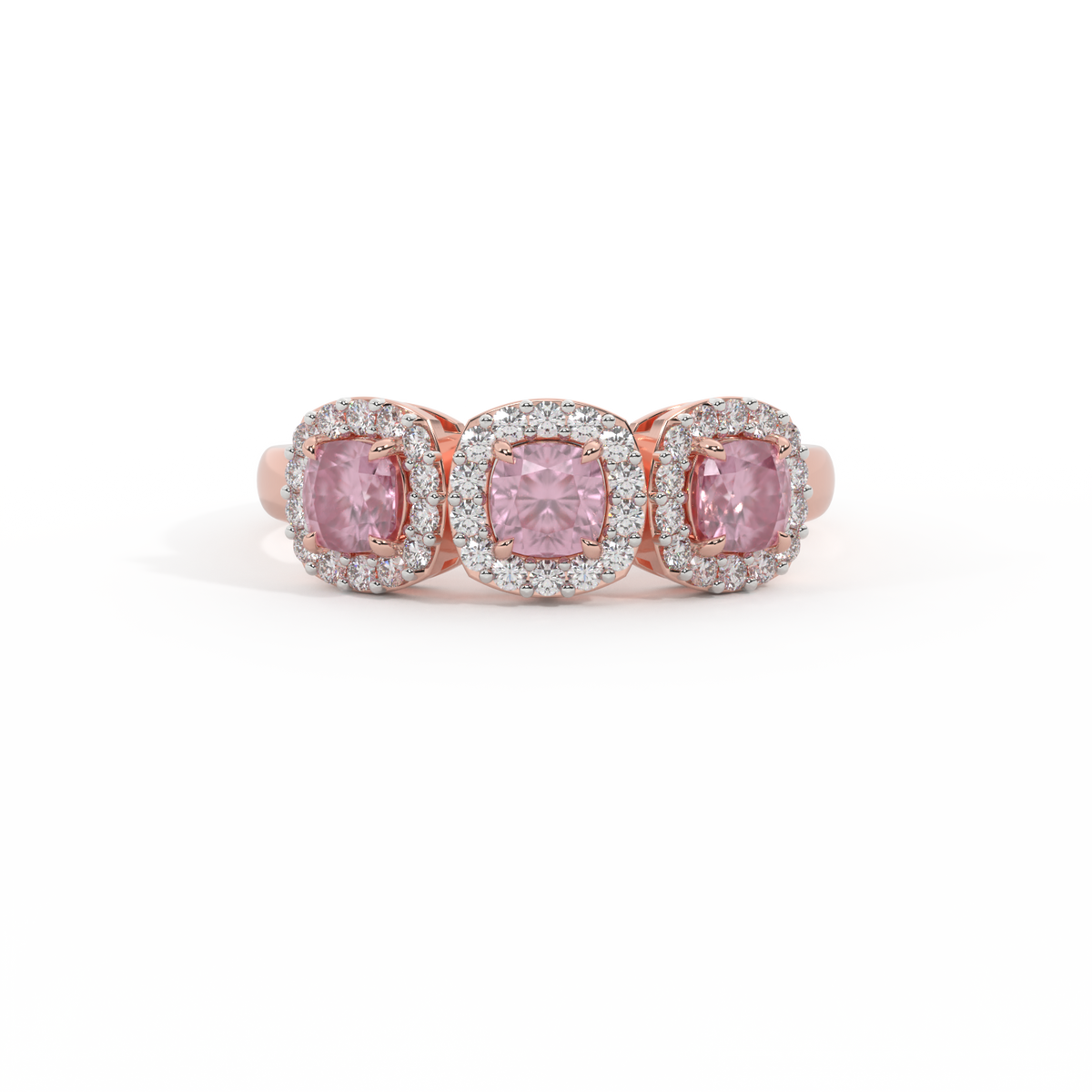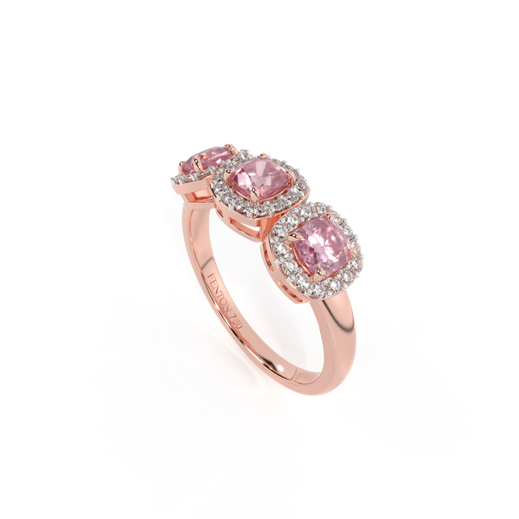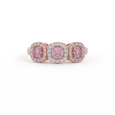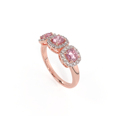 This low set, super wearable beauty, is reminiscent of a floral garland, one of the most universal symbols of love. Three Cushion cut Pink Sapphire stones are surrounded by diamond halos, each stone is completely unique.