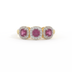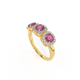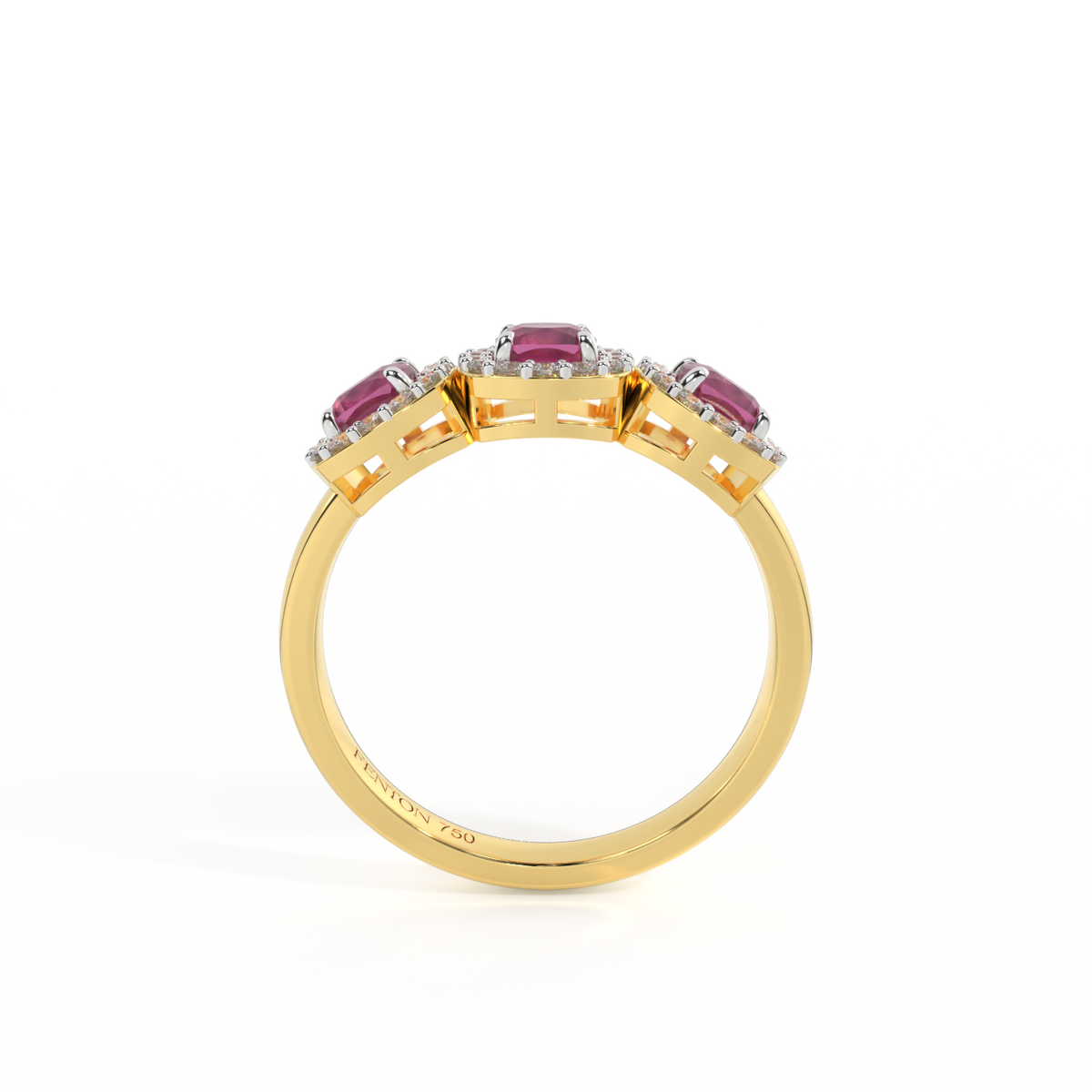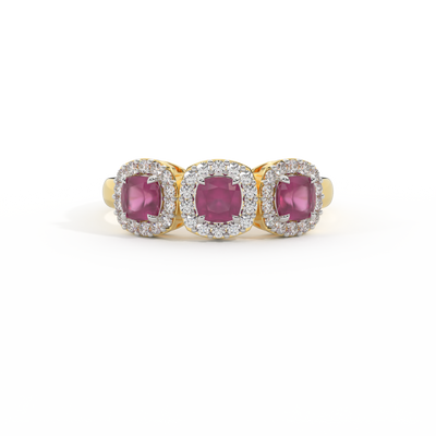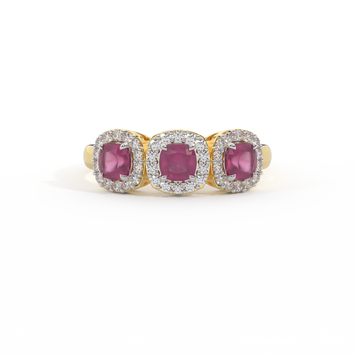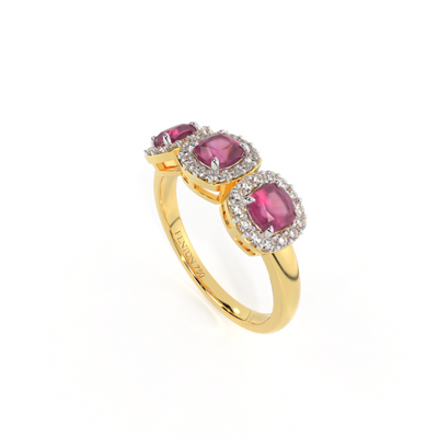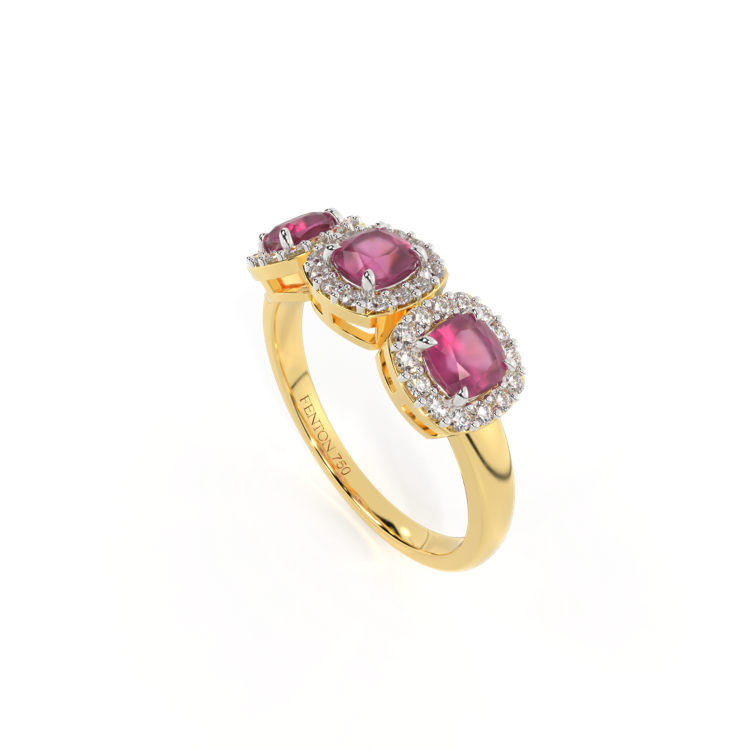This low set, super wearable beauty, is reminiscent of a floral garland, one of the most universal symbols of love. Three Cushion cut Ruby stones are surrounded by diamond halos, each stone is completely unique.