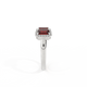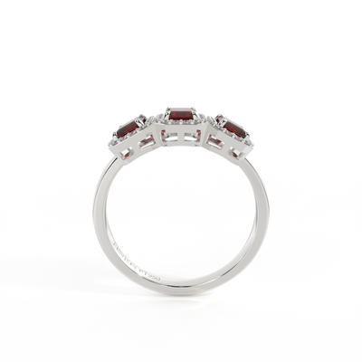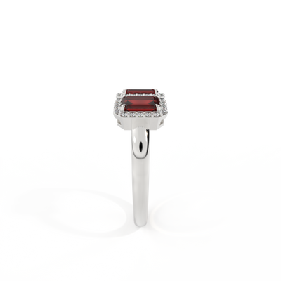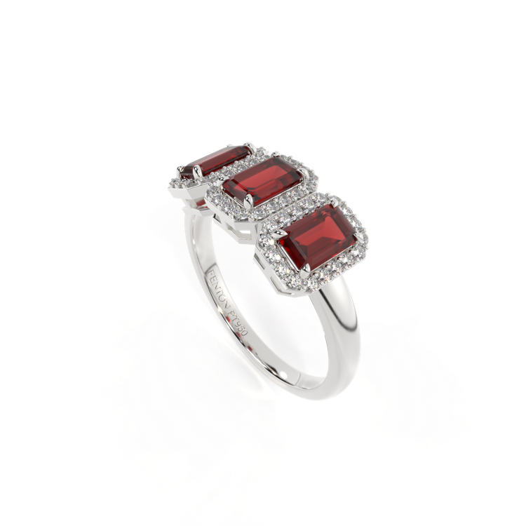 This low set, super wearable beauty, is reminiscent of a floral garland, one of the most universal symbols of love. Three Emerald cut Garnet stones are surrounded by diamond halos, each stone is completely unique.