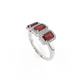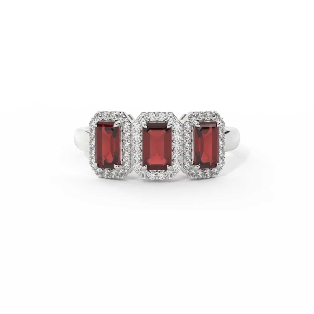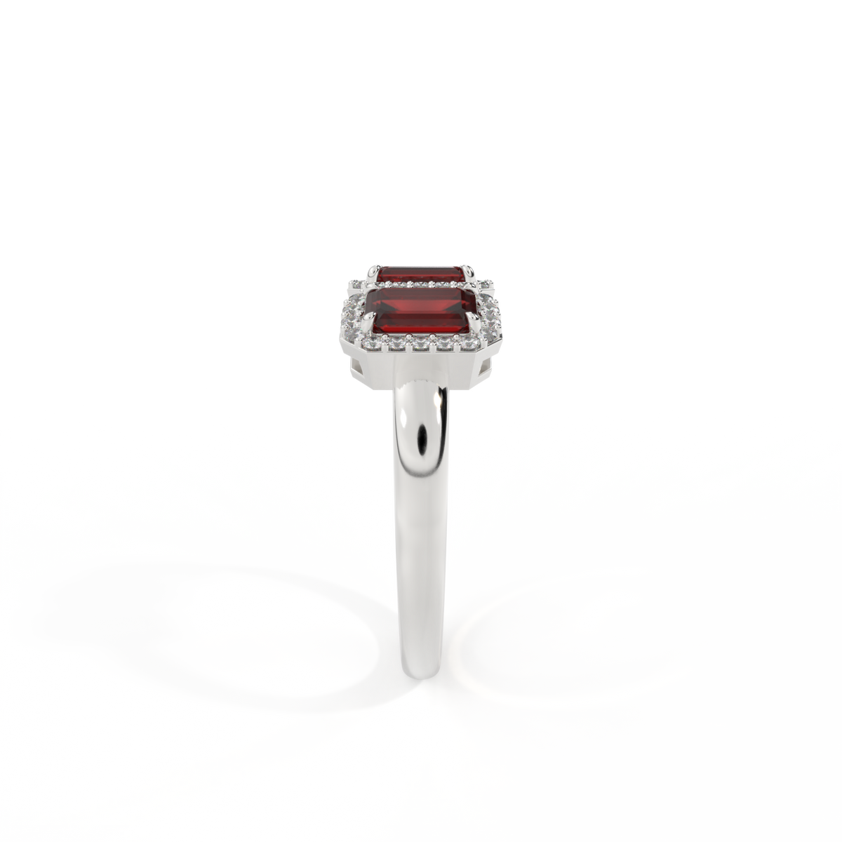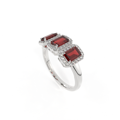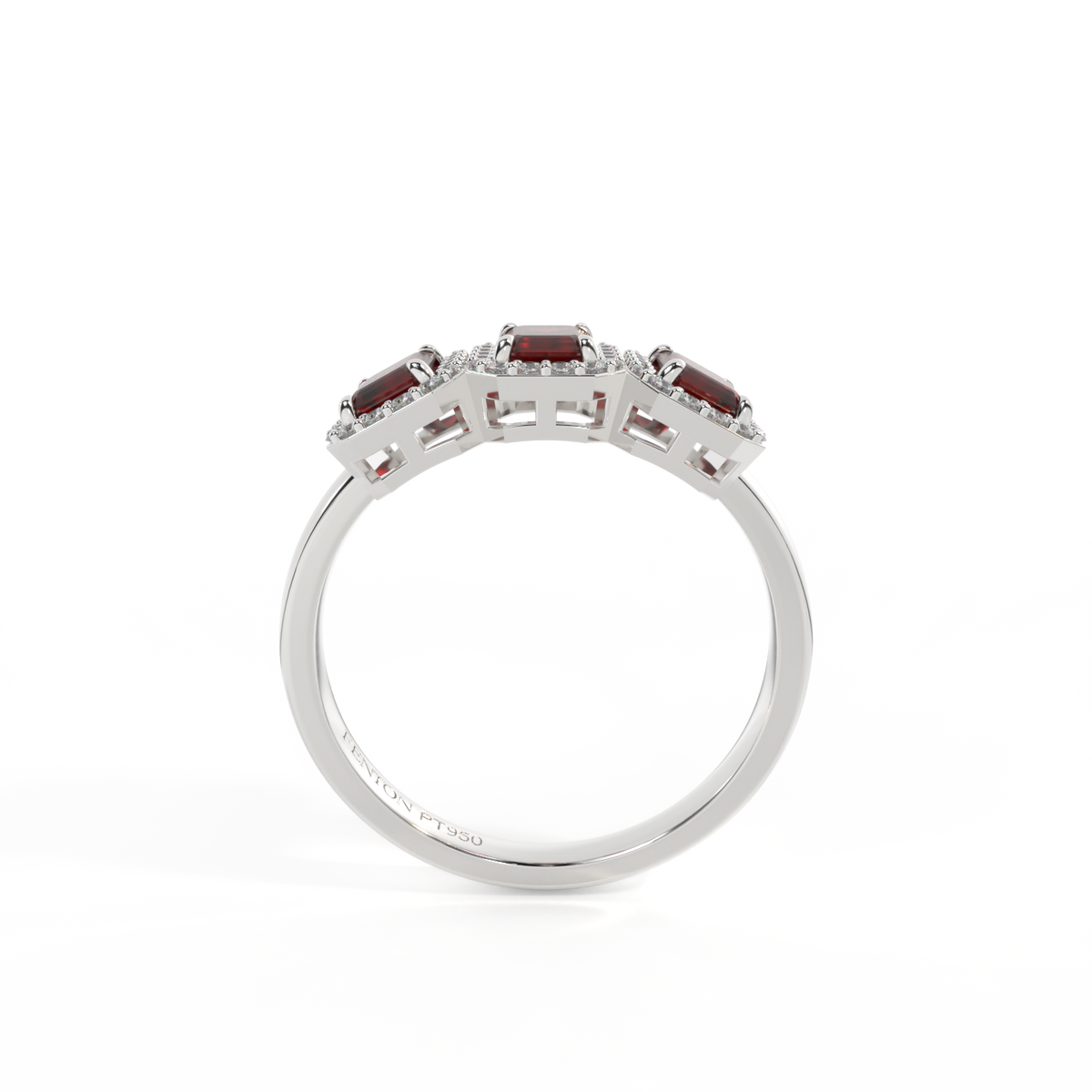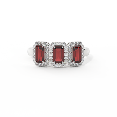 This low set, super wearable beauty, is reminiscent of a floral garland, one of the most universal symbols of love. Three Emerald cut Garnet stones are surrounded by diamond halos, each stone is completely unique.