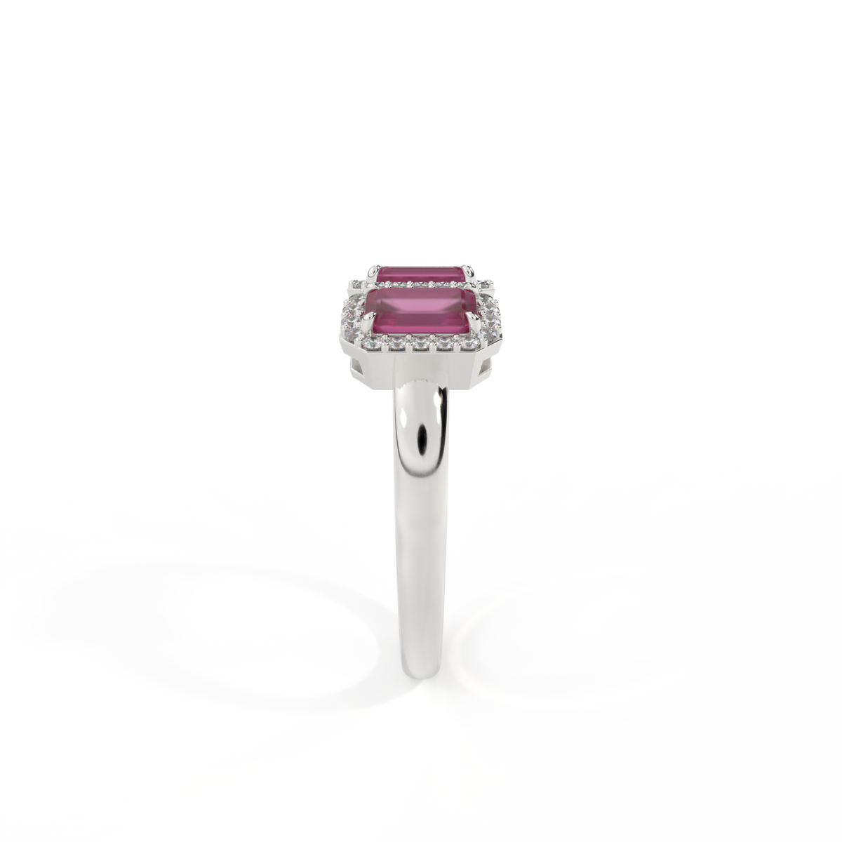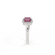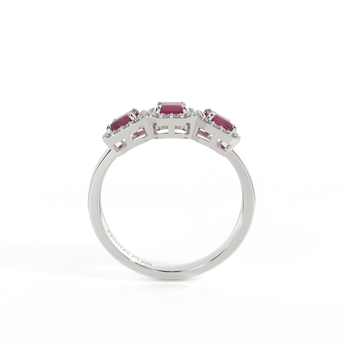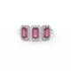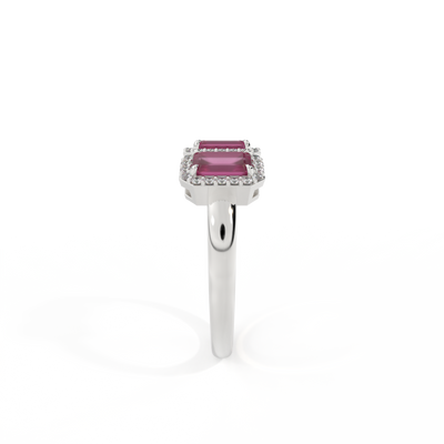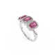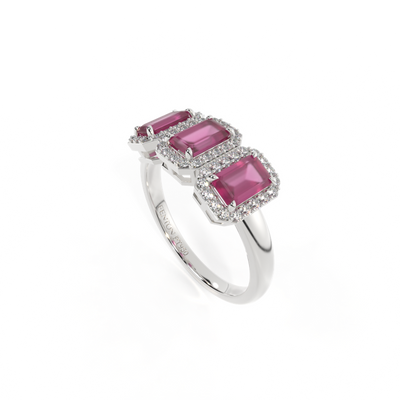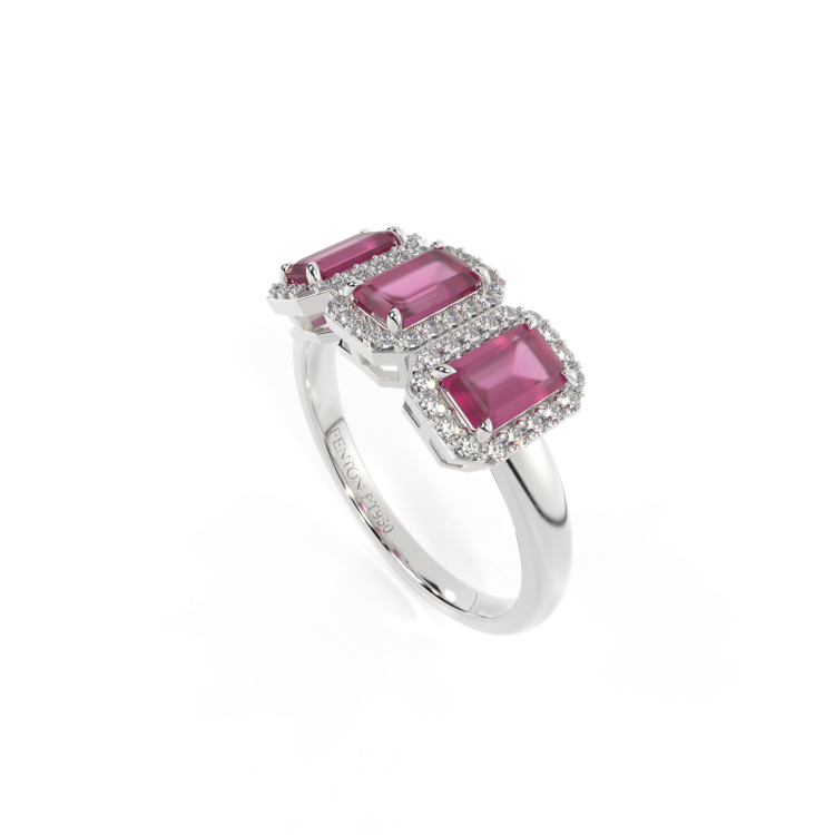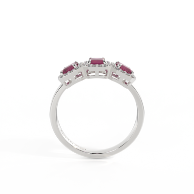 This low set, super wearable beauty, is reminiscent of a floral garland, one of the most universal symbols of love. Three Emerald cut Ruby stones are surrounded by diamond halos, each stone is completely unique.