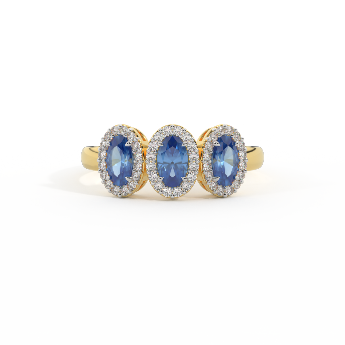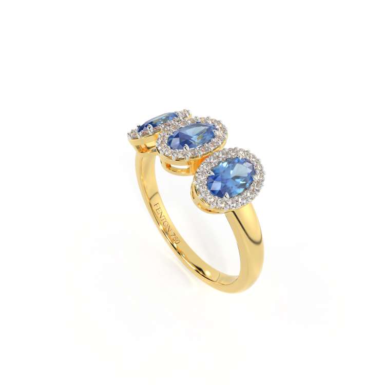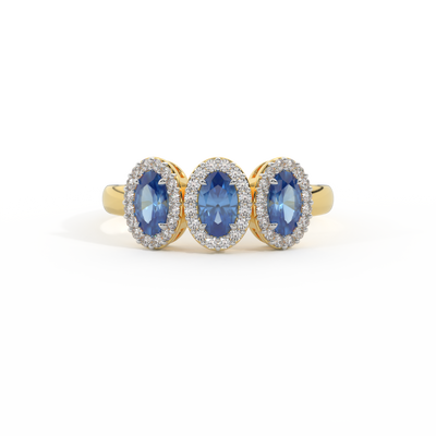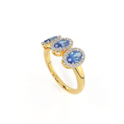 This low set, super wearable beauty, is reminiscent of a floral garland, one of the most universal symbols of love. Three Oval cut Blue Sapphire stones are surrounded by diamond halos, each stone is completely unique.