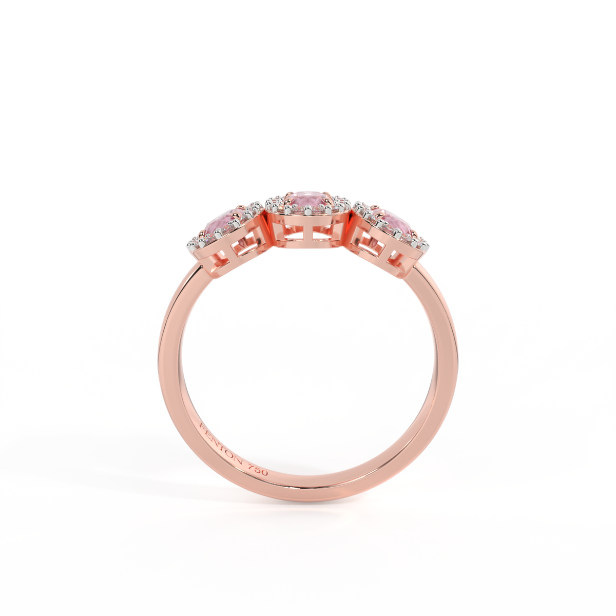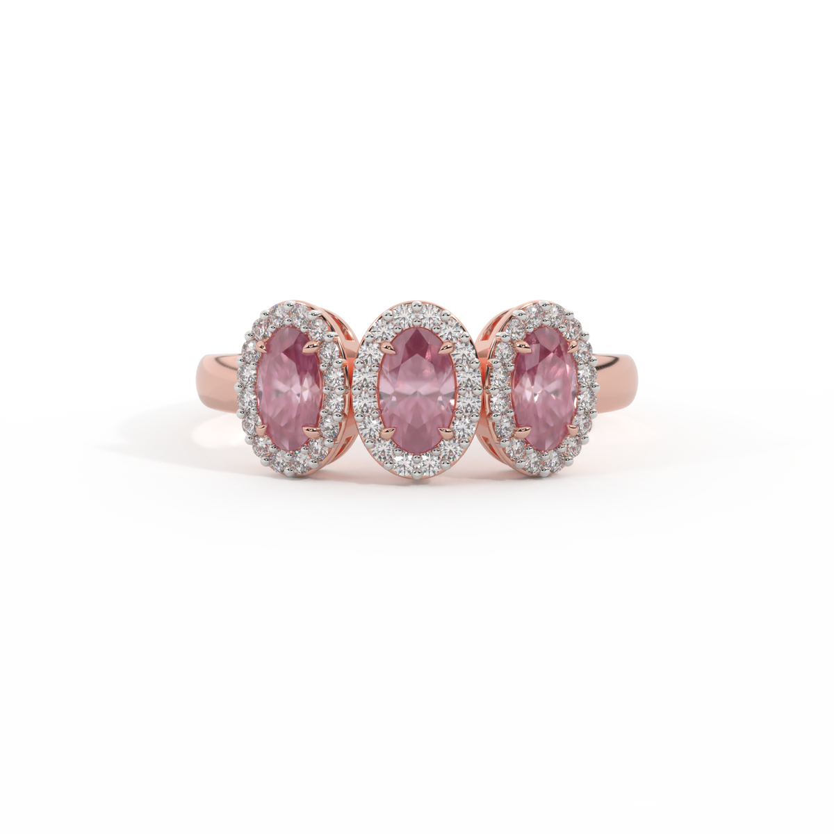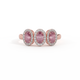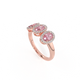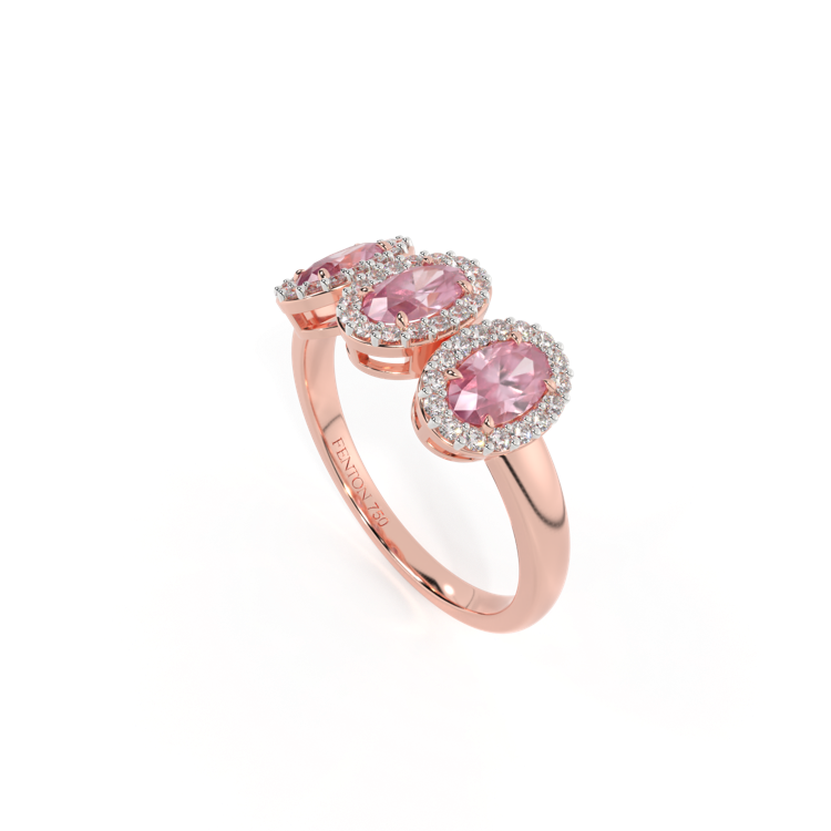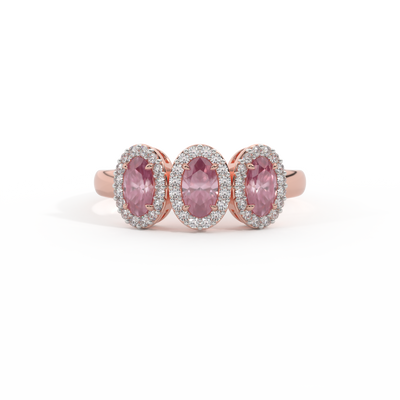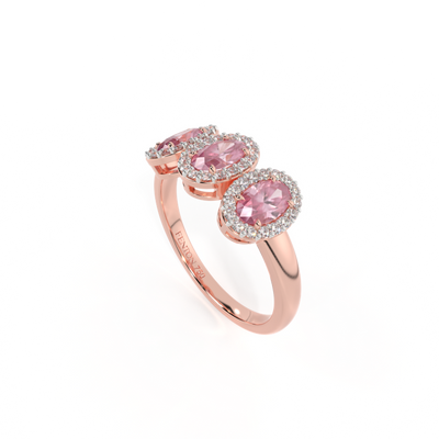 This low set, super wearable beauty, is reminiscent of a floral garland, one of the most universal symbols of love. Three Oval cut Pink Sapphire stones are surrounded by diamond halos, each stone is completely unique.