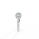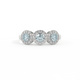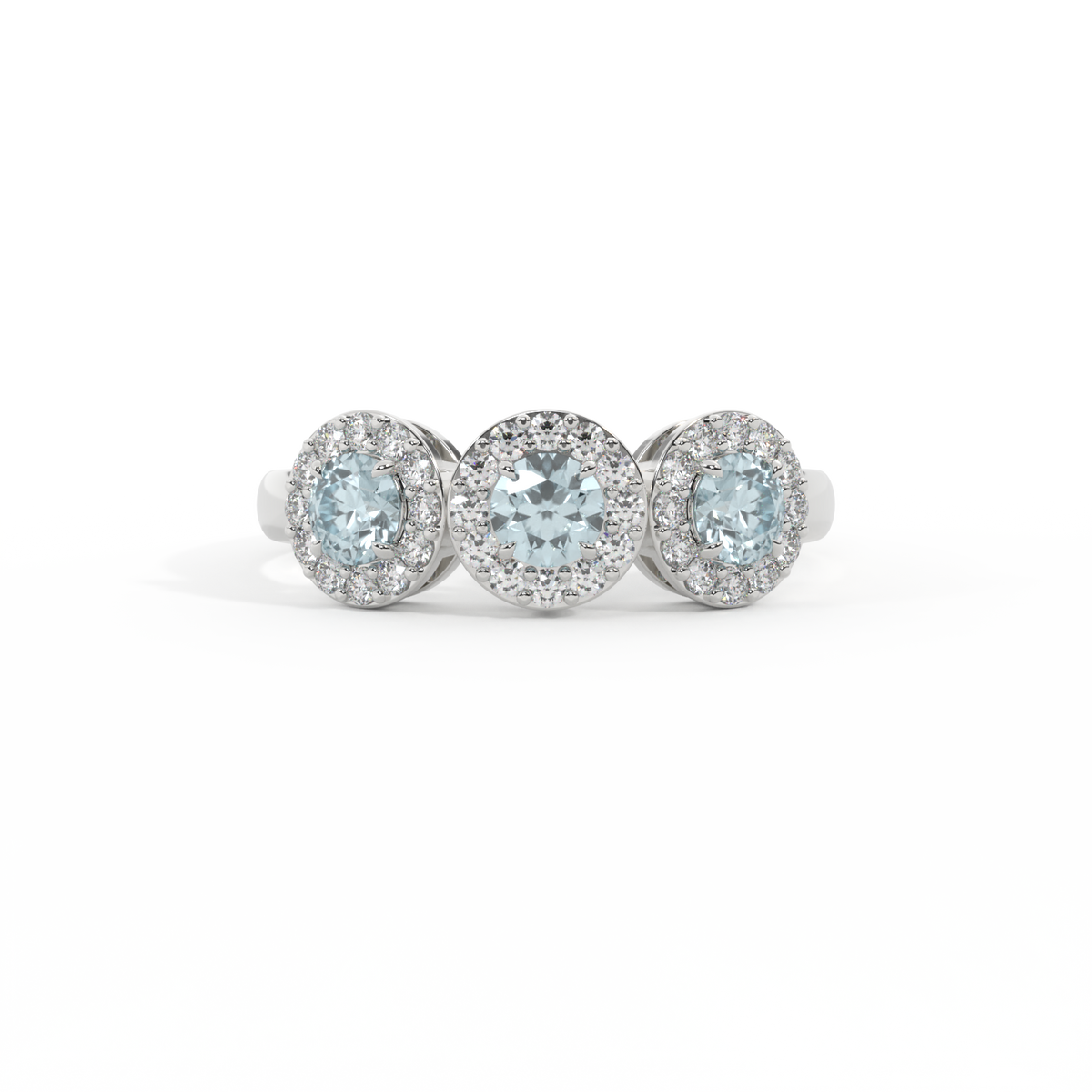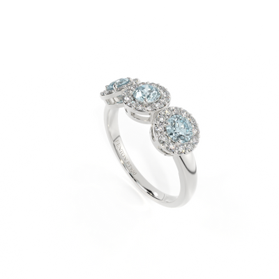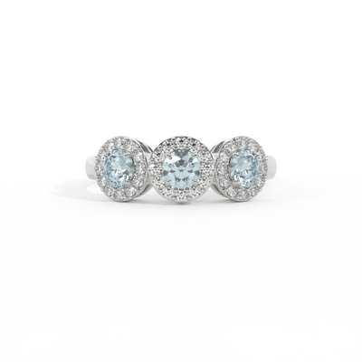 This low set, super wearable beauty, is reminiscent of a floral garland, one of the most universal symbols of love. Three Round cut Aquamarine stones are surrounded by diamond halos, each stone is completely unique.