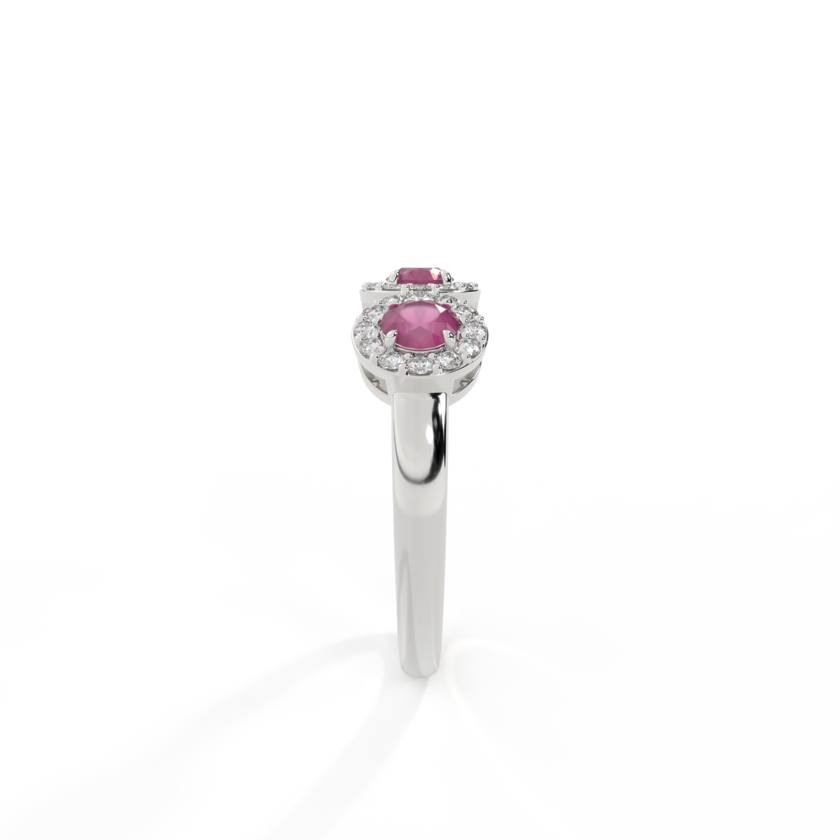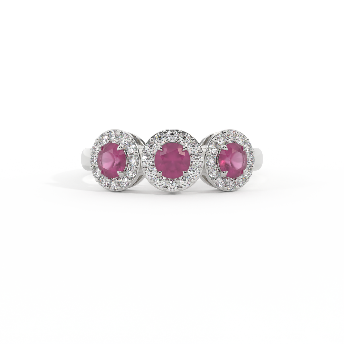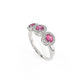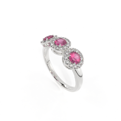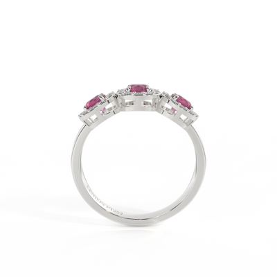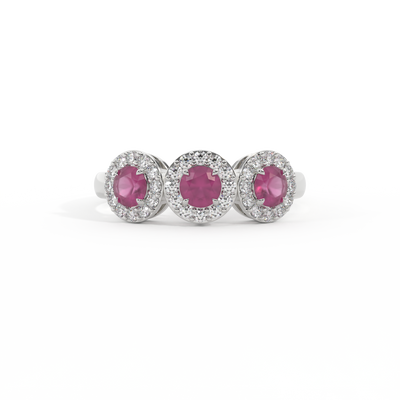 This low set, super wearable beauty, is reminiscent of a floral garland, one of the most universal symbols of love. Three Round cut Ruby stones are surrounded by diamond halos, each stone is completely unique.
