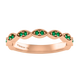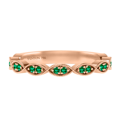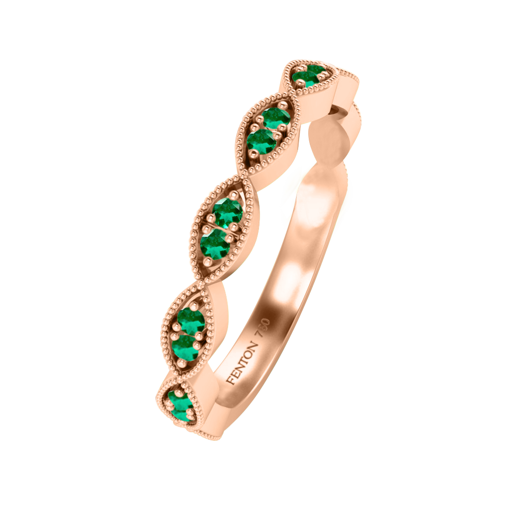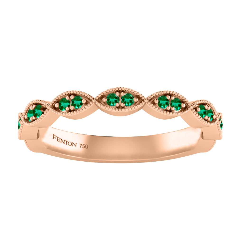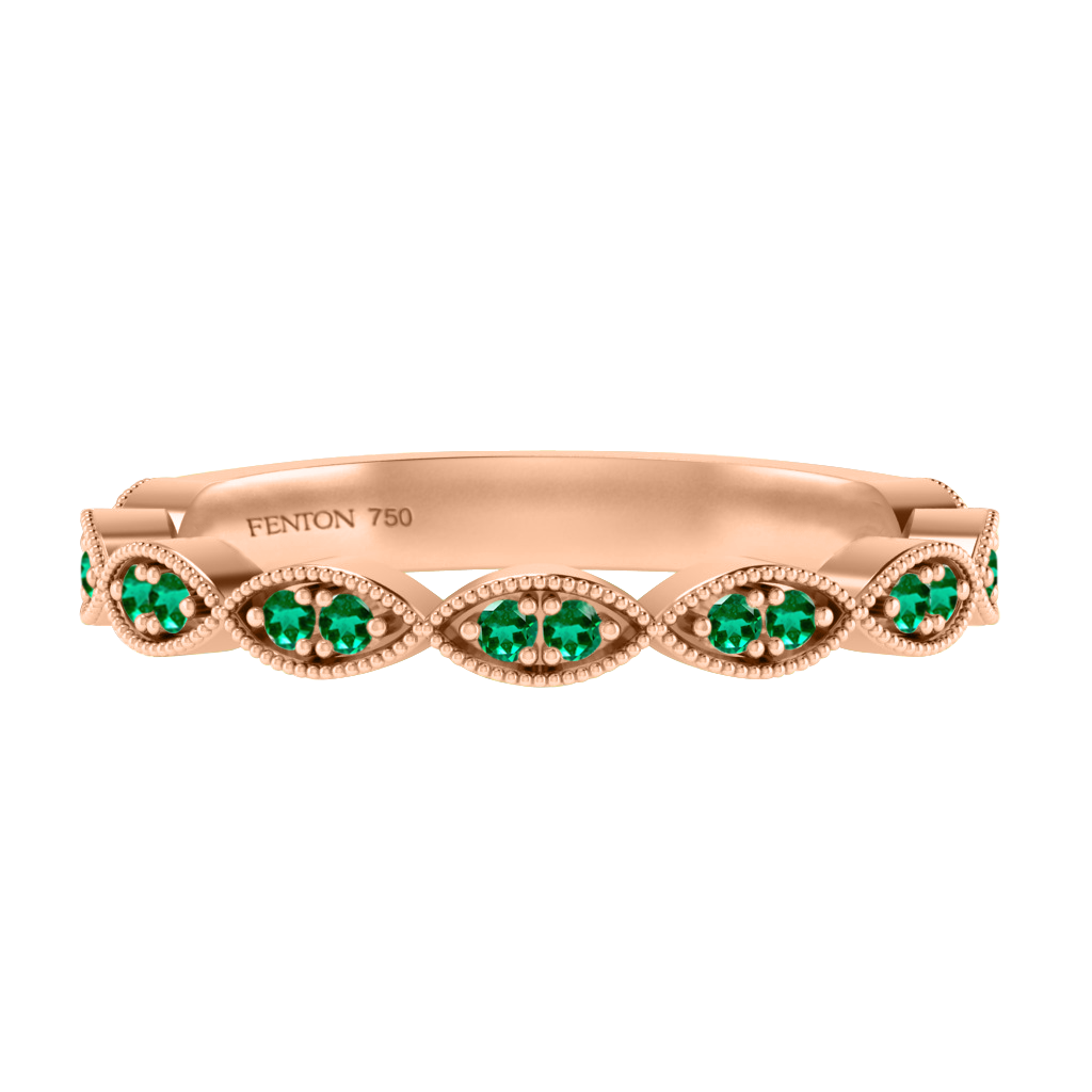 Inspired by the laurel wreaths worn by Roman victors, the Laurel band is a contemporary and playful jewellery choice to stand out from the crowd. It's a beautiful ring worn solo or as a classic wedding ring, stacked with your engagement ring. The Laurel band is delicately crafted from solid 18K Rose Gold holding approximately 0.15cts of round-cut Emerald stones. For extra comfort and durability, your stones cover 3/4 of your your overall band.