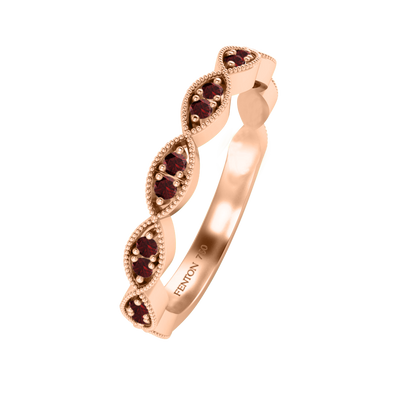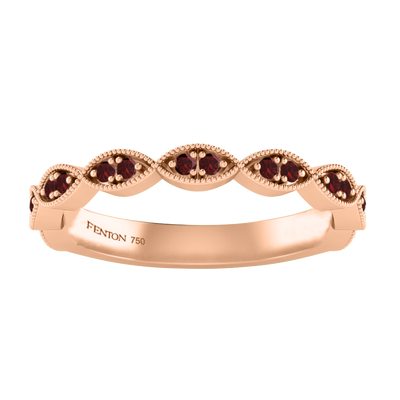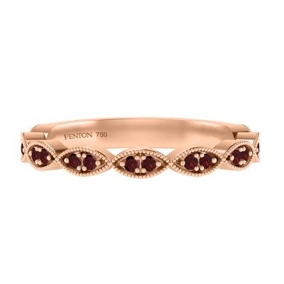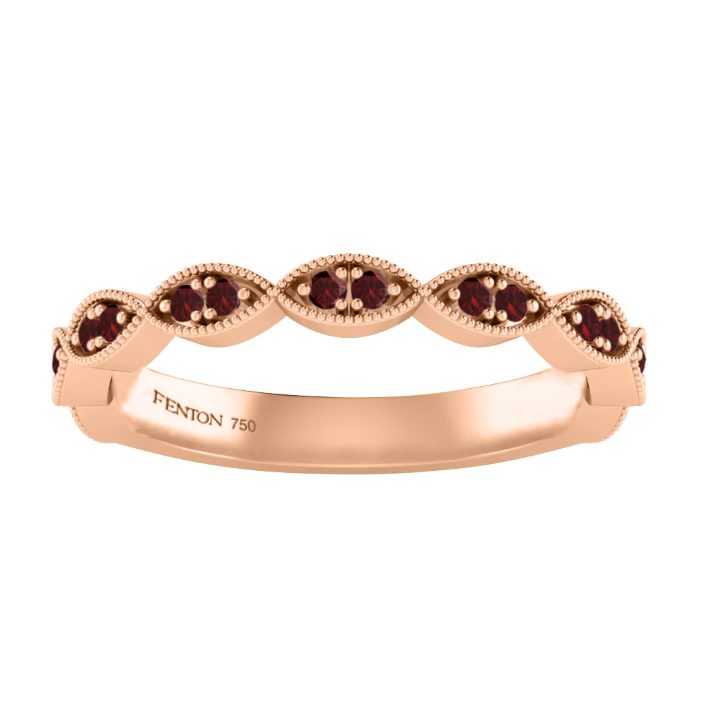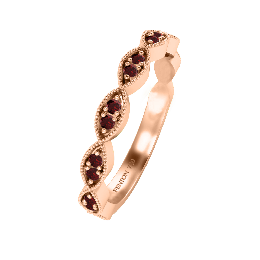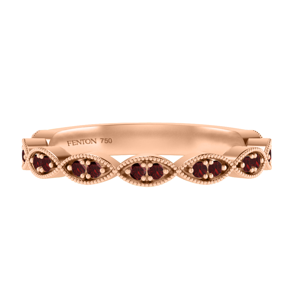 Inspired by the laurel wreaths worn by Roman victors, the Laurel band is a contemporary and playful jewellery choice to stand out from the crowd. It's a beautiful ring worn solo or as a classic wedding ring, stacked with your engagement ring. The Laurel band is delicately crafted from solid 18K Rose Gold holding approximately 0.15cts of round-cut Garnet stones. For extra comfort and durability, your stones cover 3/4 of your your overall band.