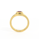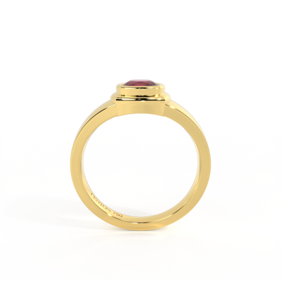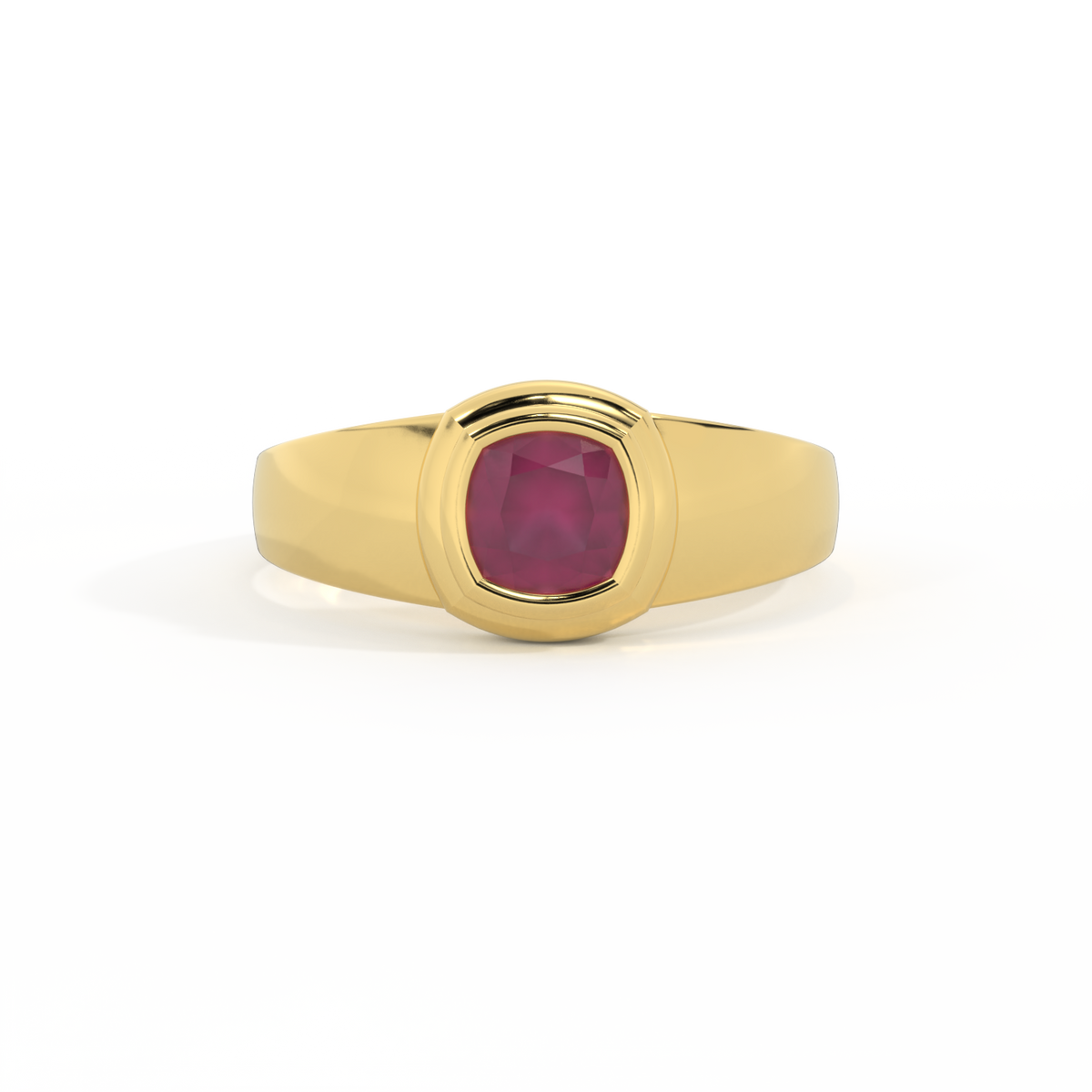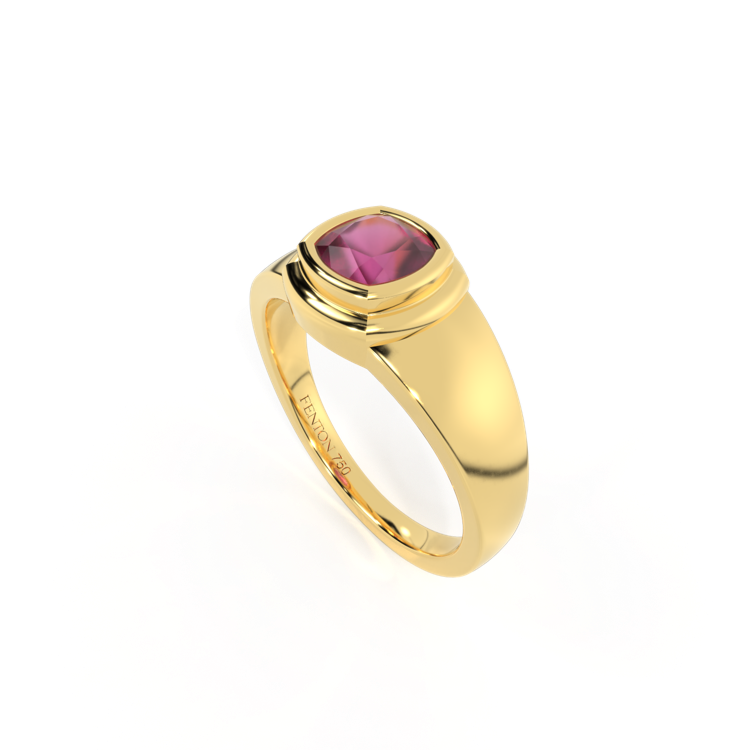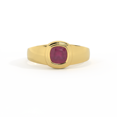 This iconic piece is set with a Cushion cut Ruby, which sits slightly proud above the 18K Yellow Gold band in a stepped bezel setting. The shoulders taper outwards towards the centre, with a rounded shank for maximum comfort. A modern heirloom for the everyday.