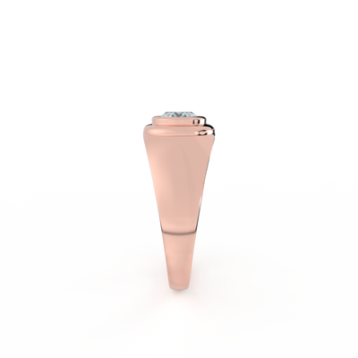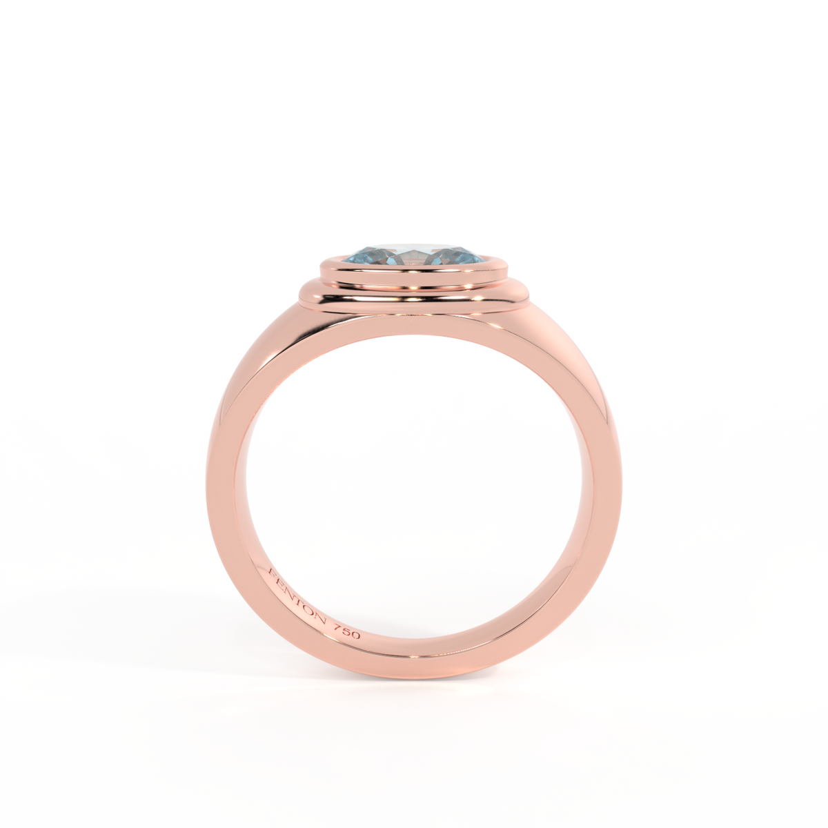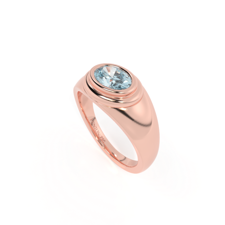 This iconic piece is set with a Oval cut Aquamarine, which sits slightly proud above the 18K Rose Gold band in a stepped bezel setting. The shoulders taper outwards towards the centre, with a rounded shank for maximum comfort. A modern heirloom for the everyday.
