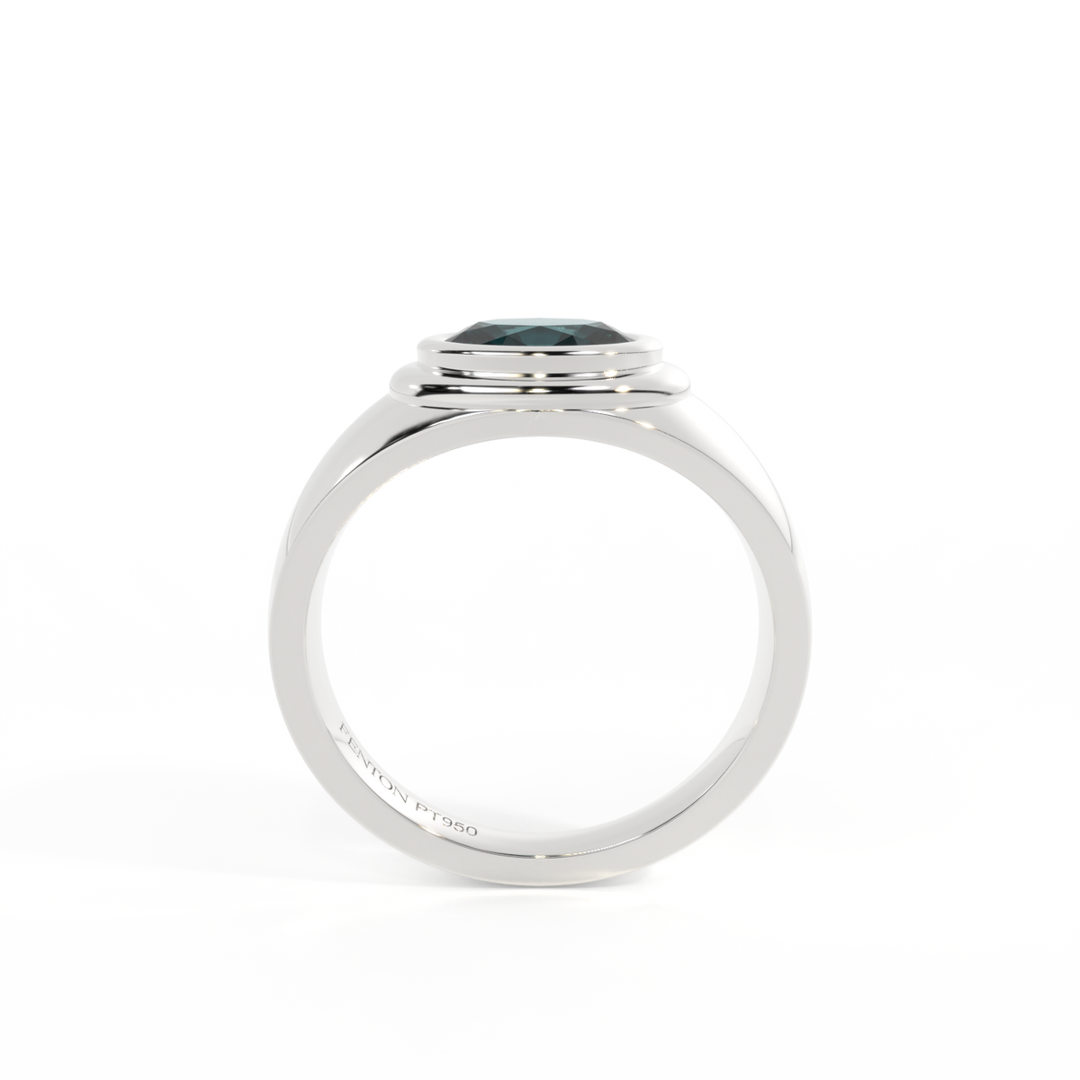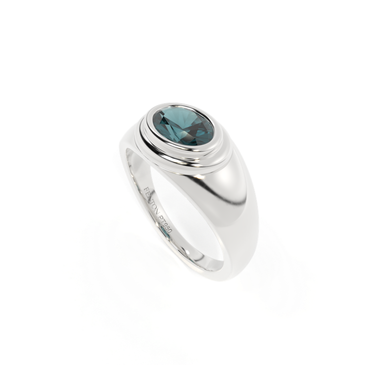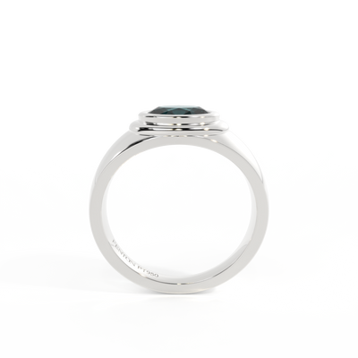 This iconic piece is set with a Oval cut Teal Sapphire, which sits slightly proud above the 18K White Gold band in a stepped bezel setting. The shoulders taper outwards towards the centre, with a rounded shank for maximum comfort. A modern heirloom for the everyday.