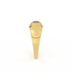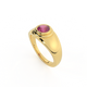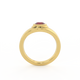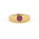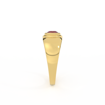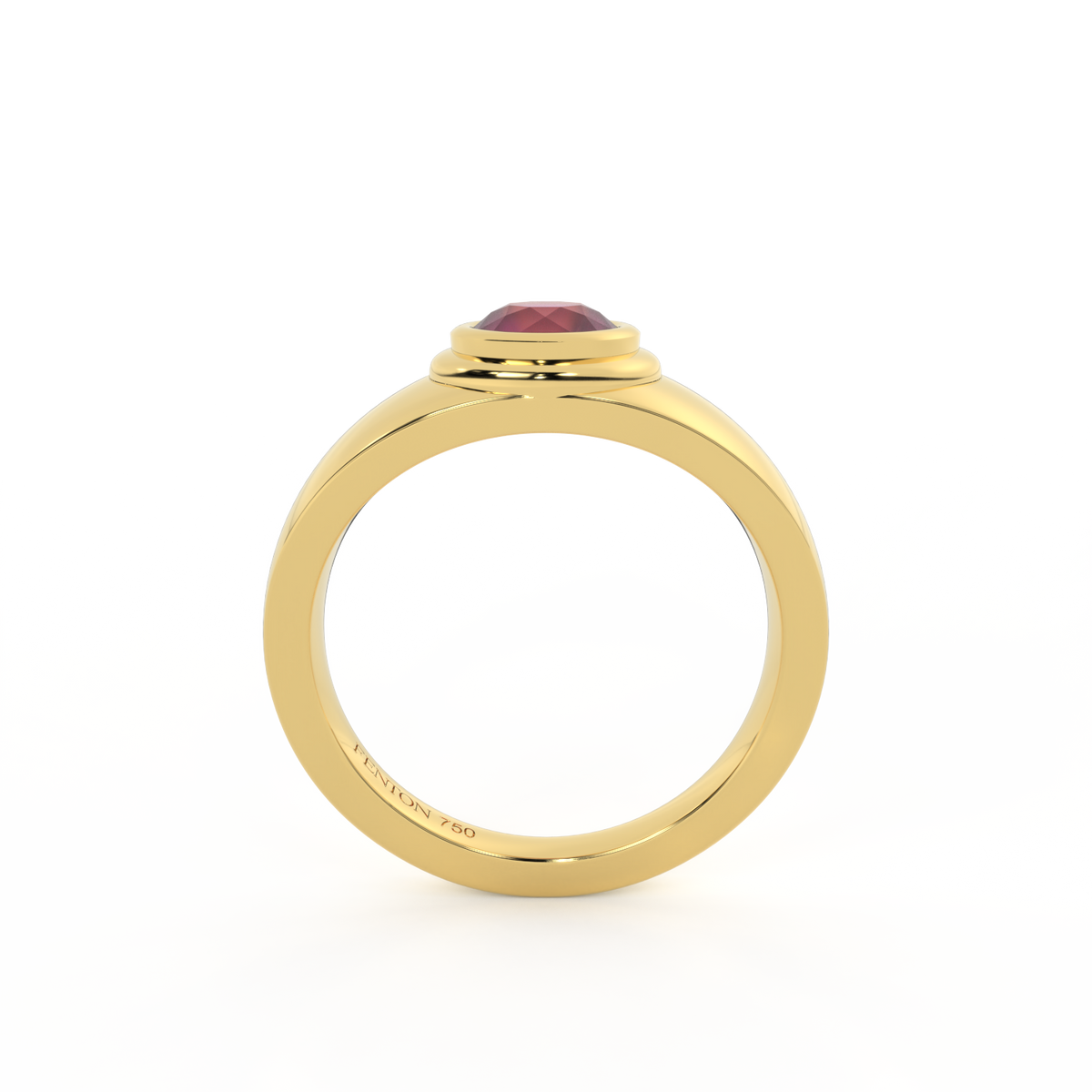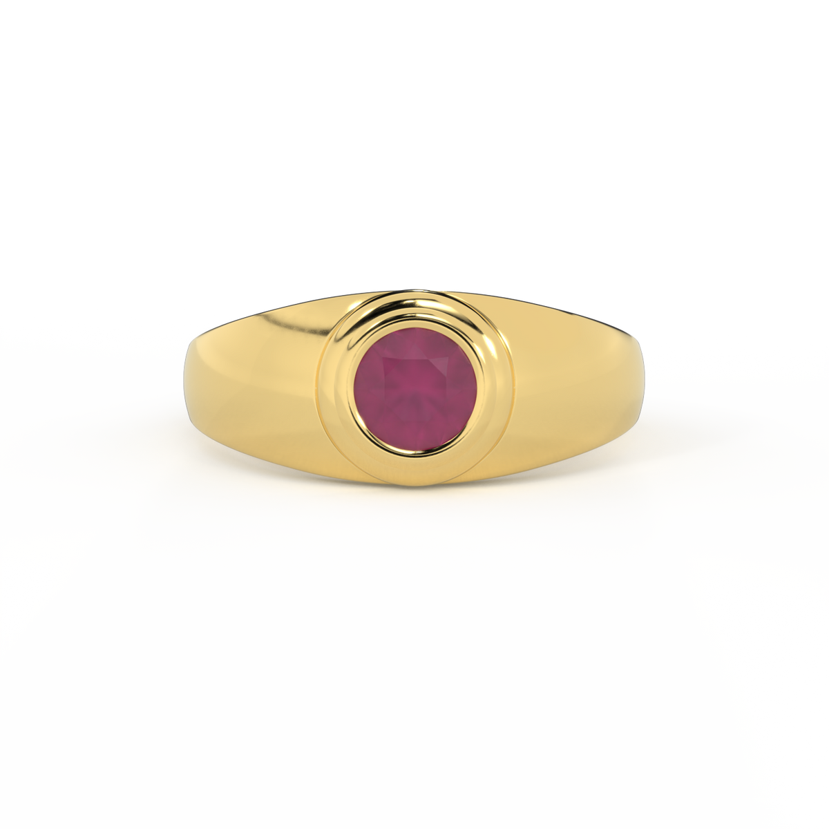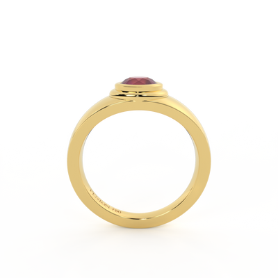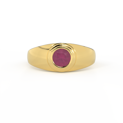 This iconic piece is set with a Round cut Ruby, which sits slightly proud above the 18K Yellow Gold band in a stepped bezel setting. The shoulders taper outwards towards the centre, with a rounded shank for maximum comfort. A modern heirloom for the everyday.