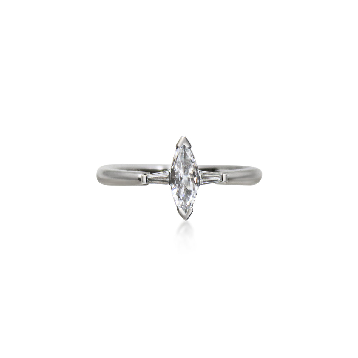 Single-stone diamond ring, set with a marquise-shaped diamonds weighing approx. 0.30ct with tapering baguette-cut diamond shoulders, to a plain 18ct white gold hoop, size K