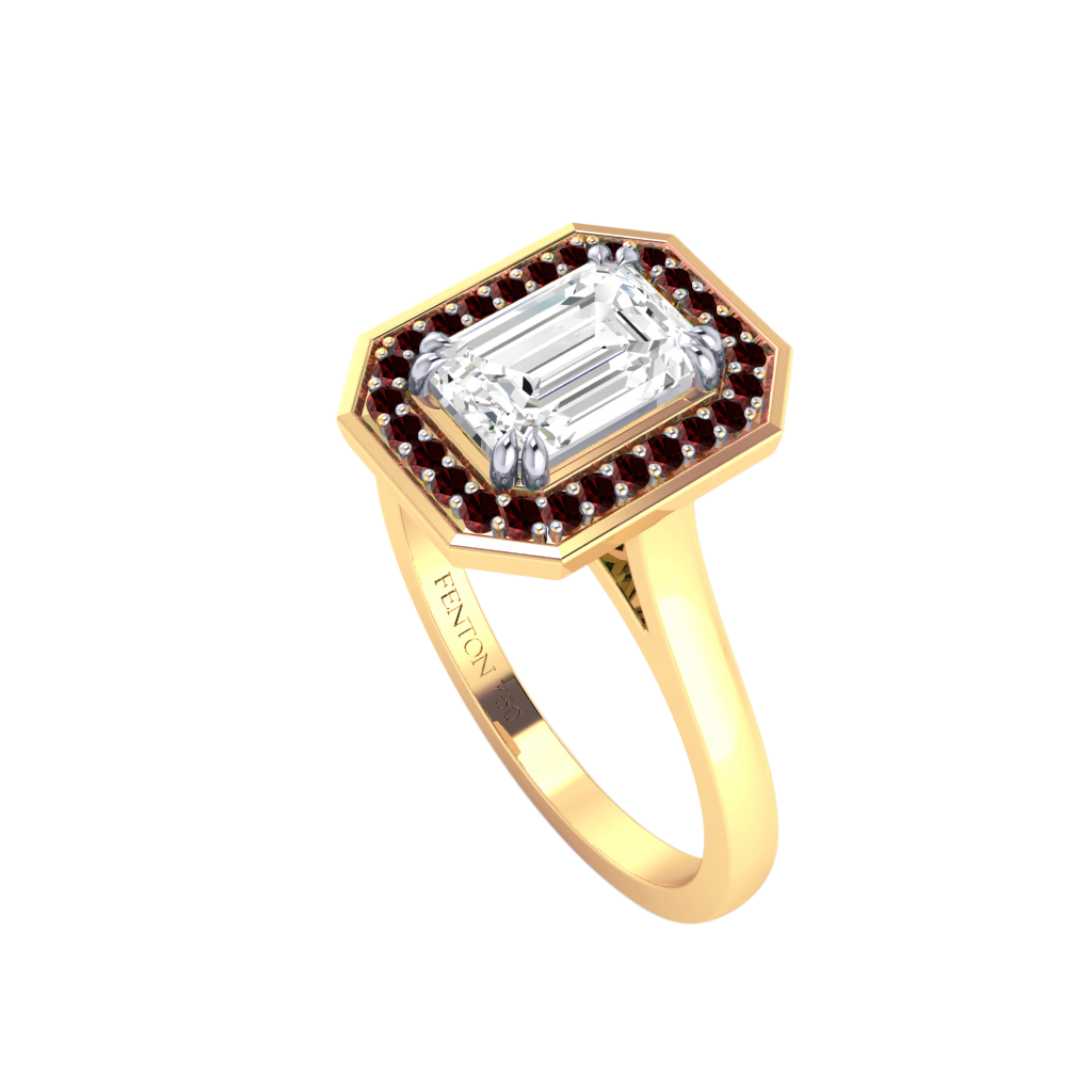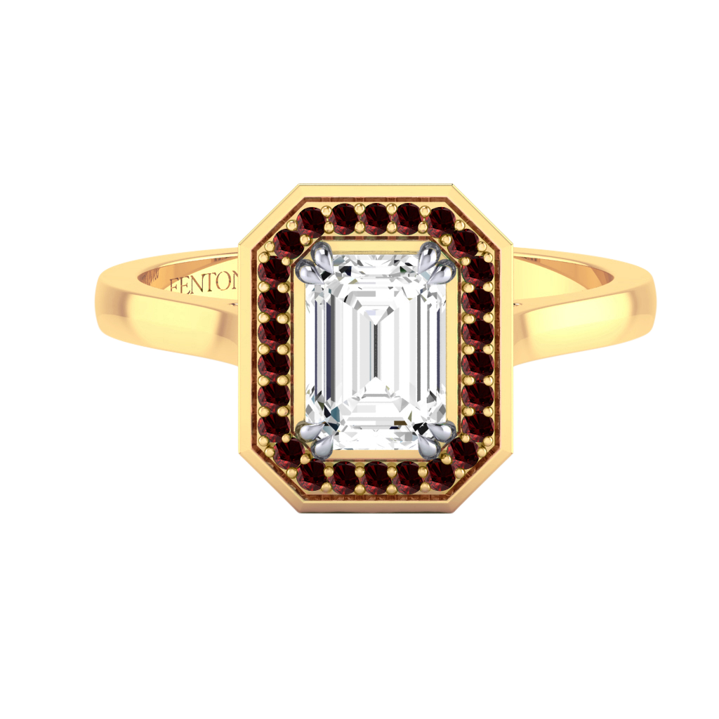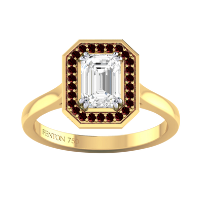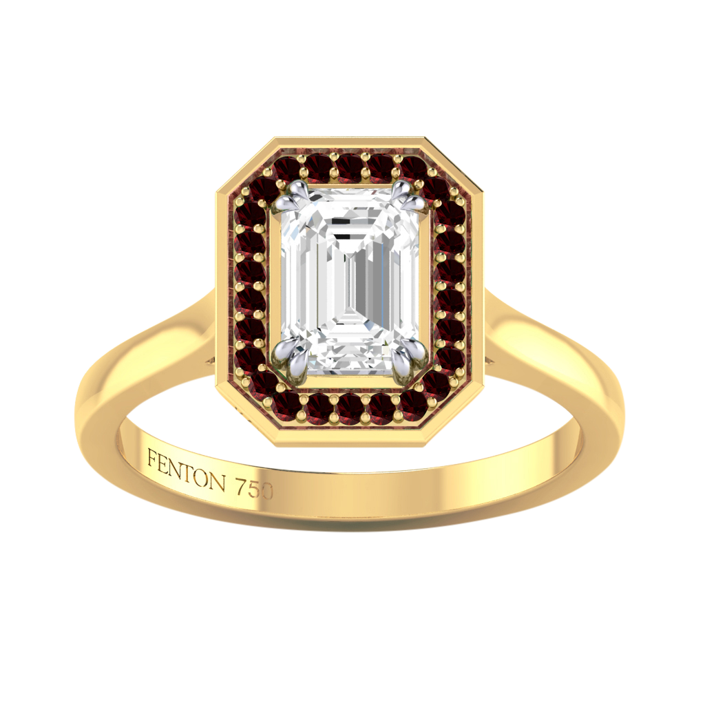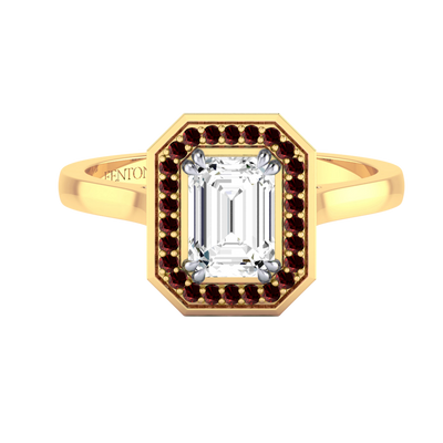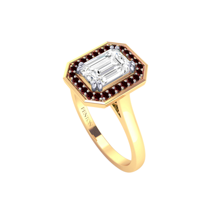 Lab Grown Solar Diamond Deco Emerald Cut Diamond and Garnet 18k Yellow Gold Ring