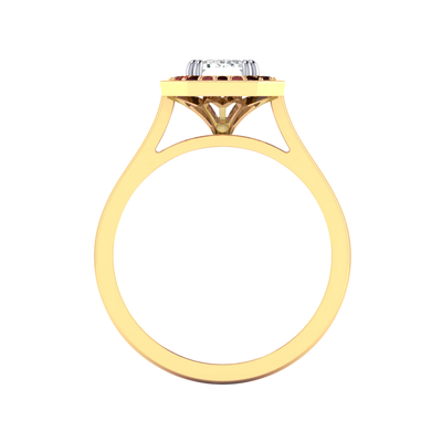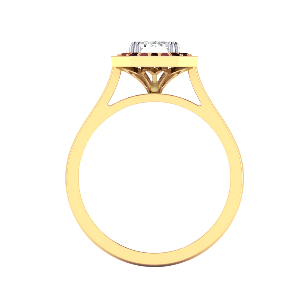 Your sparkling Solar Diamond has a GH V/S quality rating and is framed by a halo of Garnet accent stones and set in bezel style. Your 18K Yellow Gold Solar Diamond centre stone sits proudly on wed-fit shoulders to allow your wedding band to sit flush.