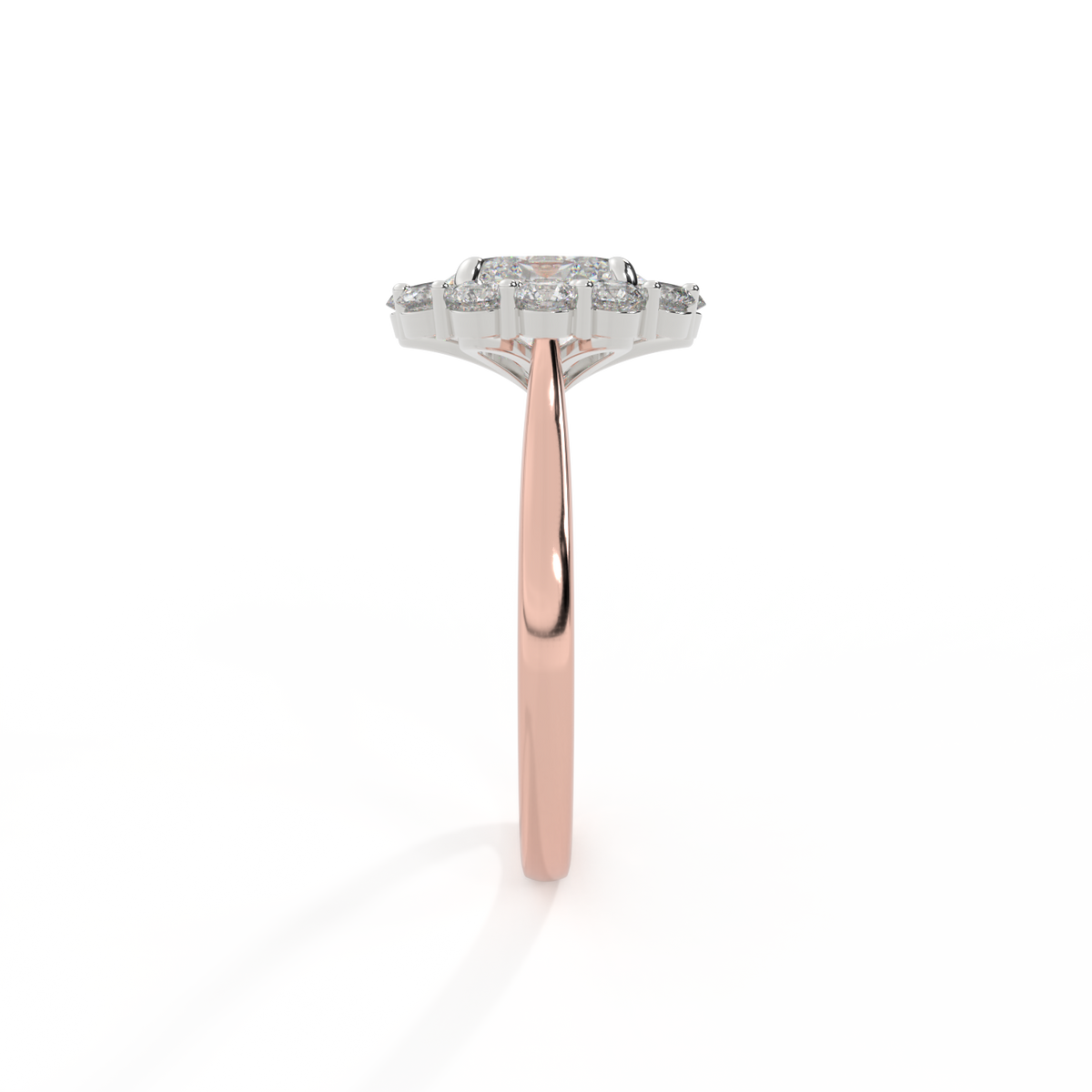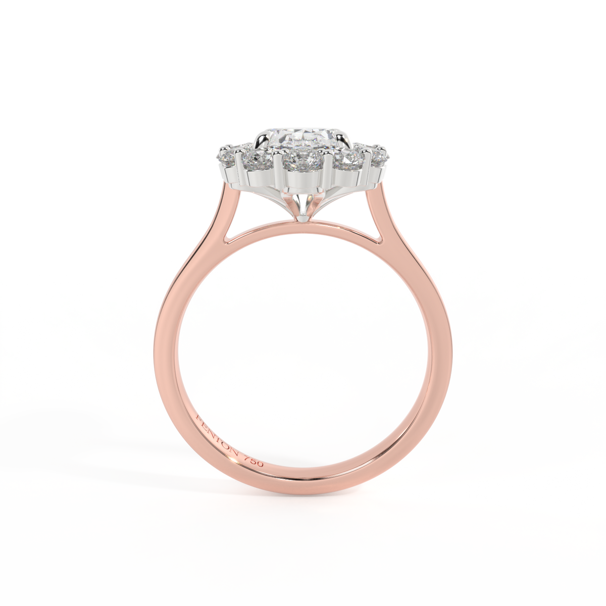 Your glistening Oval Solar Diamond has a GH V/S quality rating and is framed on either side by a trefoil cluster of three 1.8mm round brilliant cut Diamond stones, each securely held into place in a claw setting. The design draws the eye to the glistening Solar Diamond centre stone, sitting proudly in a classic open gallery setting crafted from solid 18K Rose Gold. The open setting of this design allows the light to reflect in all directions, creating a lustrous and sparkling look.