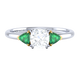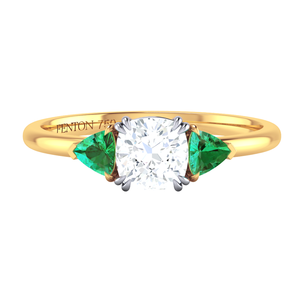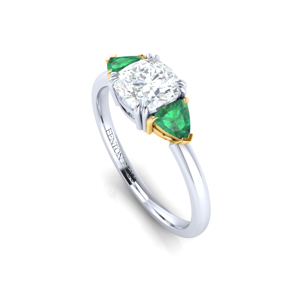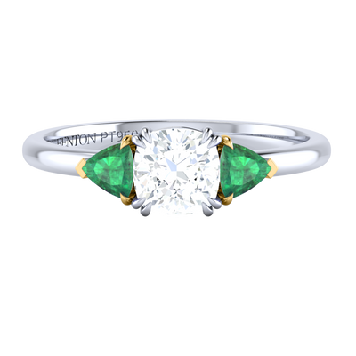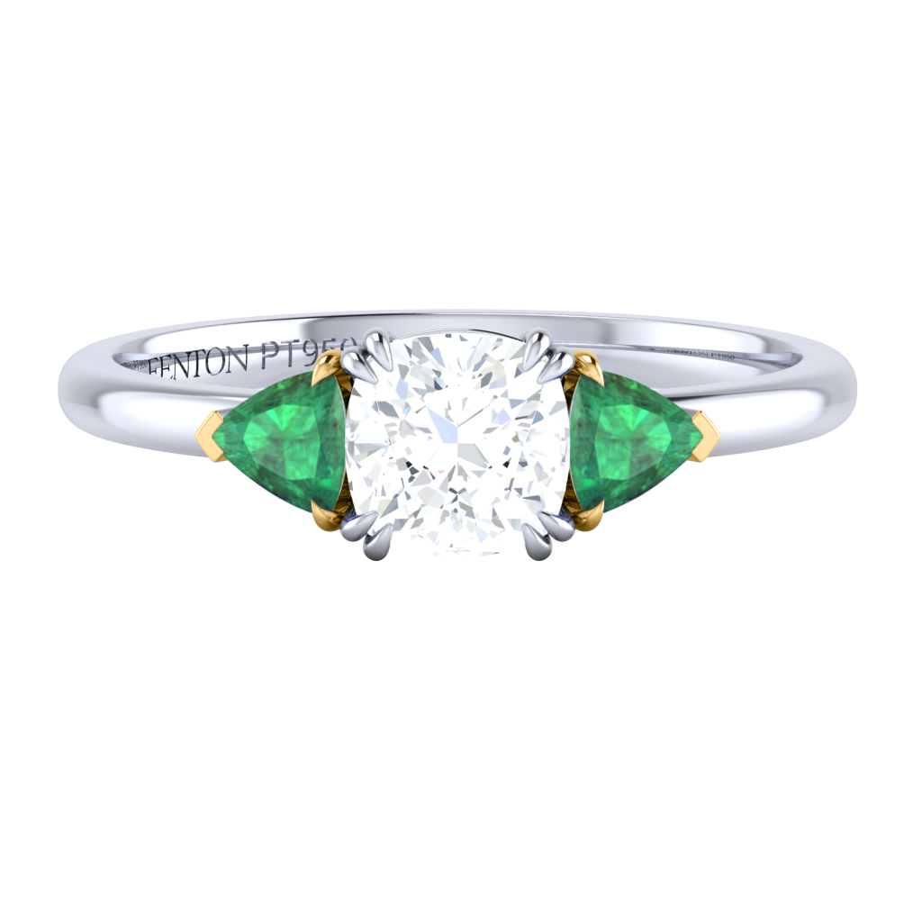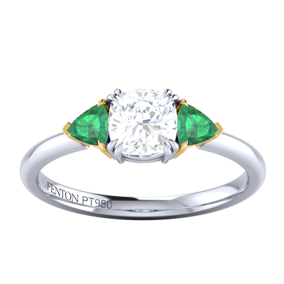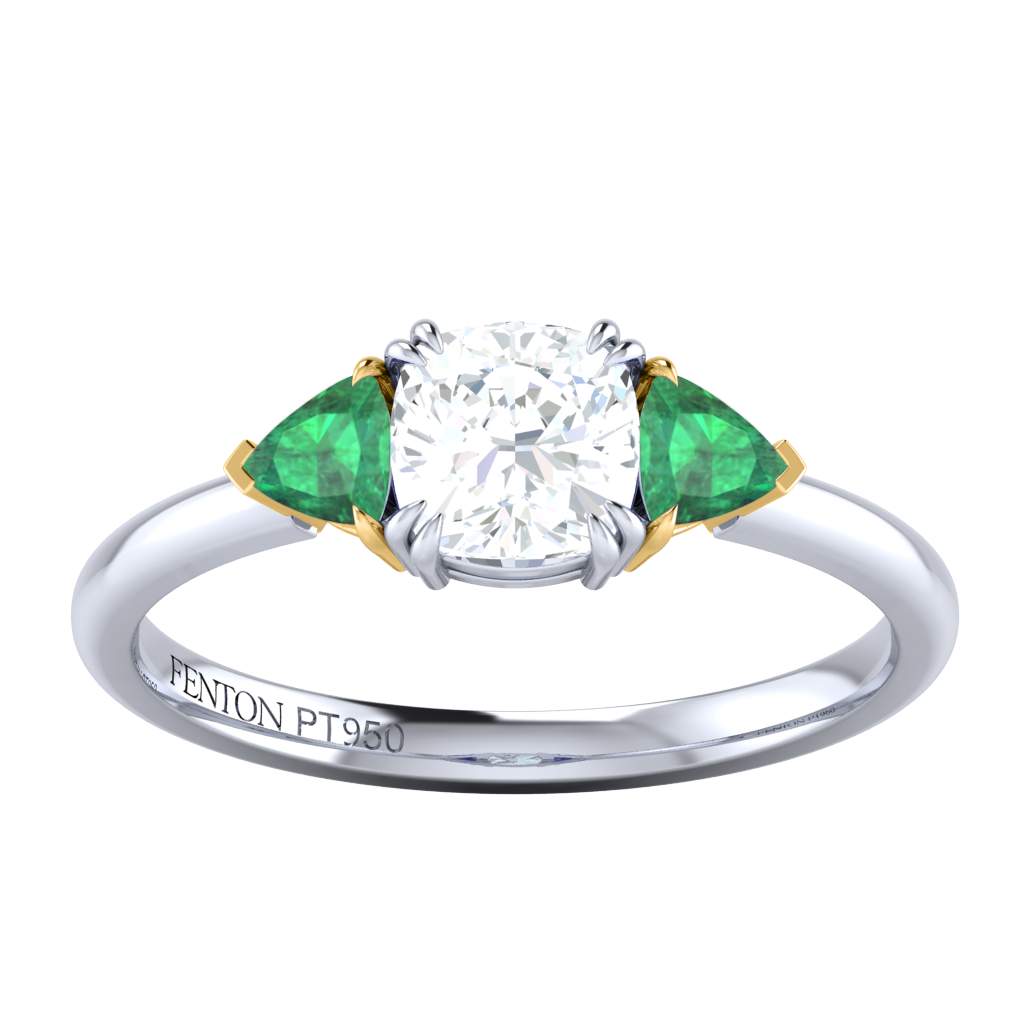 Proof that three isn't always a crowd, our Solar Diamond Trilogy Ring unites a sparkling Solar Diamond centre stone with two surrounding Emerald each set in a secure four single- or double claw setting and complimenting the exquisite sparkle of your Solar Diamond stone. Your Cushion Solar Diamond stone has a EF V/S quality rating and is set in a simple yet elegant gallery feeding smoothly into a sleek and simple Platinum band ranging from 1.90 - 2.20mm.