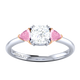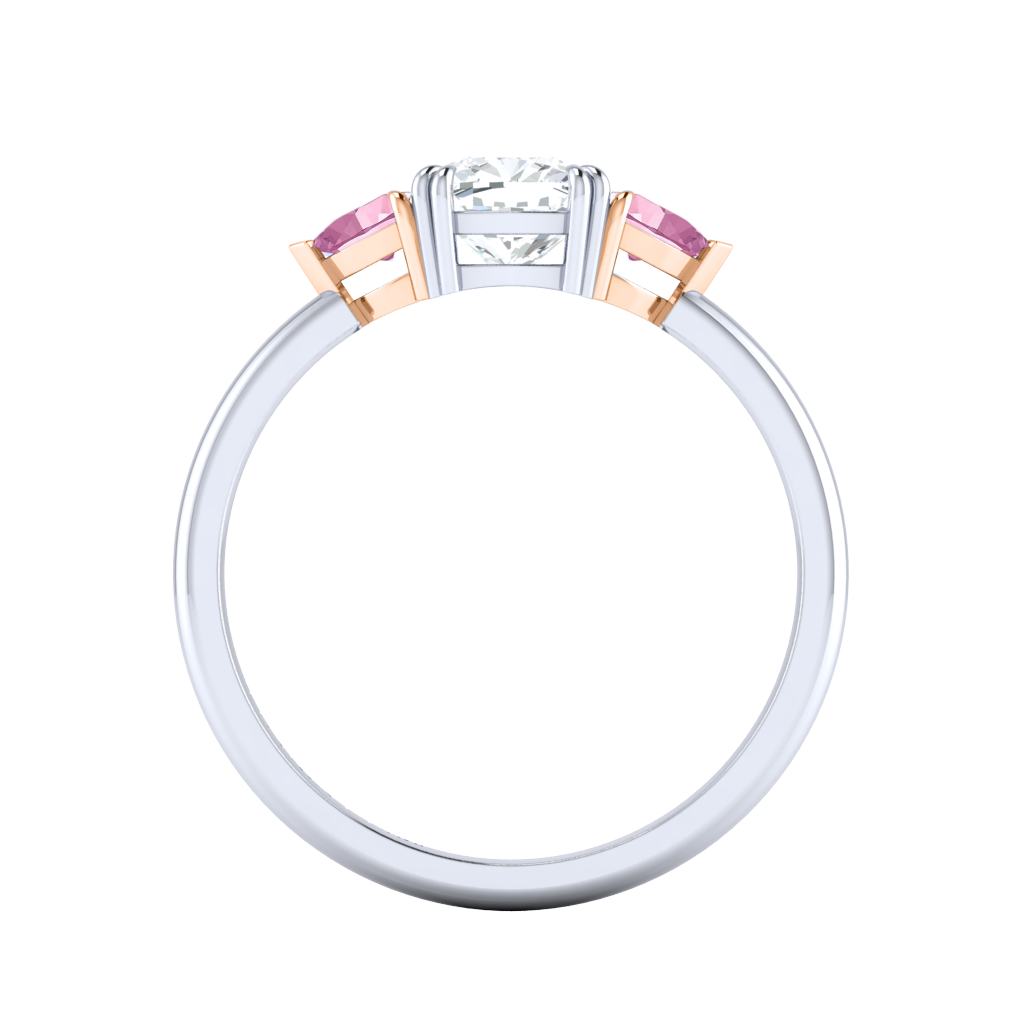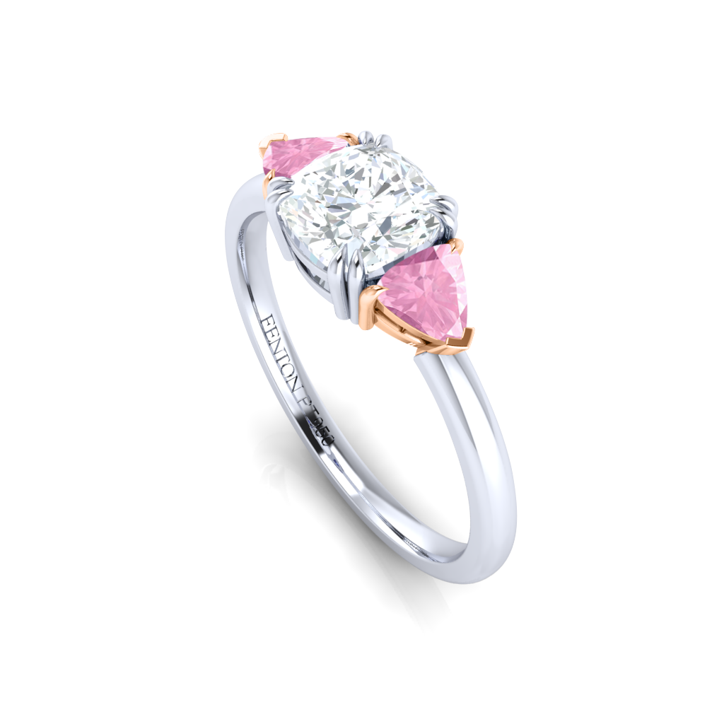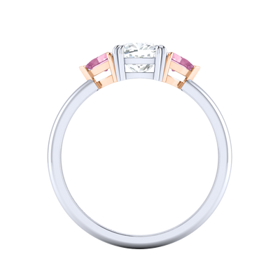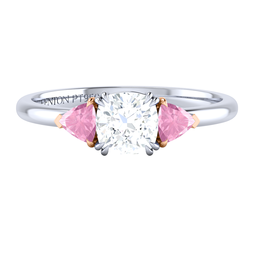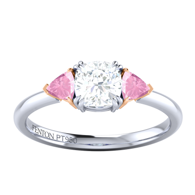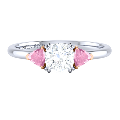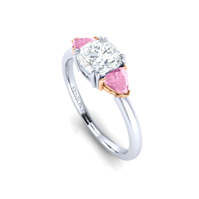 Lab Grown Solar Diamond Trilogy Cushion Cut Diamond and Pink Sapphire Platinum Ring