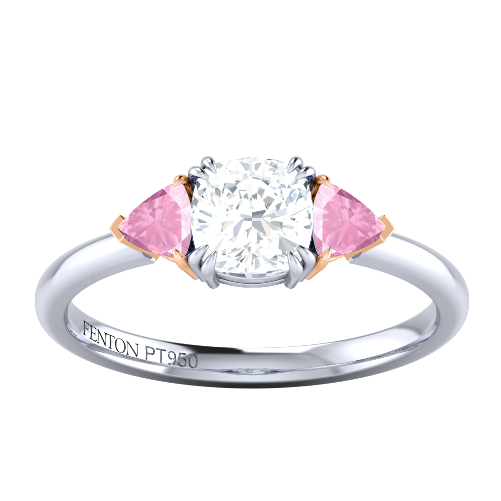 Proof that three isn't always a crowd, our Solar Diamond Trilogy Ring unites a sparkling Solar Diamond centre stone with two surrounding Pink Sapphire each set in a secure four single- or double claw setting and complimenting the exquisite sparkle of your Solar Diamond stone. Your Cushion Solar Diamond stone has a EF V/S quality rating and is set in a simple yet elegant gallery feeding smoothly into a sleek and simple Platinum band ranging from 1.90 - 2.20mm.