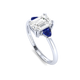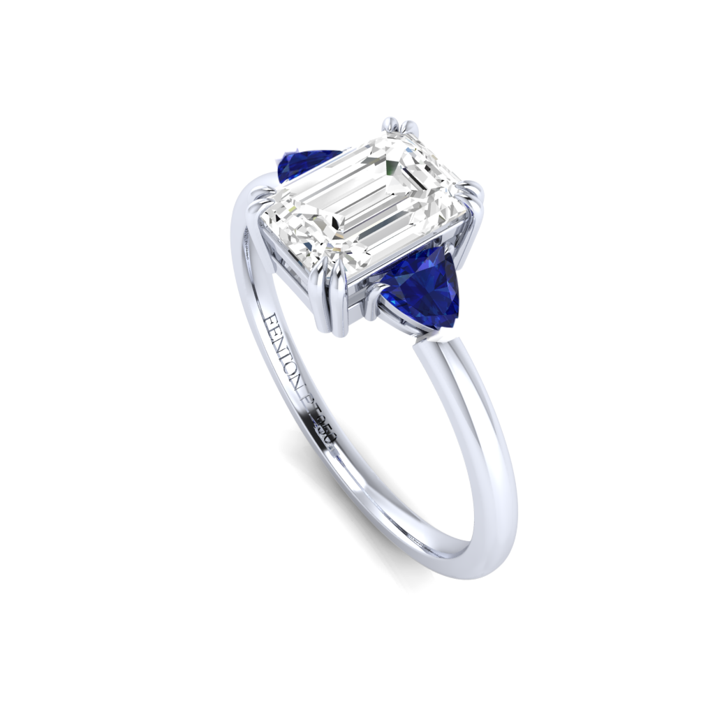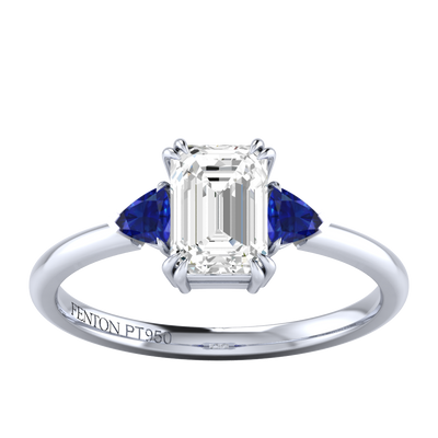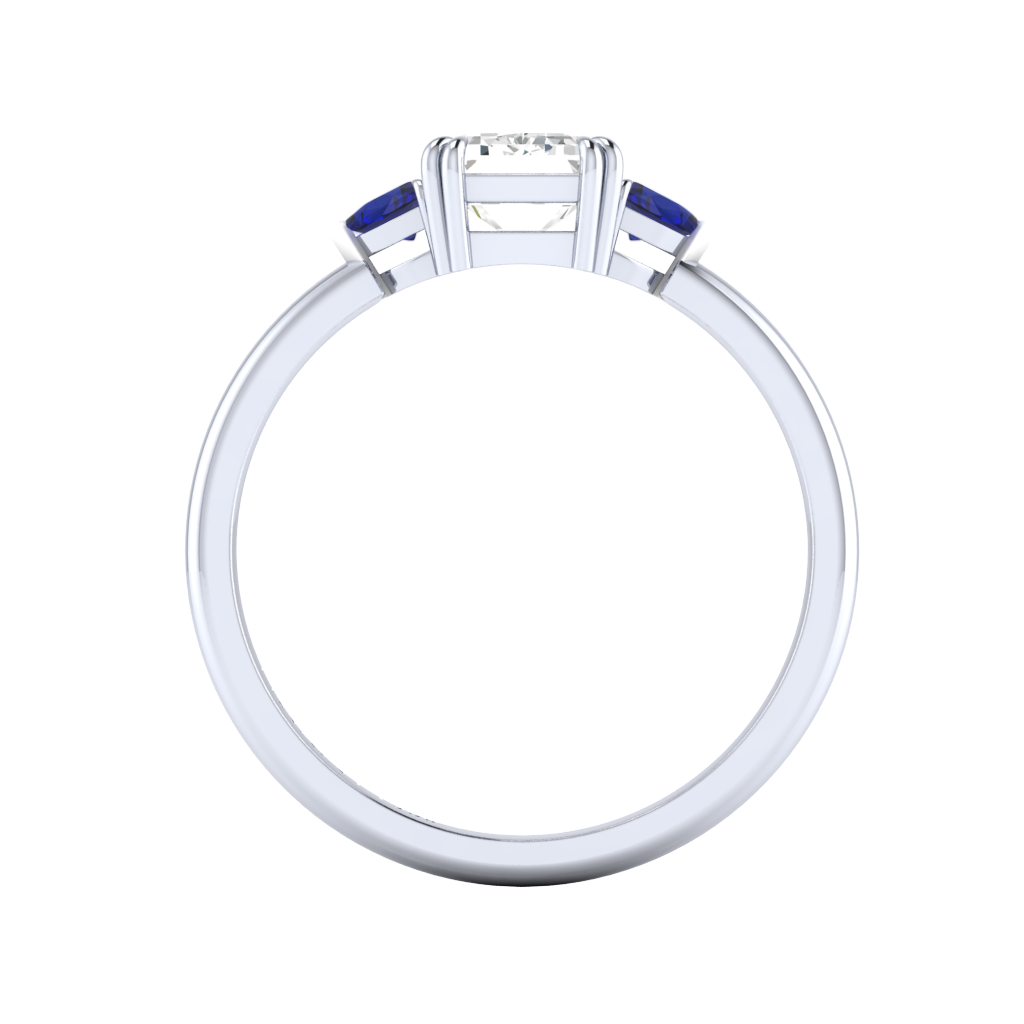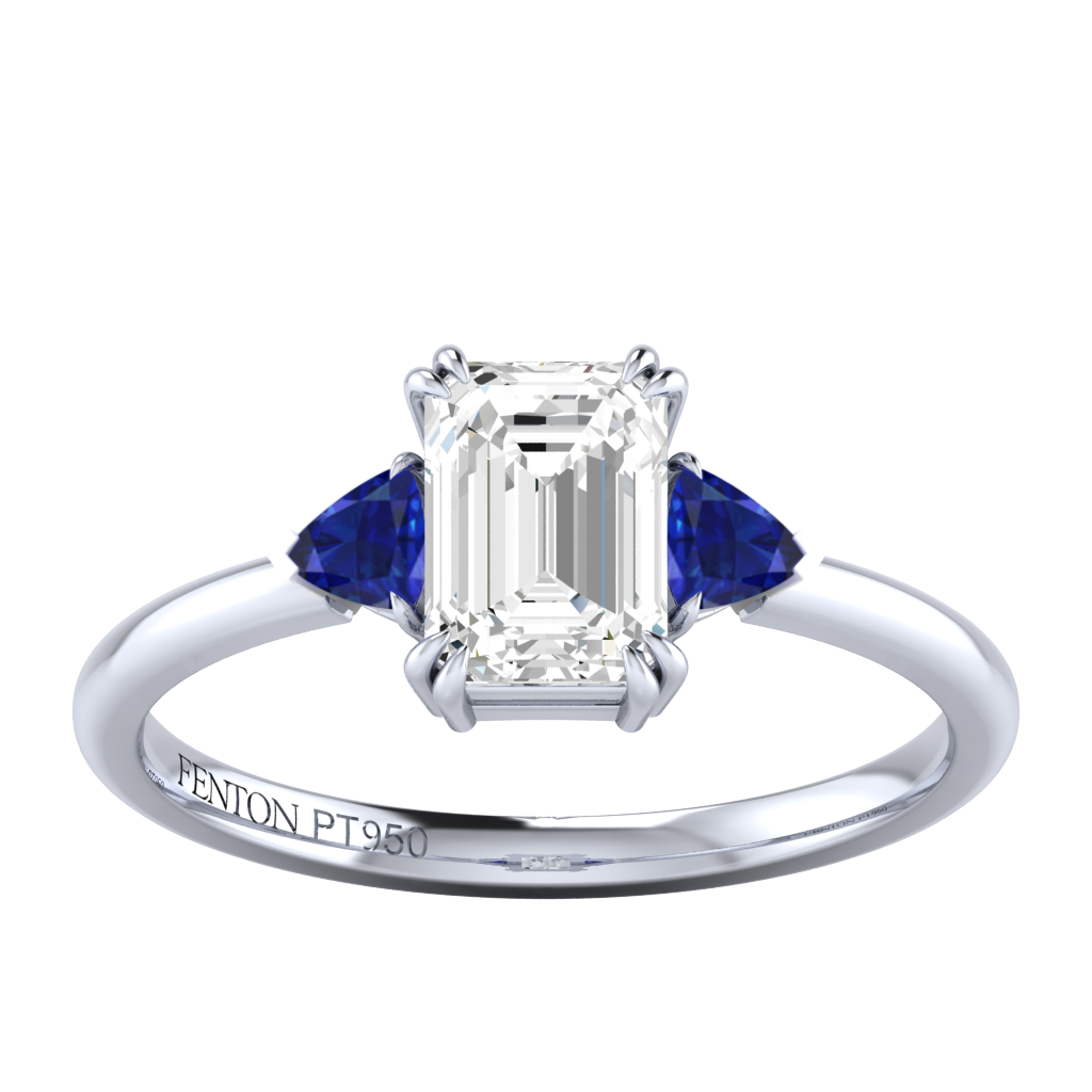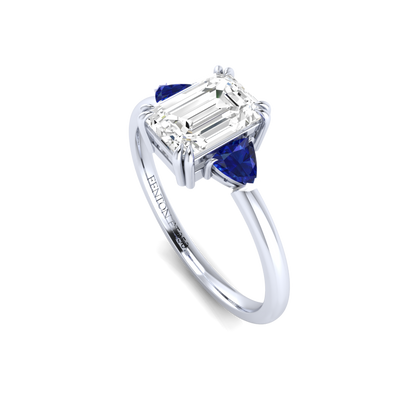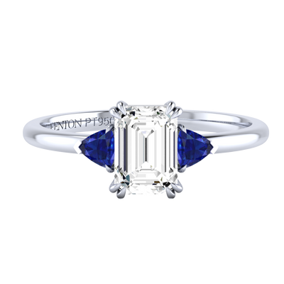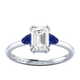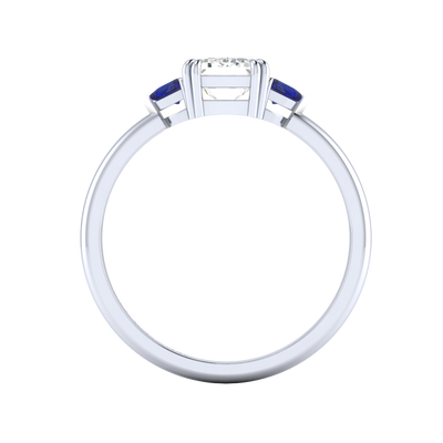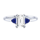 Lab Grown Solar Diamond Trilogy Emerald Cut Diamond and Blue Sapphire Platinum Ring
