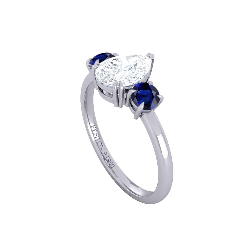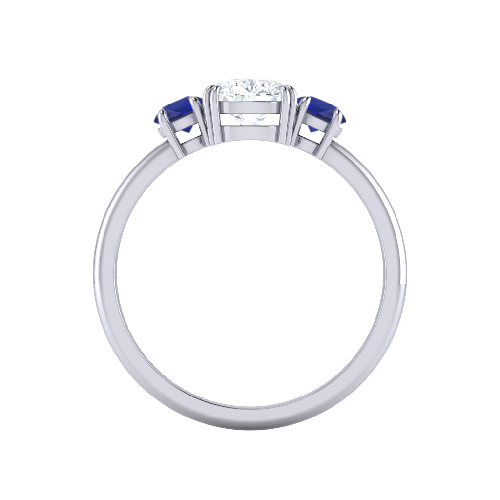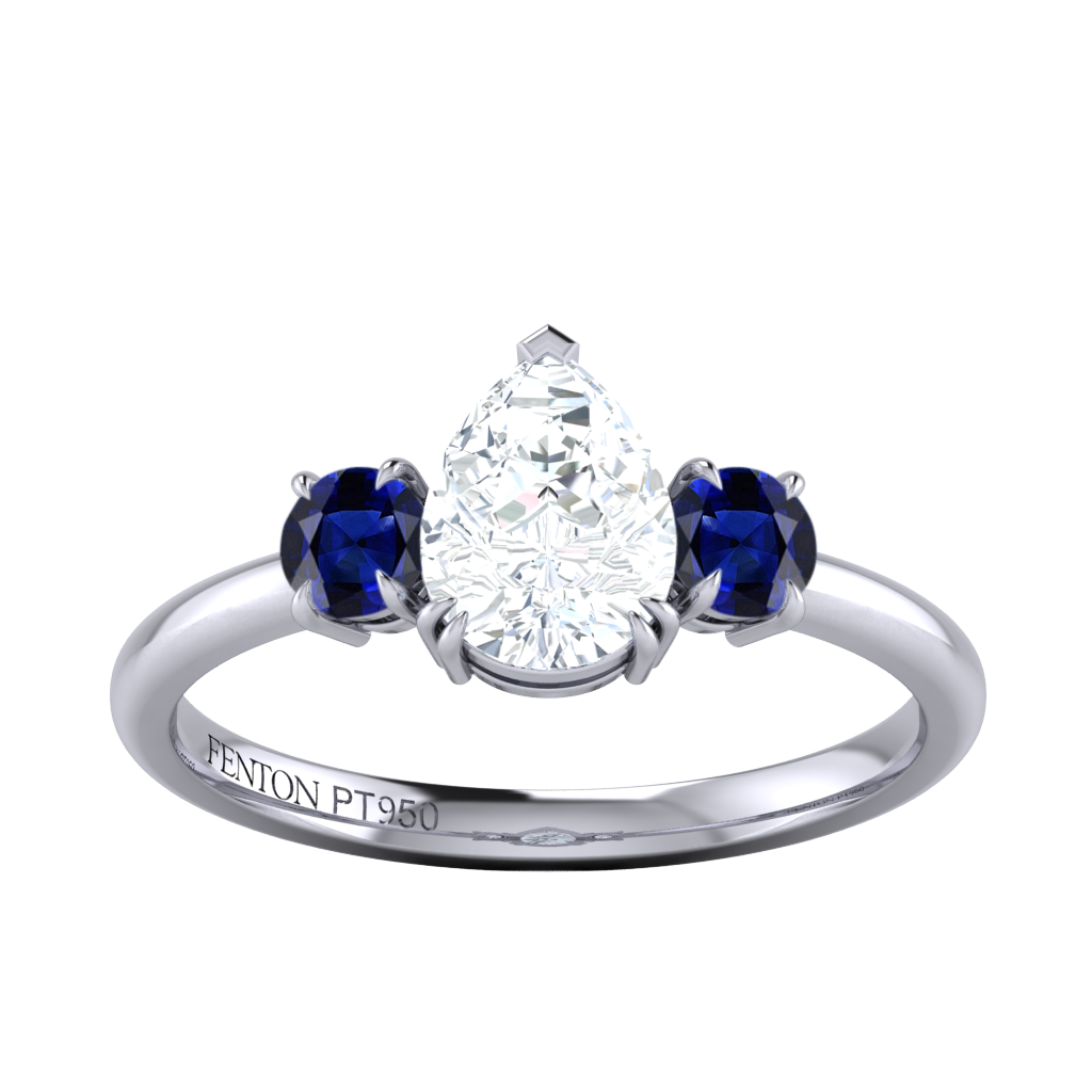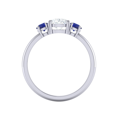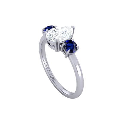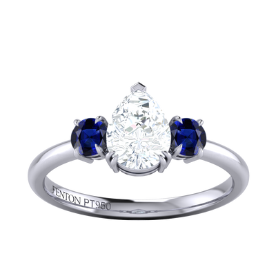 Lab Grown Solar Diamond Trilogy Pear Cut Diamond and Blue Sapphire Platinum Ring