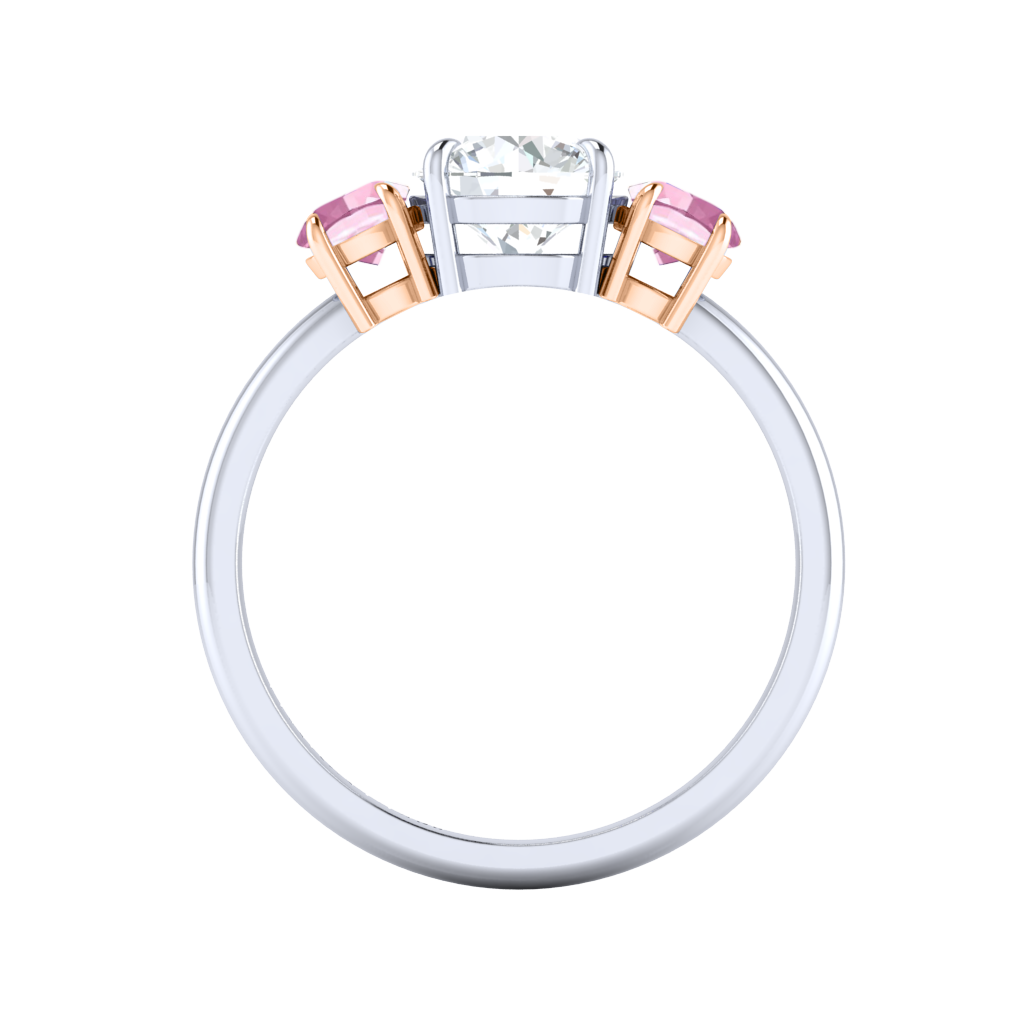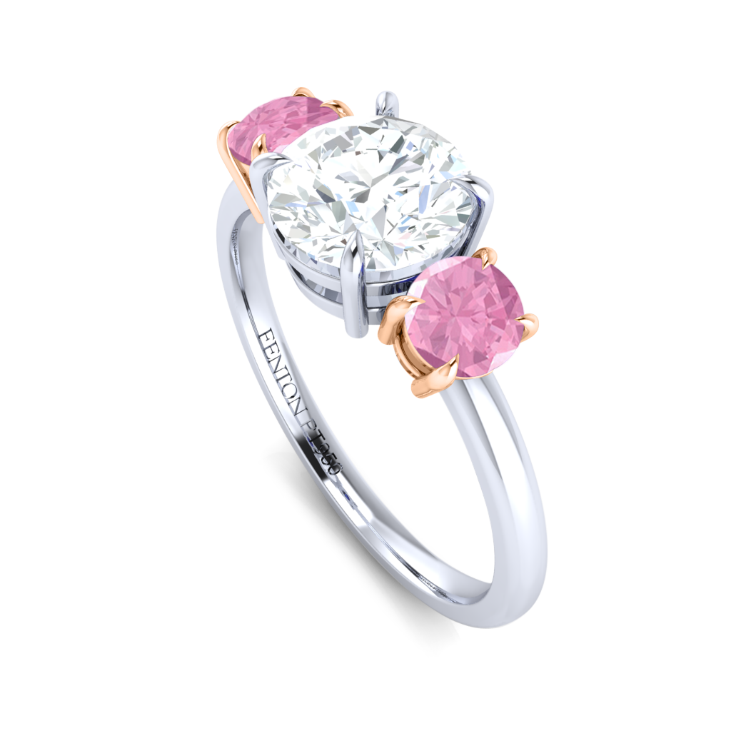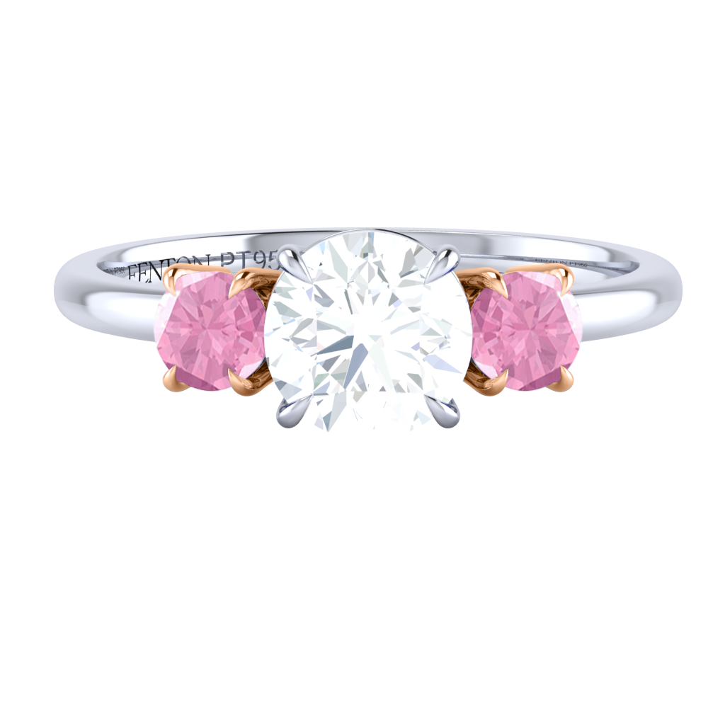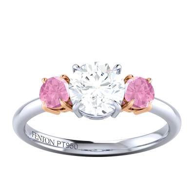 Proof that three isn't always a crowd, our Solar Diamond Trilogy Ring unites a sparkling Solar Diamond centre stone with two surrounding Pink Sapphire each set in a secure four single- or double claw setting and complimenting the exquisite sparkle of your Solar Diamond stone. Your Round Solar Diamond stone has a EF V/S quality rating and is set in a simple yet elegant gallery feeding smoothly into a sleek and simple Platinum band ranging from 1.90 - 2.20mm.