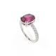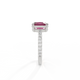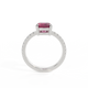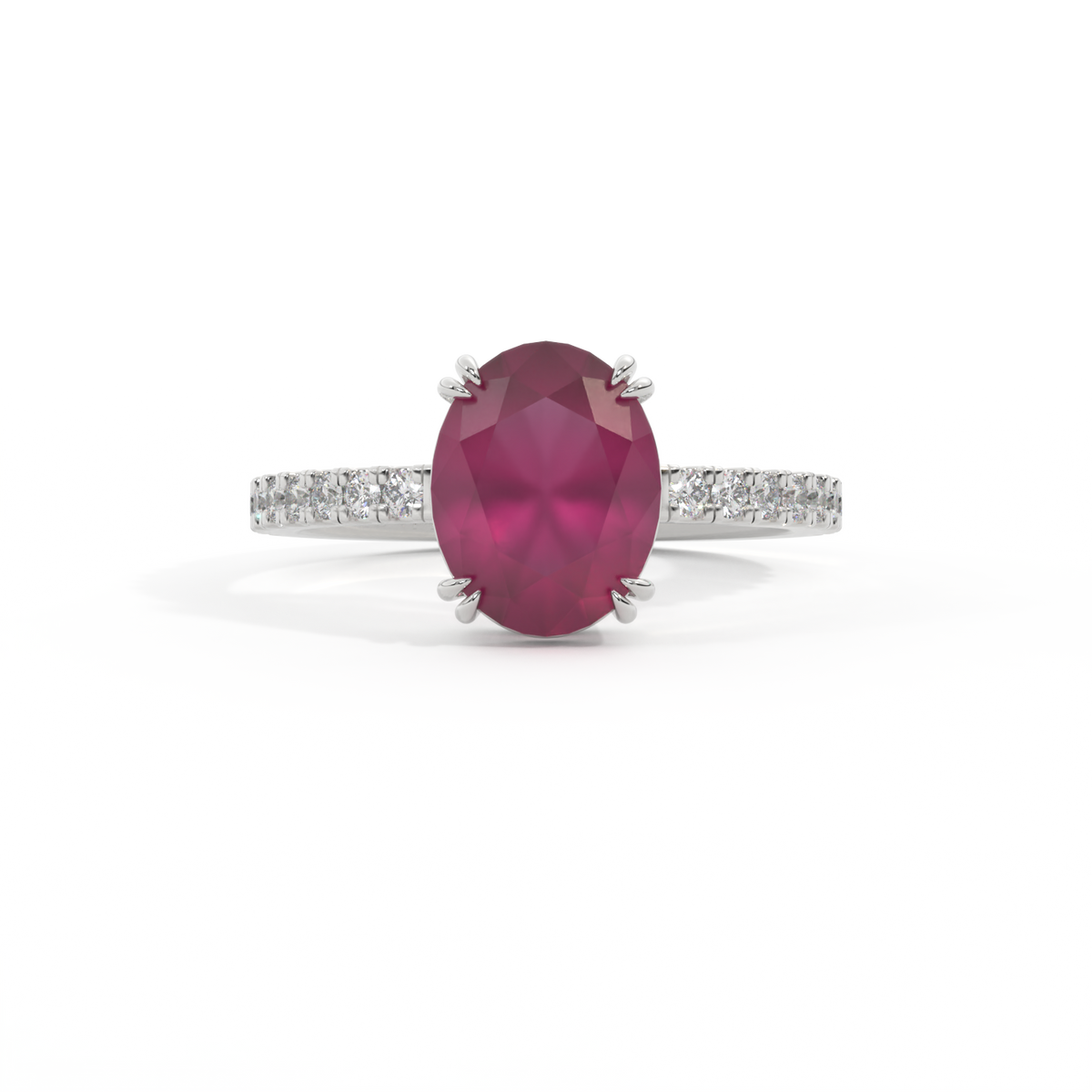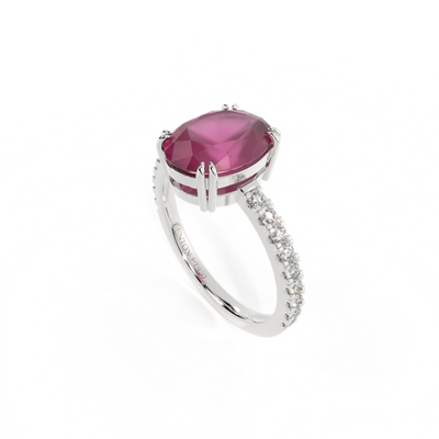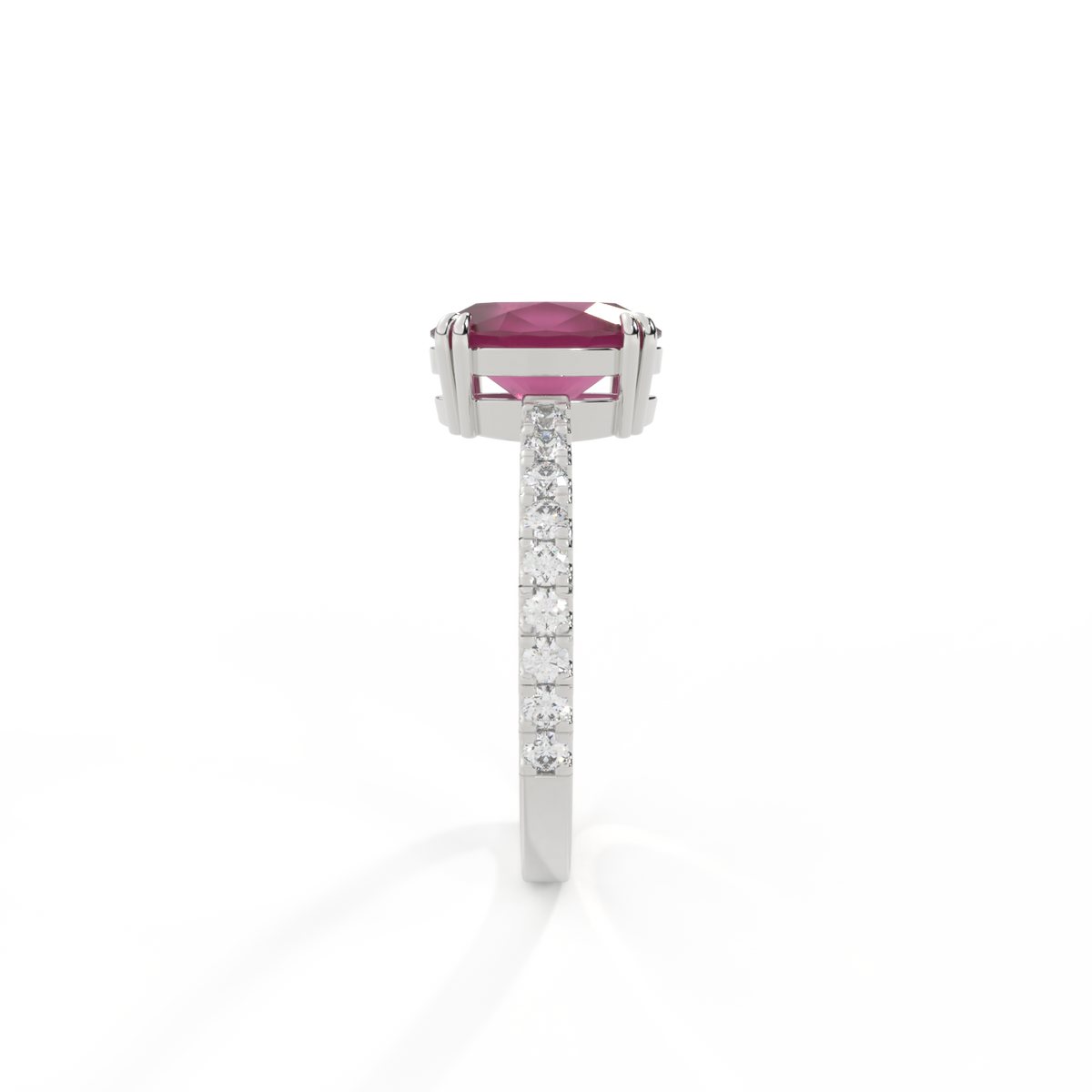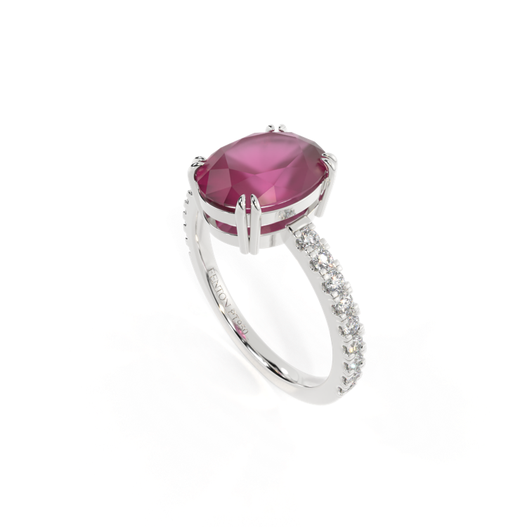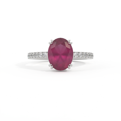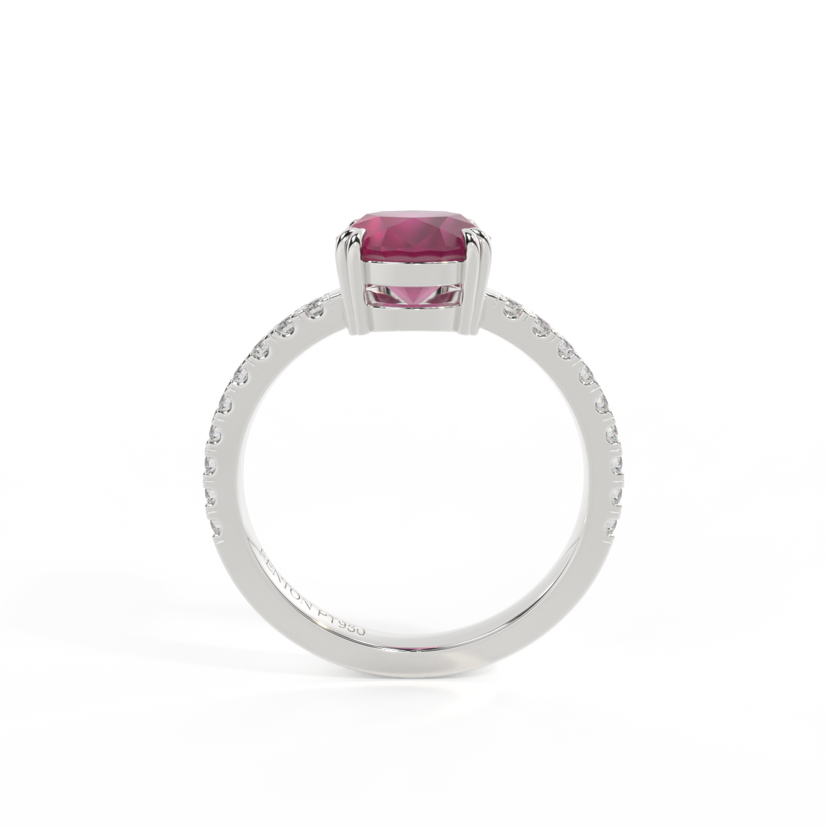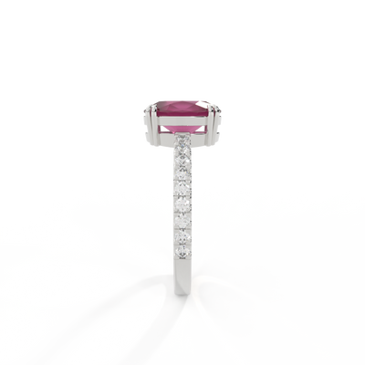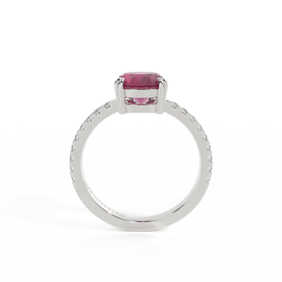 All of our rings are available in blue sapphire, ruby, emerald, pink sapphire, yellow sapphire, garnet and aquamarine. We offer three metals, 18K rose gold, 18K yellow gold and platinum. The centre stones are available in four cuts, round, cushion, oval and emerald cut and five sizes for each cut and style.