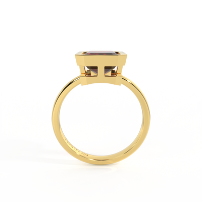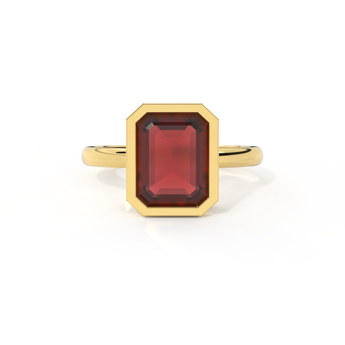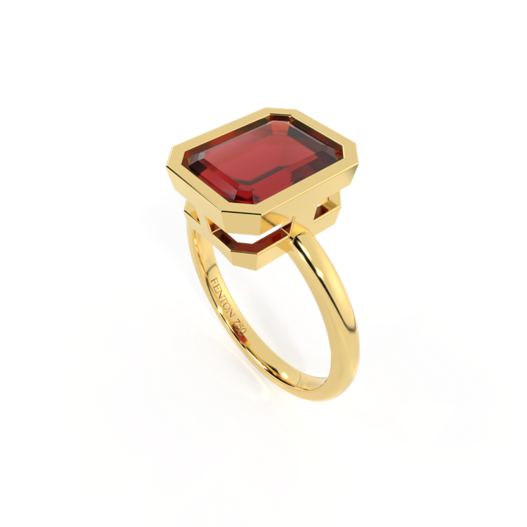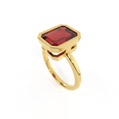 Minimalism meets modernism - the unique characteristics of this emerald cut Garnet are given centre stage in The Bezel. A modern take on a solitaire, this style frames the 10x8mm Garnet in a secure custom made setting that's simple and striking at the same time.