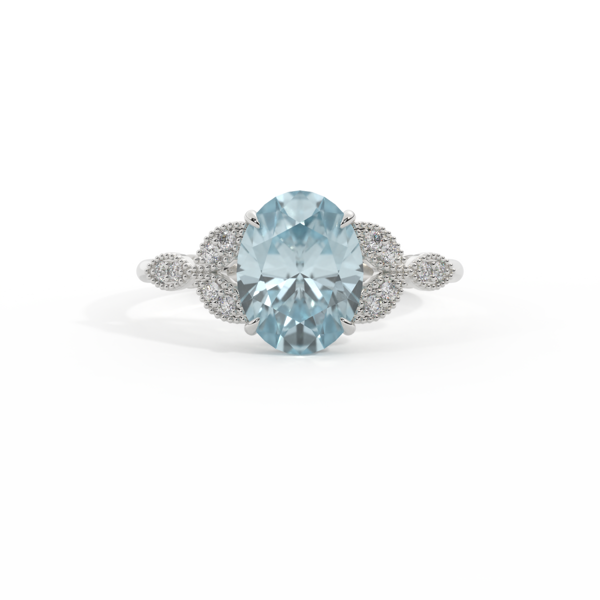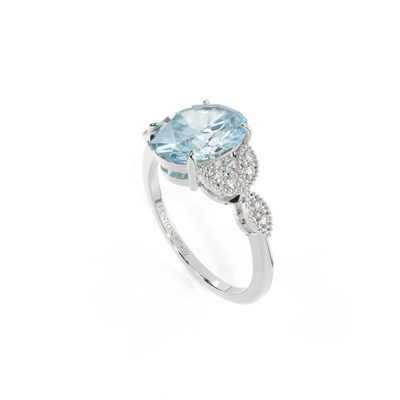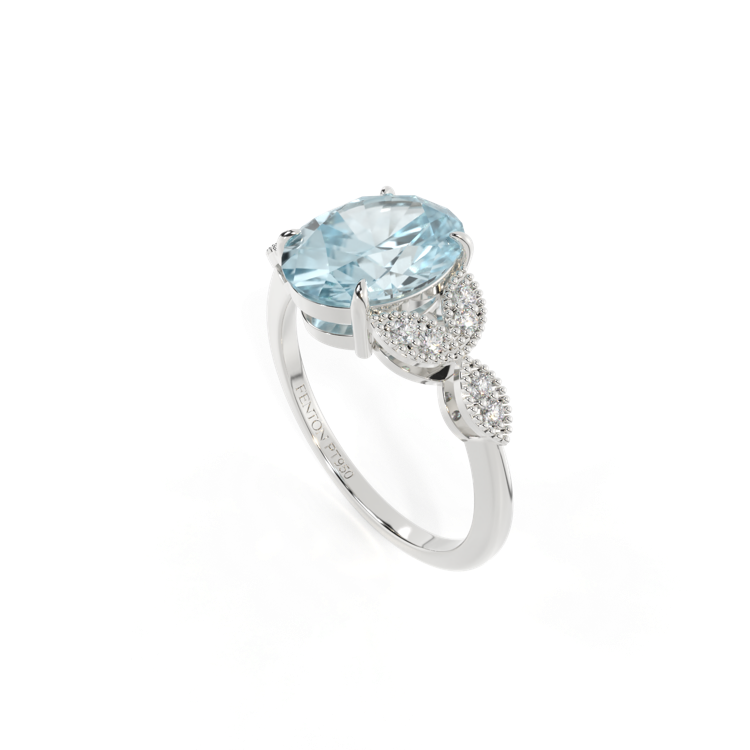 The beauty of a flower, re-imagined for eternity. Inspired by the romance of the Victorian era, this oval cut Aquamarine is accentuated by a duo of delicate diamond-set petals with millegrain detail for an elegant twist on a timeless classic.