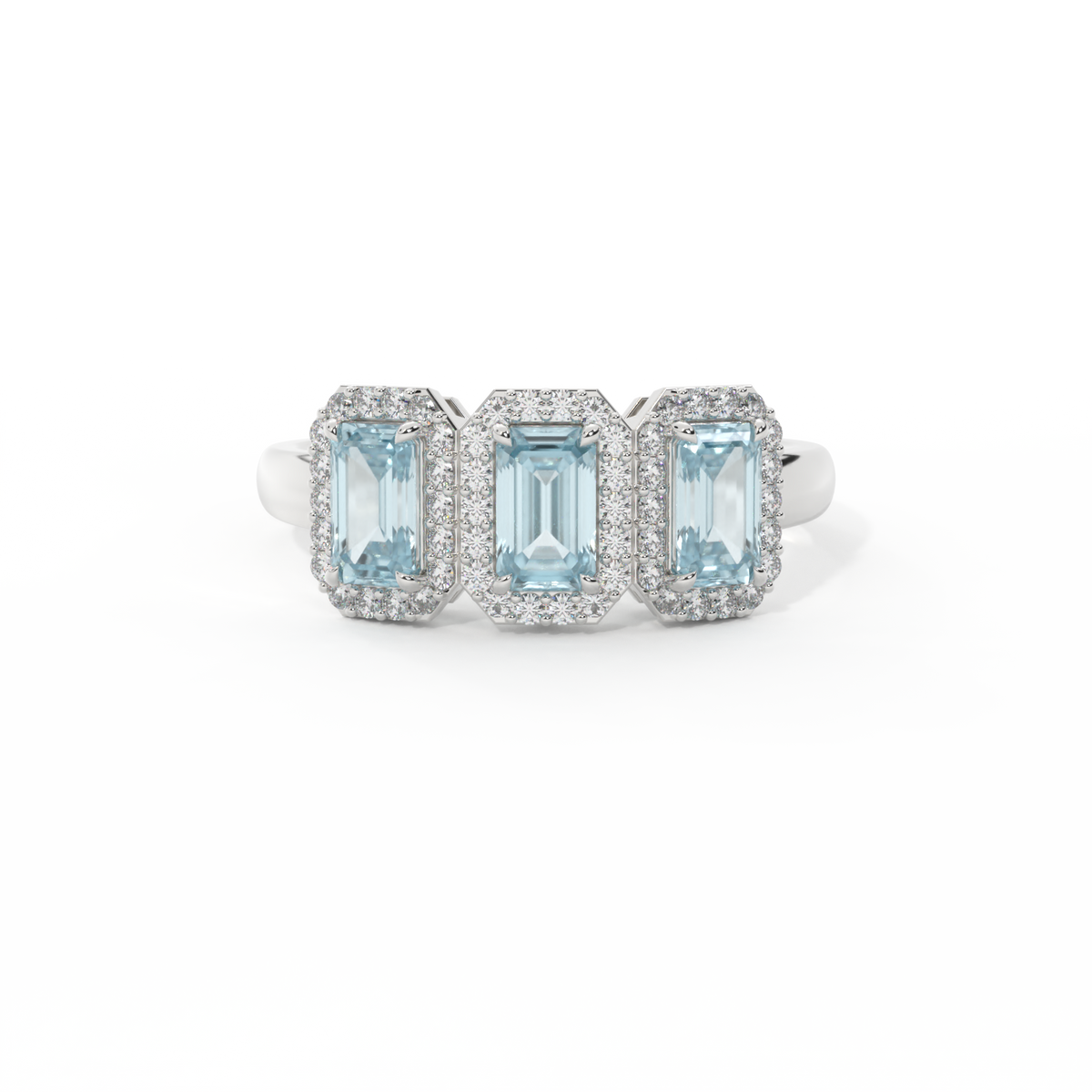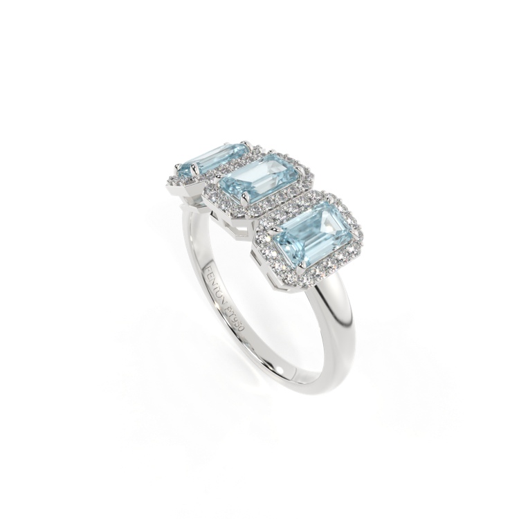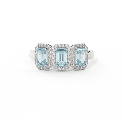 This low set, super wearable beauty, is reminiscent of a floral garland, one of the most universal symbols of love. Three unique, emerald cut Aquamarines are surrounded by diamond halos, each Aquamarine a one of a kind gemstone.