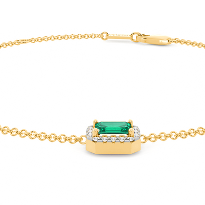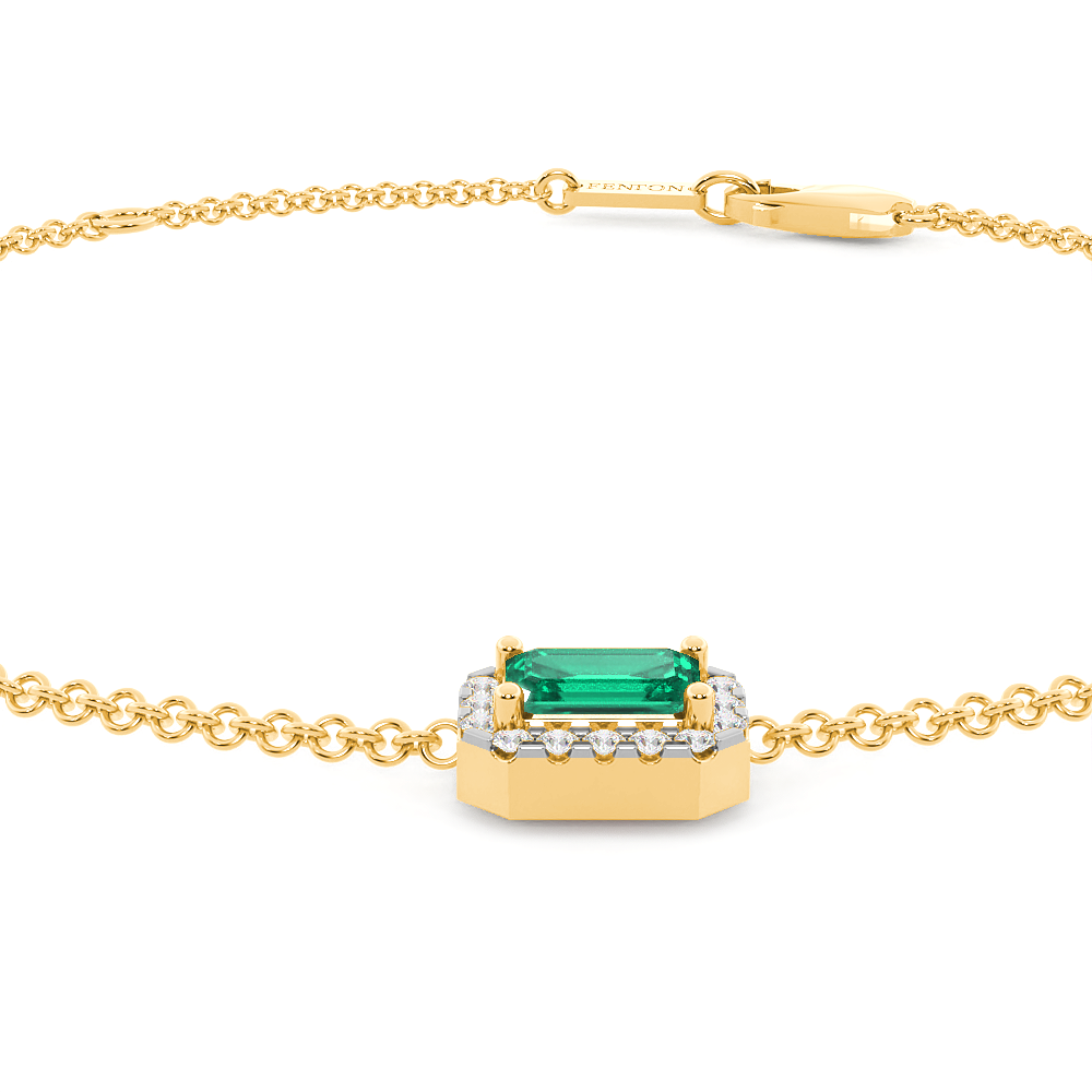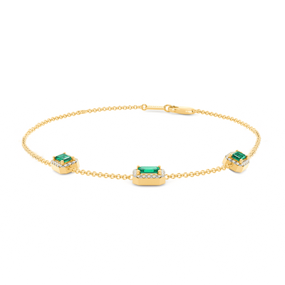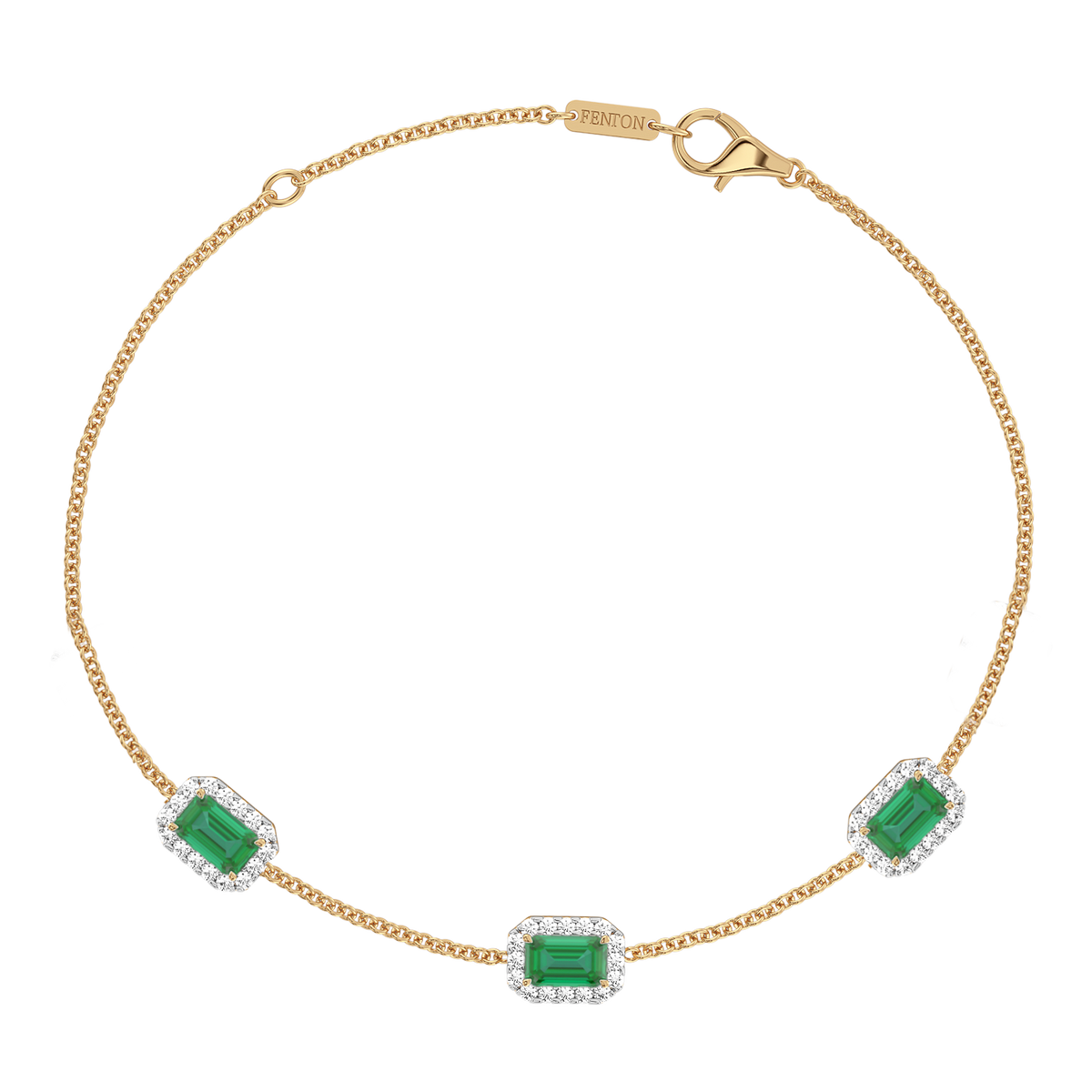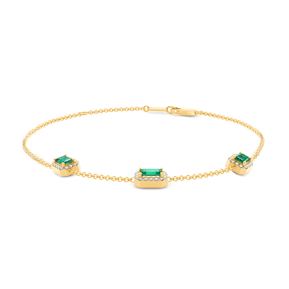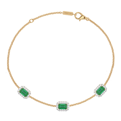 The Garland Bracelet in Emerald balances feminine romanticism and timeless style. This delicate design features three Emerald Emerald stones in a classic claw setting surrounded by a glistening halo of G/H colour and VS clarity diamonds to create a jewellery piece to be treasured forever. The three-stone design is a Fenton favourite and reminiscent of a floral garland, one of the most universal symbols of love.