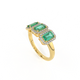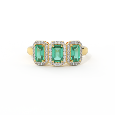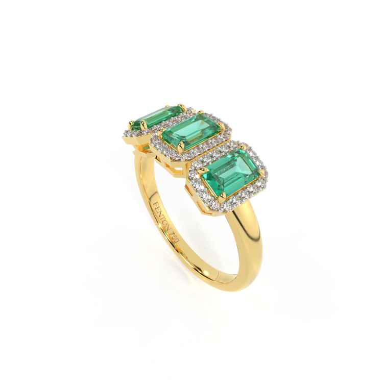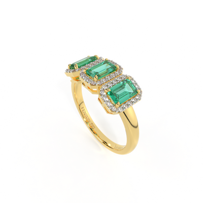 This low set, super wearable beauty, is reminiscent of a floral garland, one of the most universal symbols of love. Three unique, emerald cut Emeralds are surrounded by diamond halos, each Emerald a one of a kind gemstone.