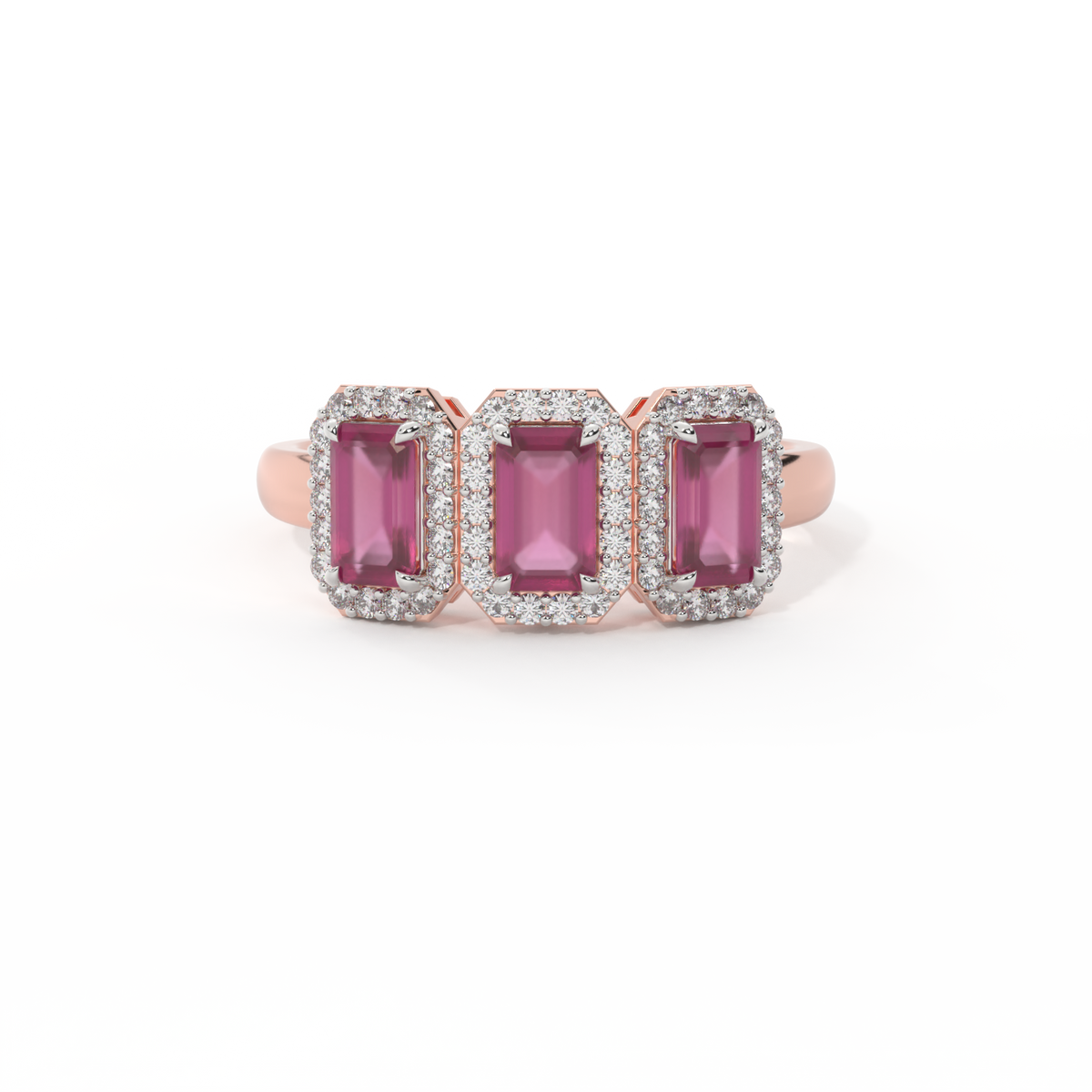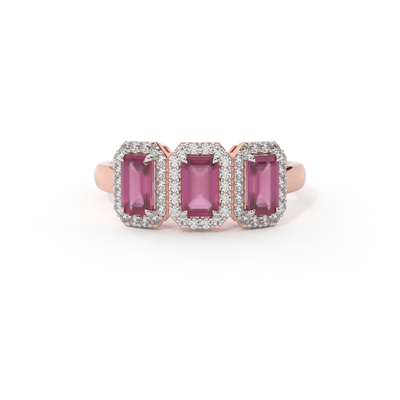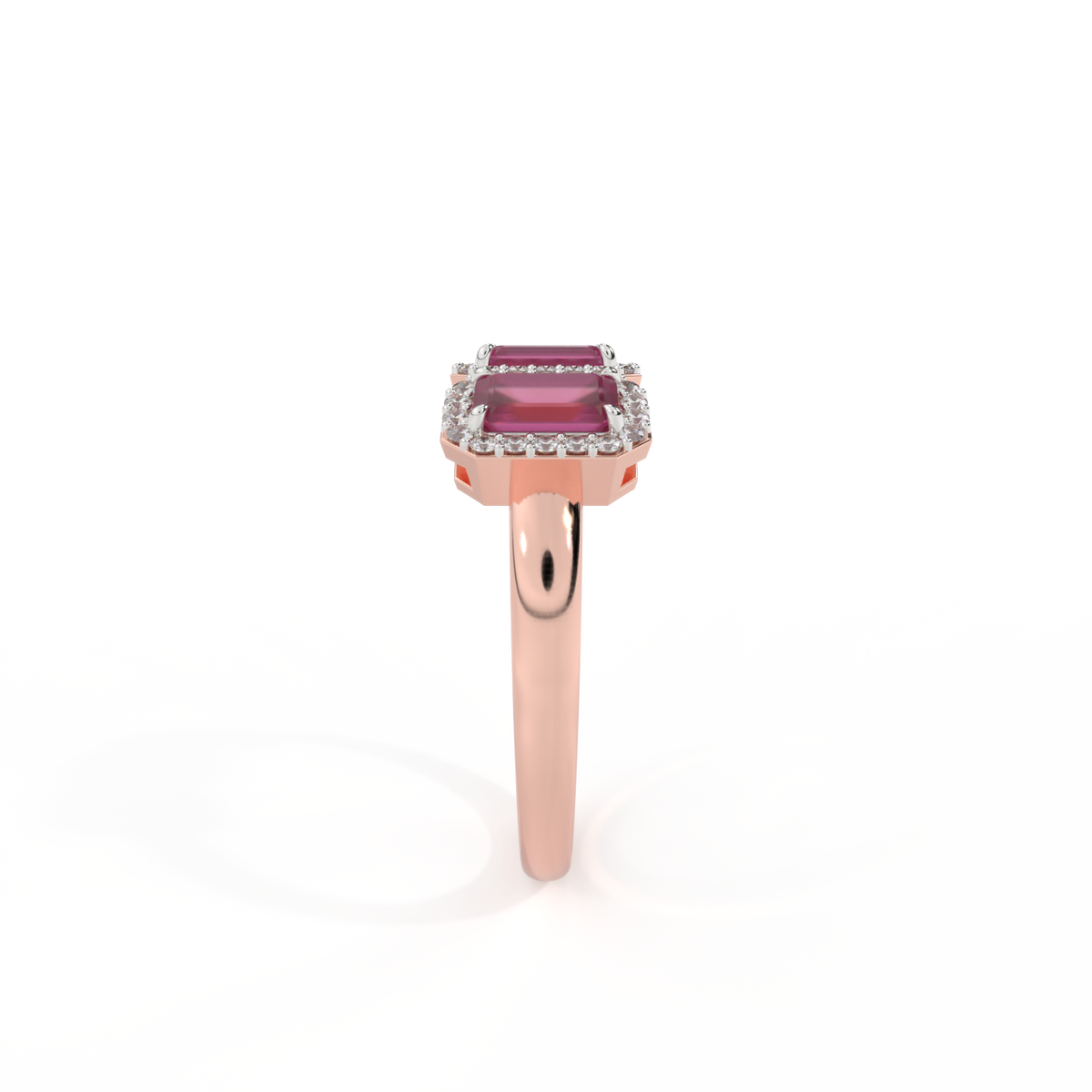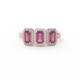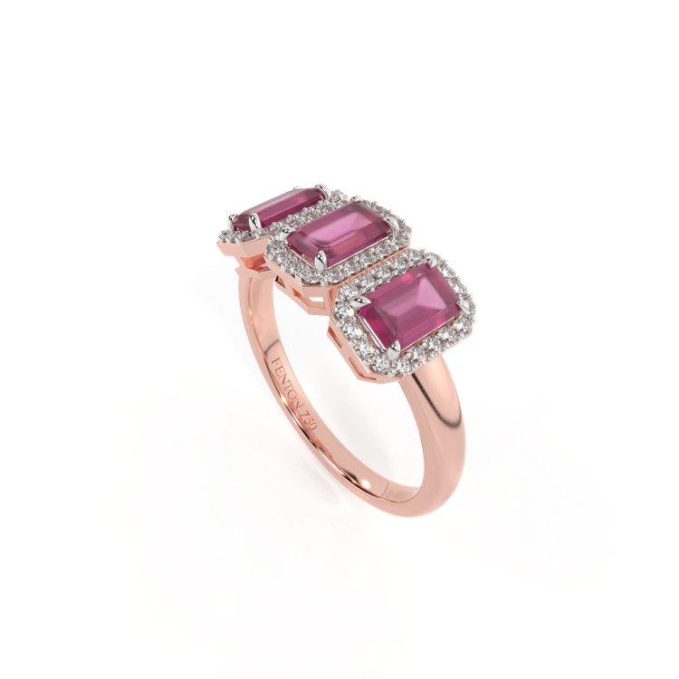 This low set, super wearable beauty, is reminiscent of a floral garland, one of the most universal symbols of love. Three emerald cut Rubies are surrounded by diamond halos, each Ruby completely unique.