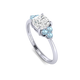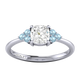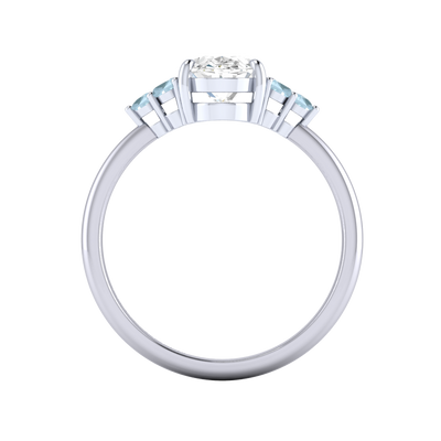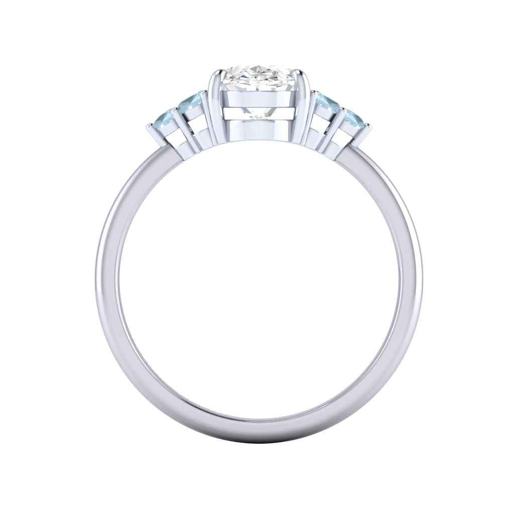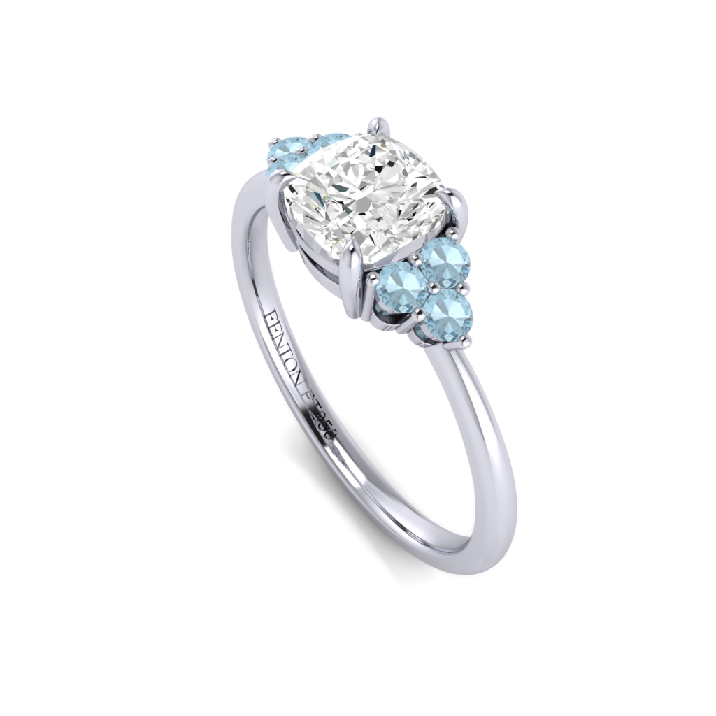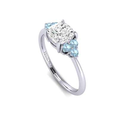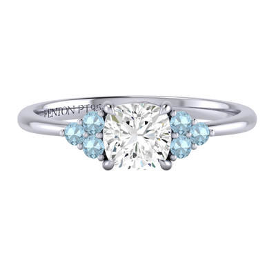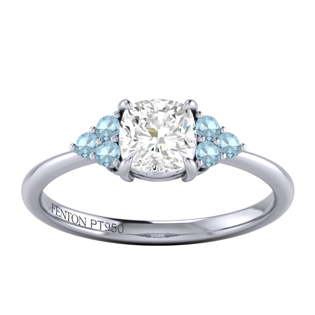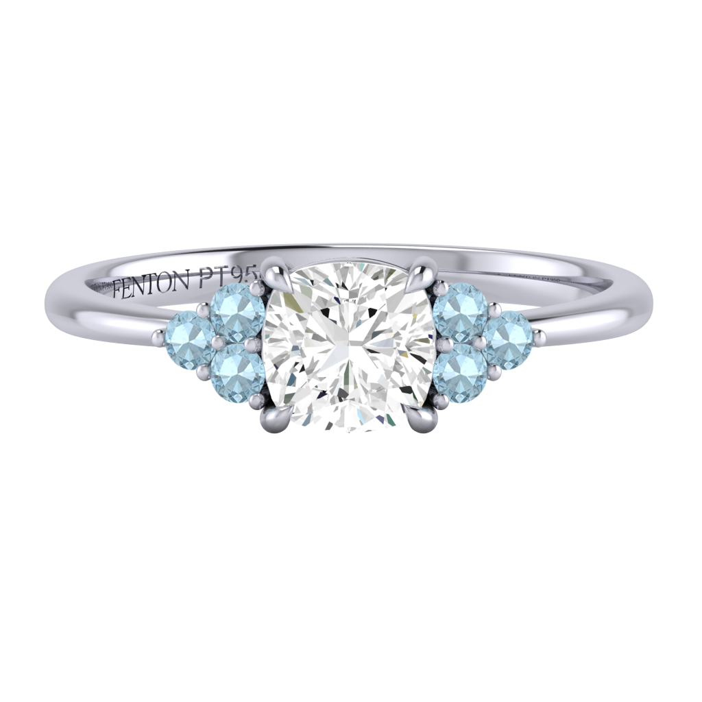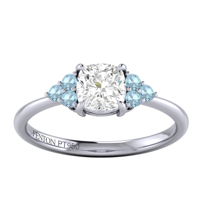 Your glistening Cushion Lab Grown Diamond has a GH V/S quality rating and is framed on either side by a trefoil cluster of three 1.8mm round brilliant cut Aquamarine stones, each securely held into place in a claw setting. The design draws the eye to the glistening Lab Grown Diamond centre stone, sitting proudly in a classic open gallery setting crafted from solid Platinum. The open setting of this design allows the light to reflect in all directions, creating a lustrous and sparkling look.