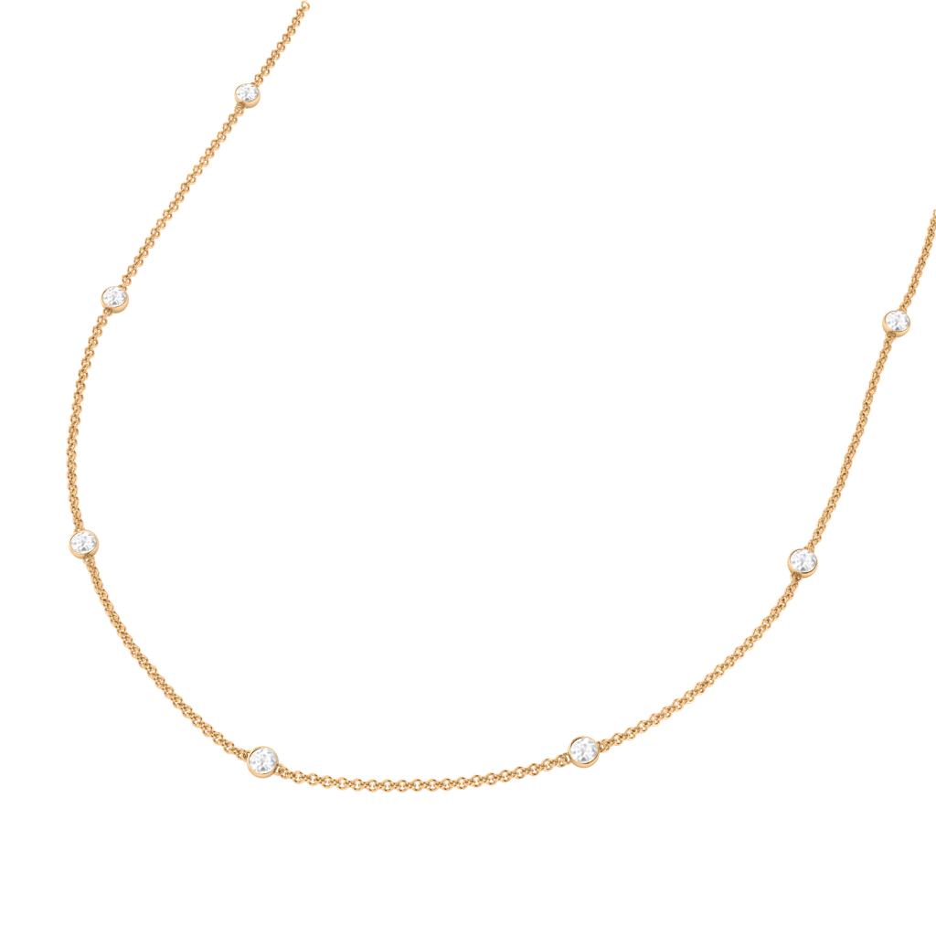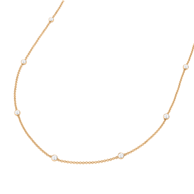 Our Seven Stone Diamond Necklace combines timeless elegance with glistening gemstones to make a perfect everyday jewellery piece to adorn you from day to night. Your seven 3mm round-cut Diamond stones are delicately bezel-set with equal spacing to make an effortless, sparkling statement.