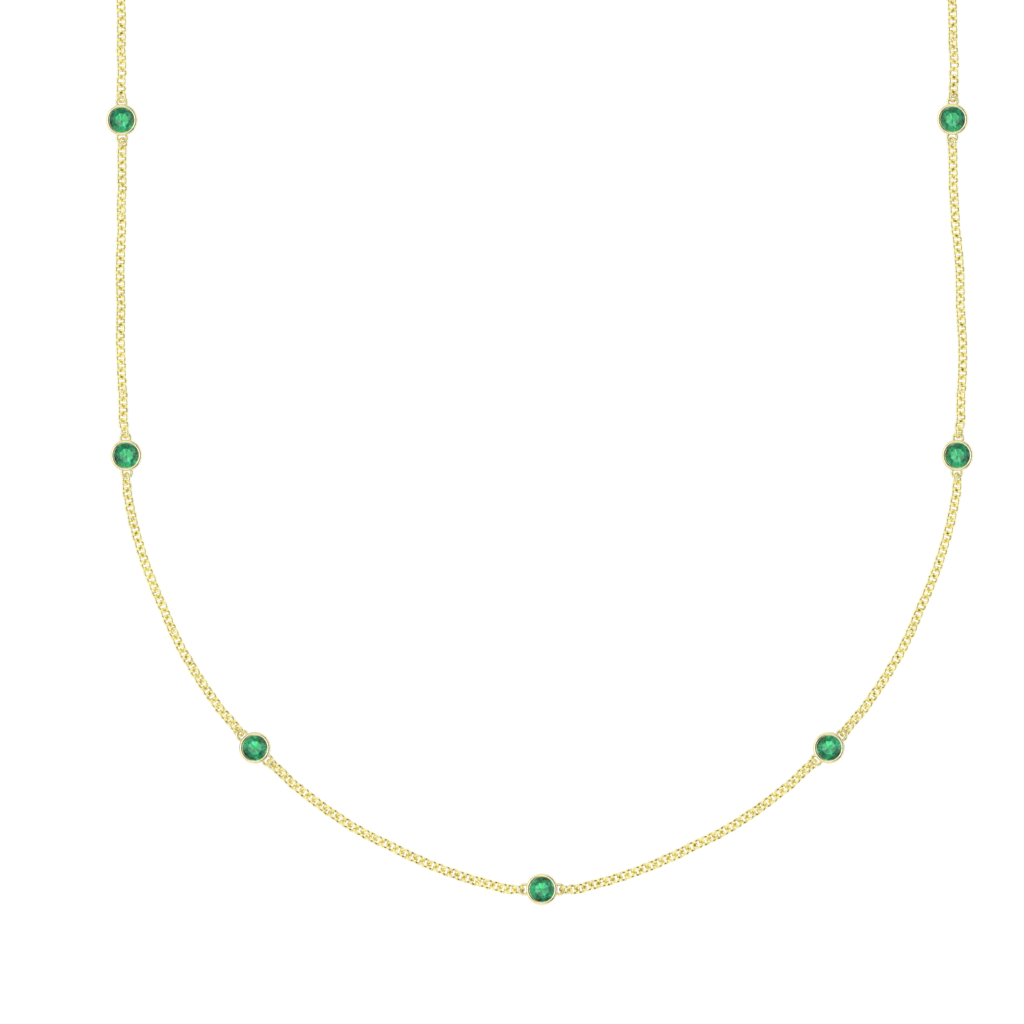 Our Seven Stone Bezel Emerald Necklace brings together timeless elegance and glistening gemstones to make a perfect everyday jewellery piece to adorn you from day to night. Your seven 3mm round-cut Emerald stones are delicately bezel-set with equal spacing to make an effortless, sparkling statement.