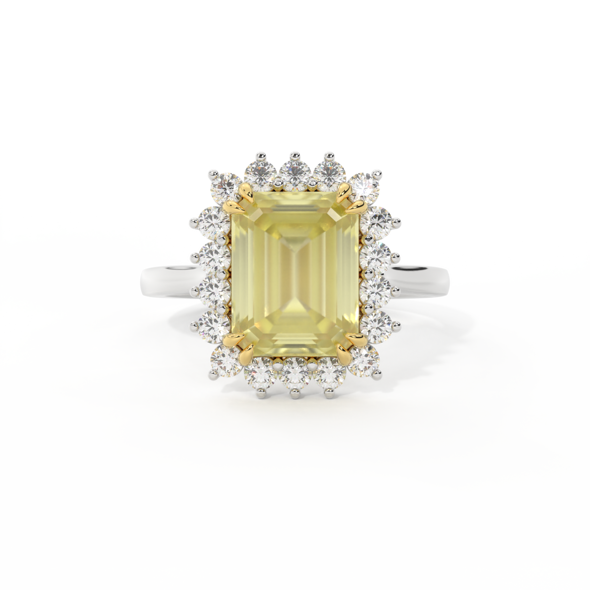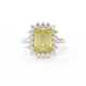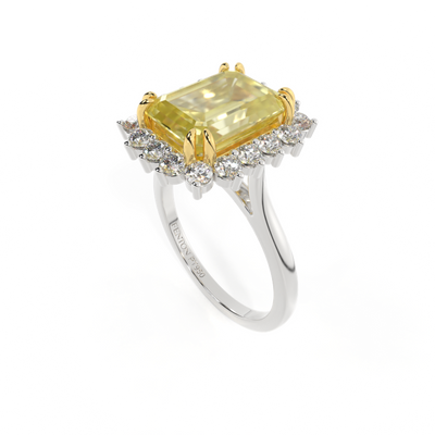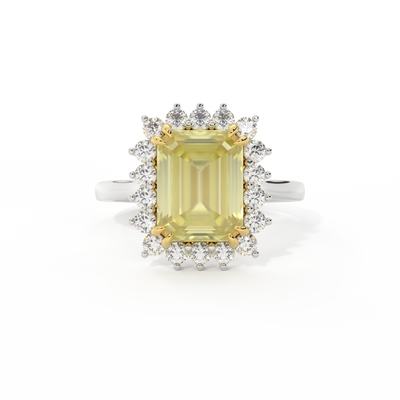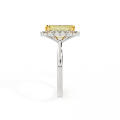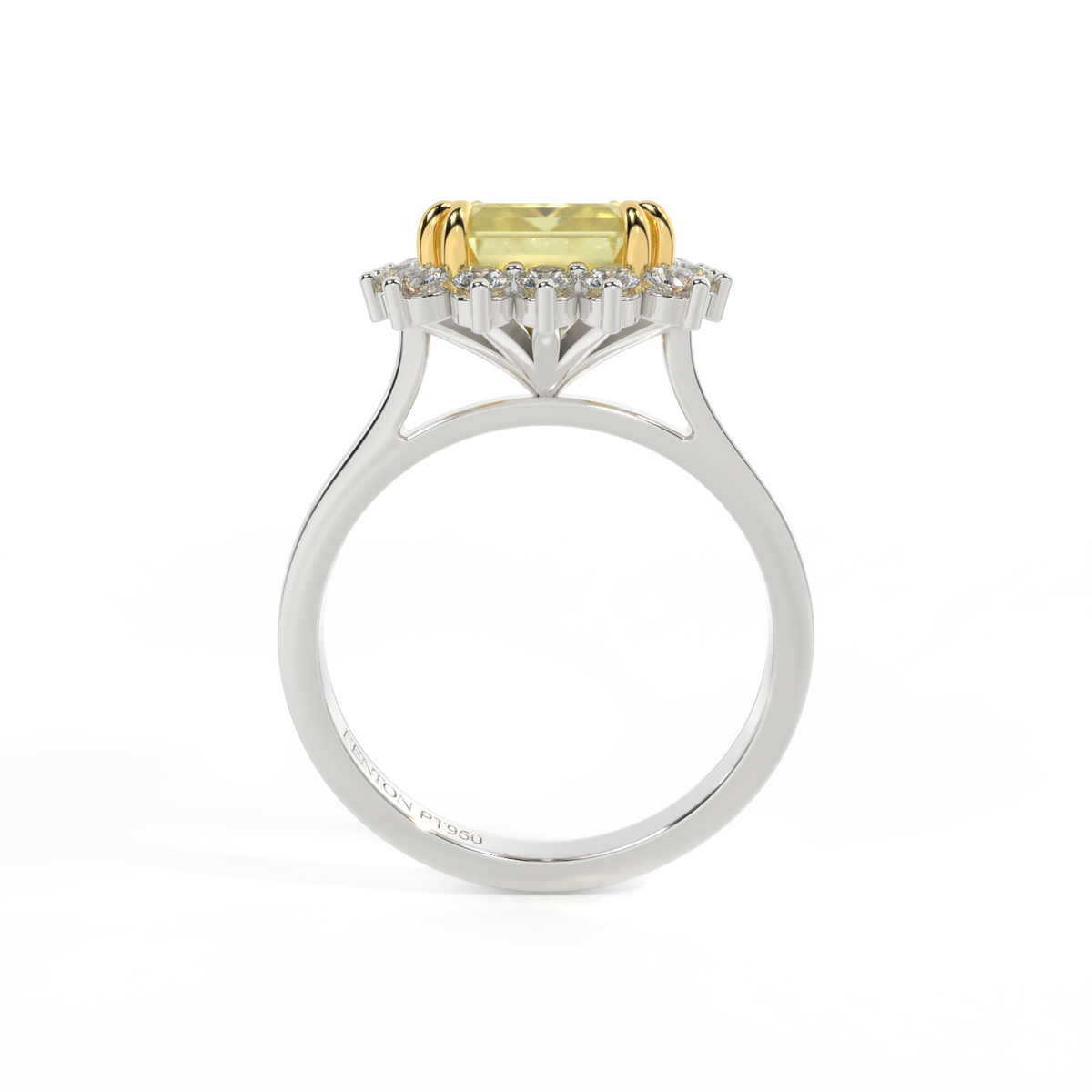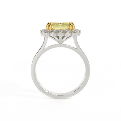 This classic design features a single GH VS diamond halo around a Emerald cut Yellow Sapphire. The outer three claw setting in Platinum is what gives this design the elegant ‘star’ aesthetic and makes it a real sparkling showstopper.The Star is wed-fit with a basket-style gallery and can comfortably be worn with a wedding band or stacked with other bands.