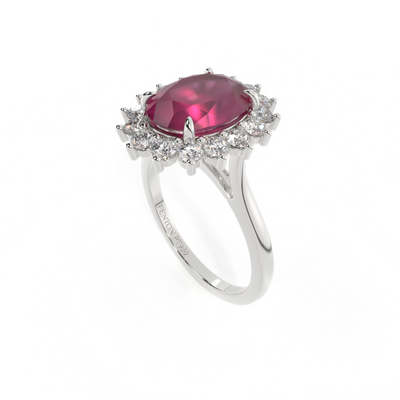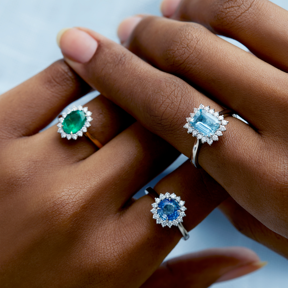 Make a majestic statement with The Star ring from Fenton. Inspired by the celestial beauty of the night sky, this classic design features an impactful colourful centre gemstone, surrounded by a halo of diamonds which are G to H colour and VS clarity. The outer three claw setting is what gives this design the sparkling ‘star’ aesthetic making it a real showstopper.