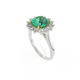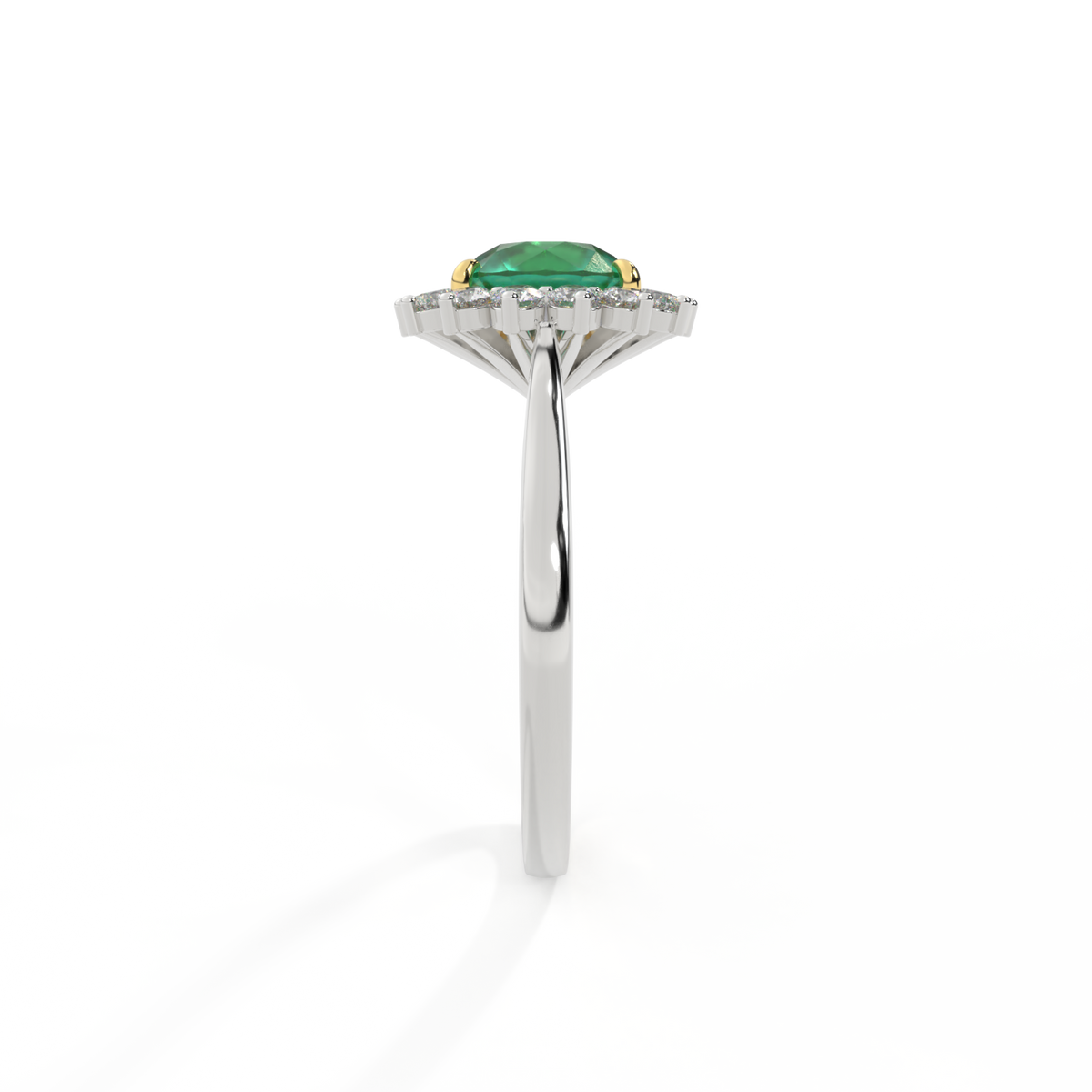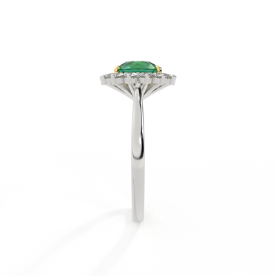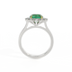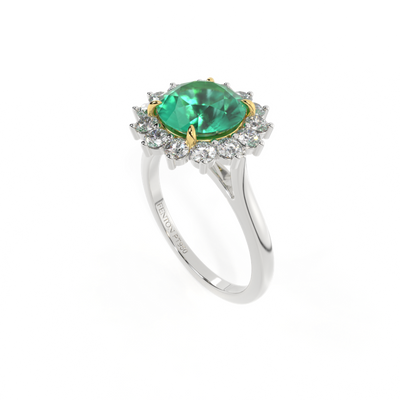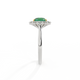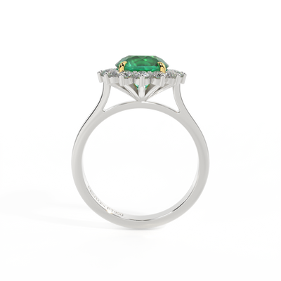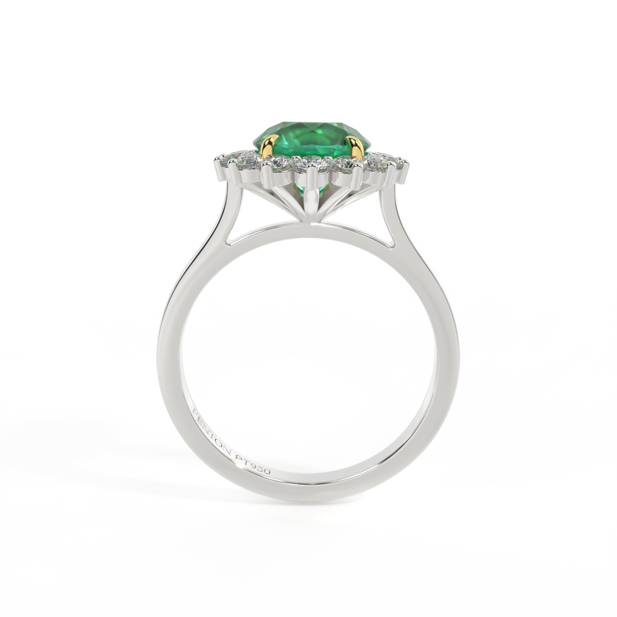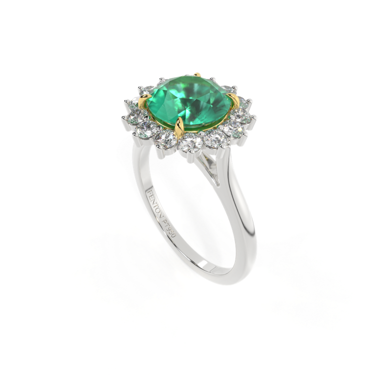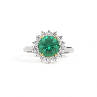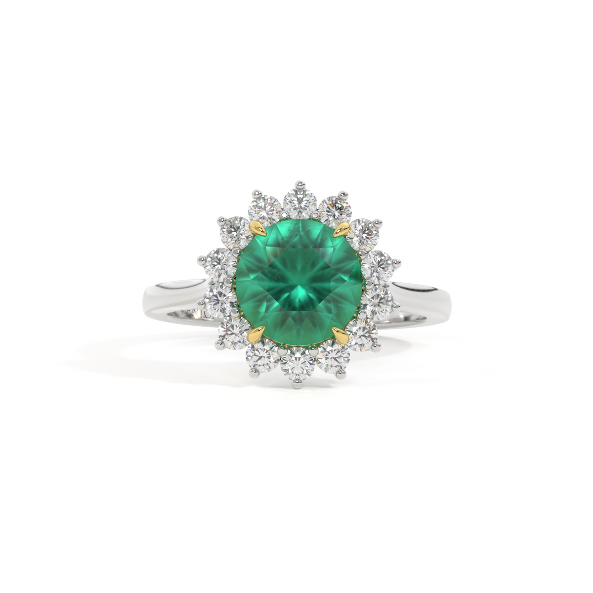 This classic design features a single GH VS diamond halo around a Round cut Emerald. The outer three-claw setting in Platinum is what gives this design the elegant ‘star’ aesthetic and makes it a real sparkling showstopper.