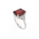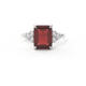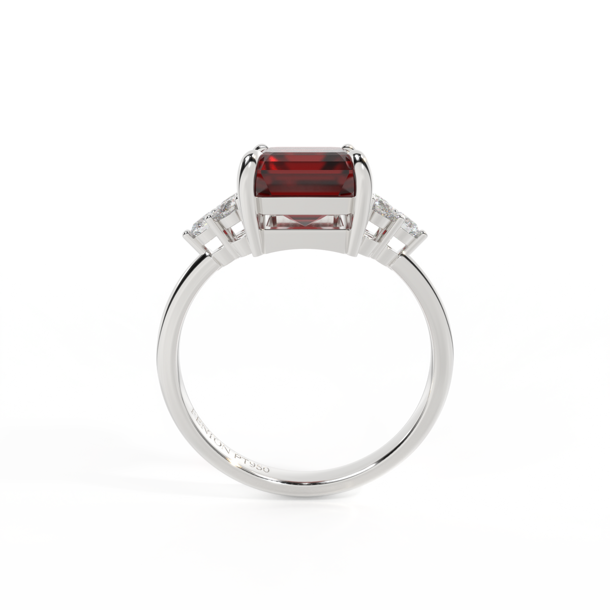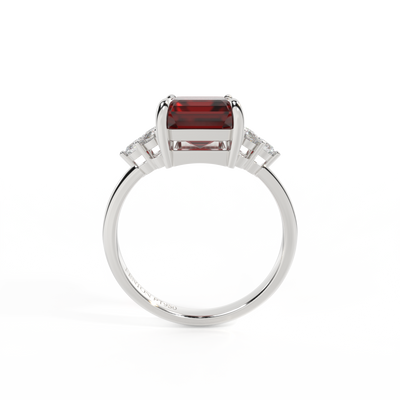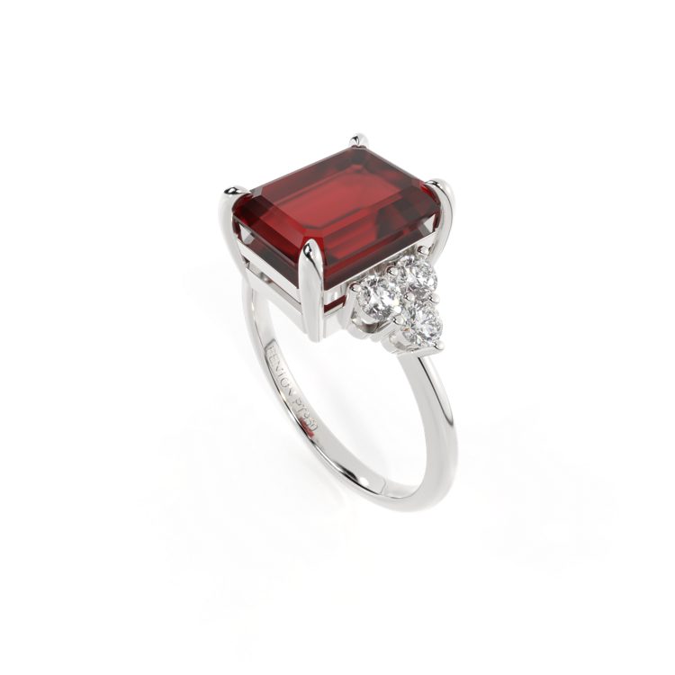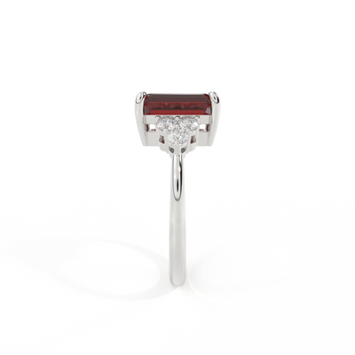 Your glistening Emerald cut Garnet is framed on either side by a trefoil cluster of three 1.8mm round brilliant cut GH/VS diamonds, each securely held into place in a claw setting. The design draws the eye to the glistening Garnet centre stone, sitting proudly in a classic open gallery setting crafted from solid, recycled 18K gold or platinum. The open setting of this design allows the light to reflect in all directions, creating a lustrous and sparkling look.