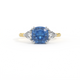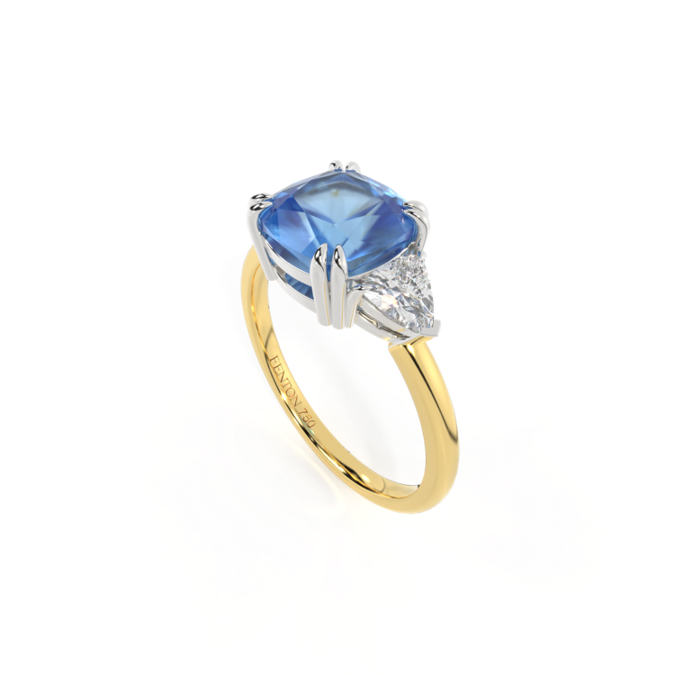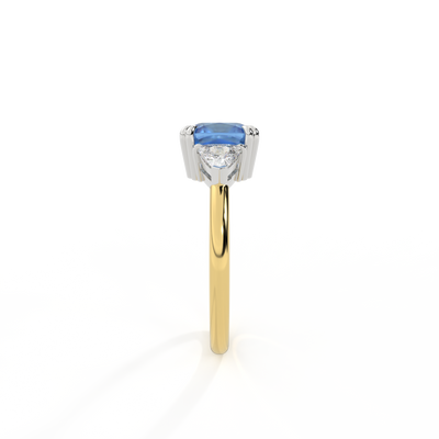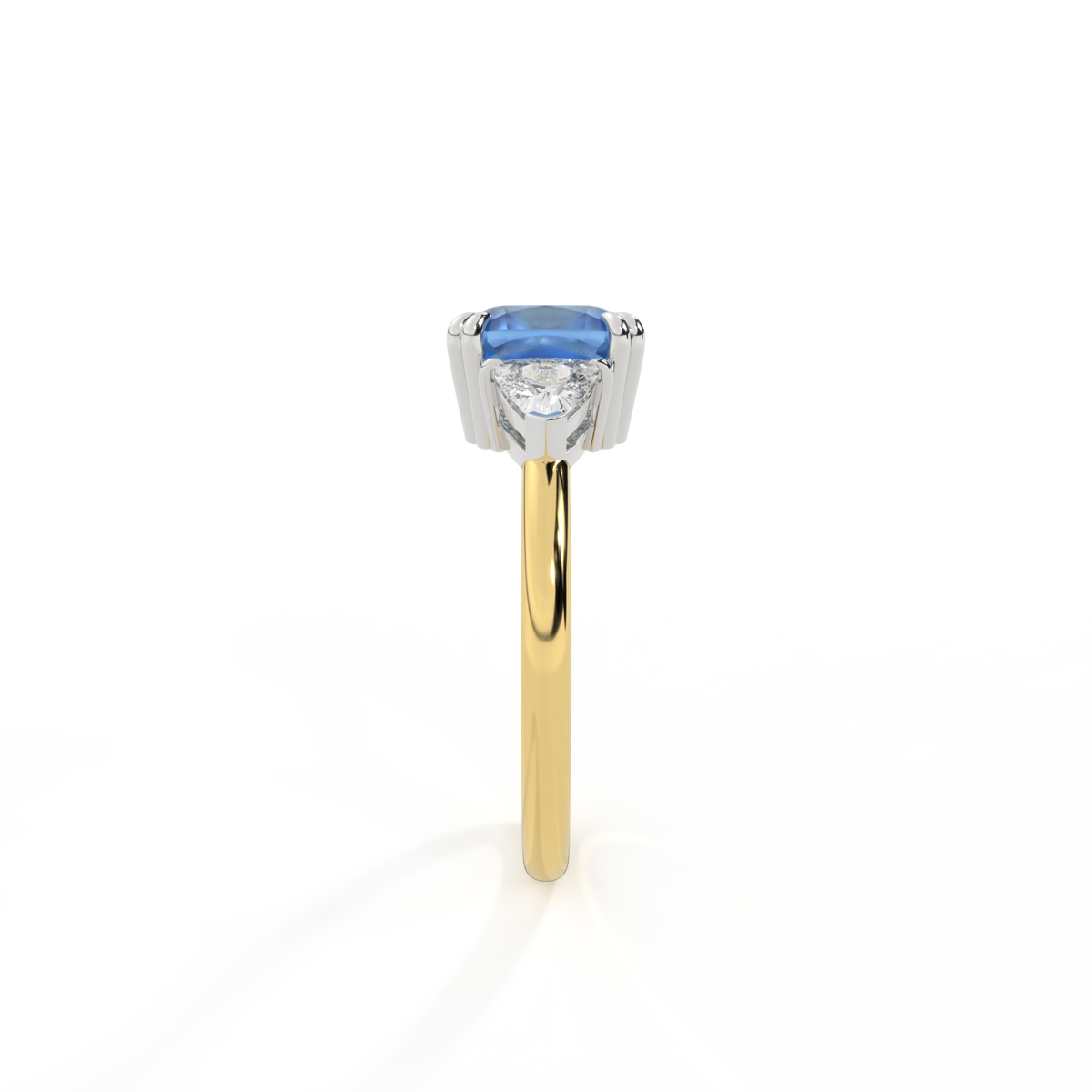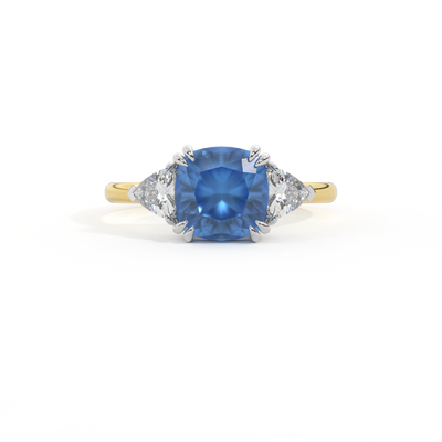 This exceptional unique Blue Sapphire in a cushion cut, accented by two GH VS diamonds, sits in a Trilogy setting, representing the past, present and future.