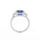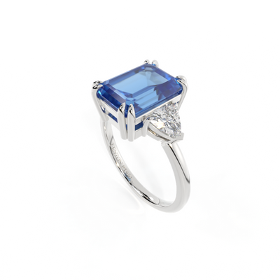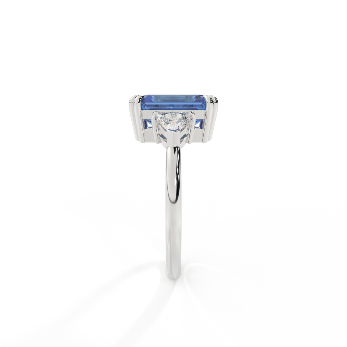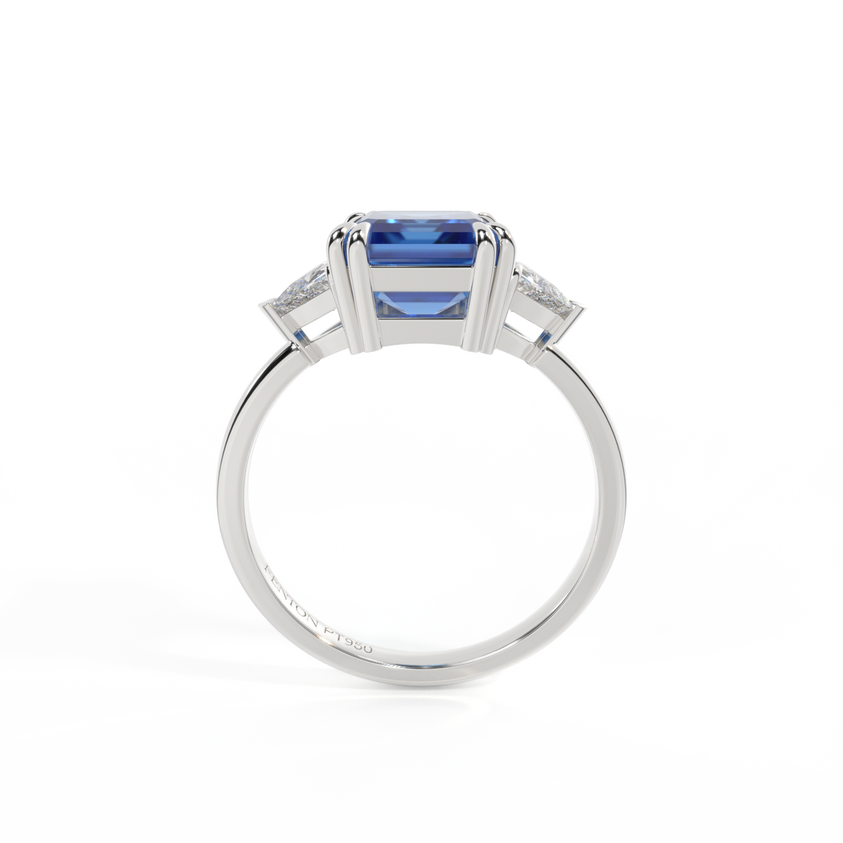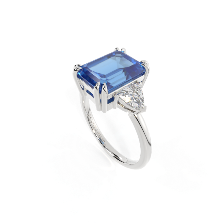 This one of a kind emerald cut Blue Sapphire and two accent GH VS diamonds, sit in a Trilogy setting, representing the past, present and future. The Sapphire is as with all Fenton gemstones, has been hand selected through our ethical supply chain. The setting is handcrafted in Platinum for a modern take on a timeless piece.