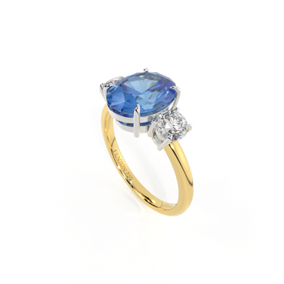 Proof that three isn't always a crowd, our trilogy ring unites a coloured centre stone with two surrounding GH VS diamonds. Choose your own cut and centre stone to create your own version of this elegant design.