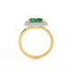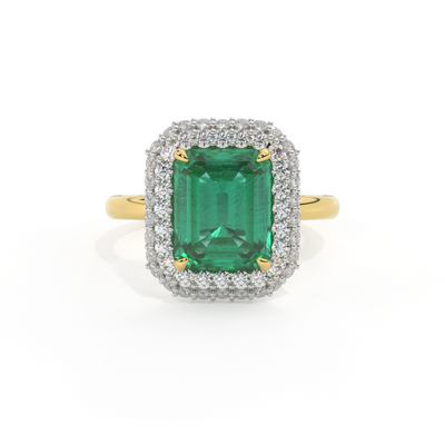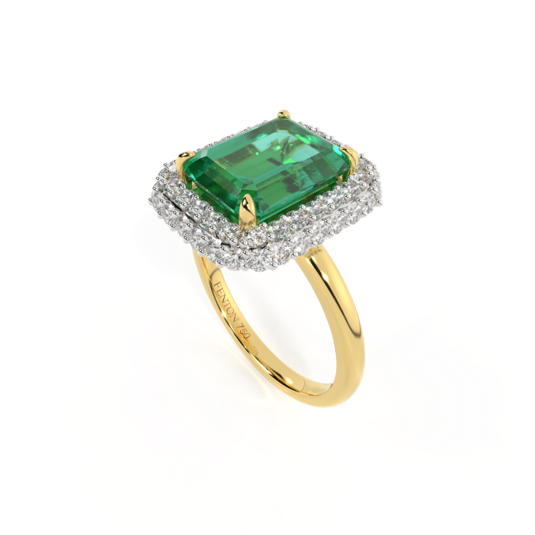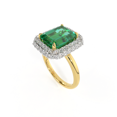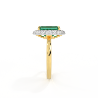 The Vintage is a regal style that is designed to be a modern heirloom, to be treasured for generations to come. Your center Emerald stone is set on a sparkling cushion on G/H colour and VS clarity diamonds, allowing the light catch from all directions. The delicate metal work under the ring is crafted from solid 18K Yellow Gold and inspired by 18th century antique engagement rings, making it a perfect engagement ring style to mark a special moment. This style is designed using the best of modern manufacturing to add comfort and durability.
