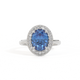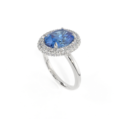 A halo of GH VS diamonds glitter next to the Blue Sapphire, set in platinum. As with all Fenton gemstones, this completely unique stone is hand selected through our ethical supply chain.