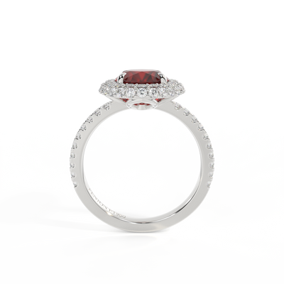 A halo of GH VS diamonds glitter next to the Garnet, set in platinum. As with all Fenton gemstones, this completely unique stone is hand selected through our ethical supply chain.