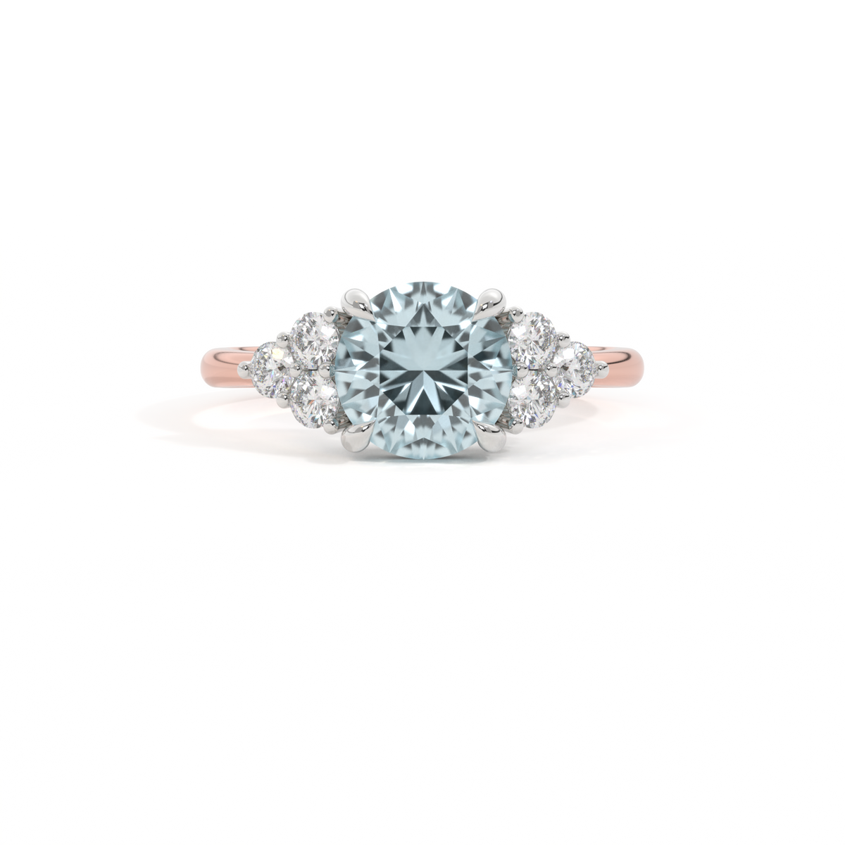 Your glistening Round cut Aquamarine is framed on either side by a trefoil cluster of three 1.8mm round brilliant cut GH/VS diamonds, each securely held into place in a claw setting. The design draws the eye to the glistening Aquamarine centre stone, sitting proudly in a classic open gallery setting crafted from solid, recycled 18K gold or platinum. The open setting of this design allows the light to reflect in all directions, creating a lustrous and sparkling look.