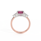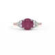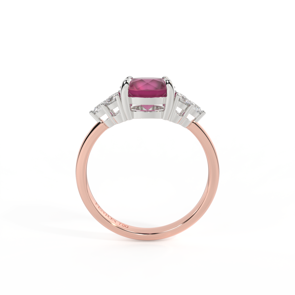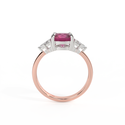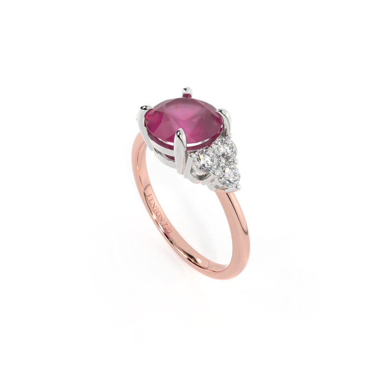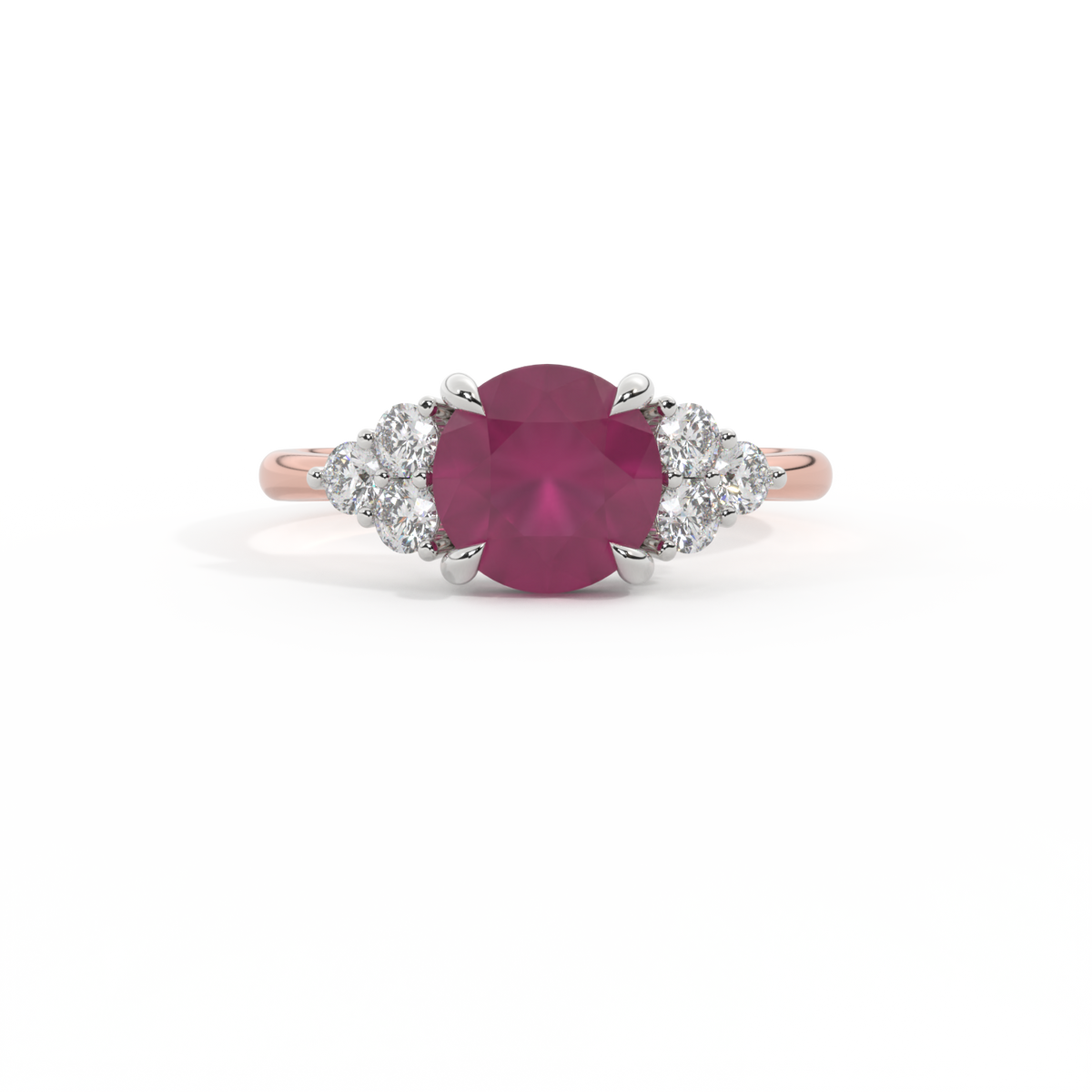 Your glistening Round cut Ruby is framed on either side by a trefoil cluster of three 1.8mm round brilliant cut GH/VS diamonds, each securely held into place in a claw setting. The design draws the eye to the glistening Ruby centre stone, sitting proudly in a classic open gallery setting crafted from solid, recycled 18K gold or platinum. The open setting of this design allows the light to reflect in all directions, creating a lustrous and sparkling look.