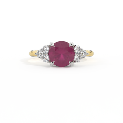 Your glistening Round cut Ruby is framed on either side by a trefoil cluster of three 1.8mm round brilliant cut GH/VS diamonds, each securely held into place in a claw setting. The design draws the eye to the glistening Ruby centre stone, sitting proudly in a classic open gallery setting crafted from solid, recycled 18K gold or platinum. The open setting of this design allows the light to reflect in all directions, creating a lustrous and sparkling look.