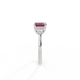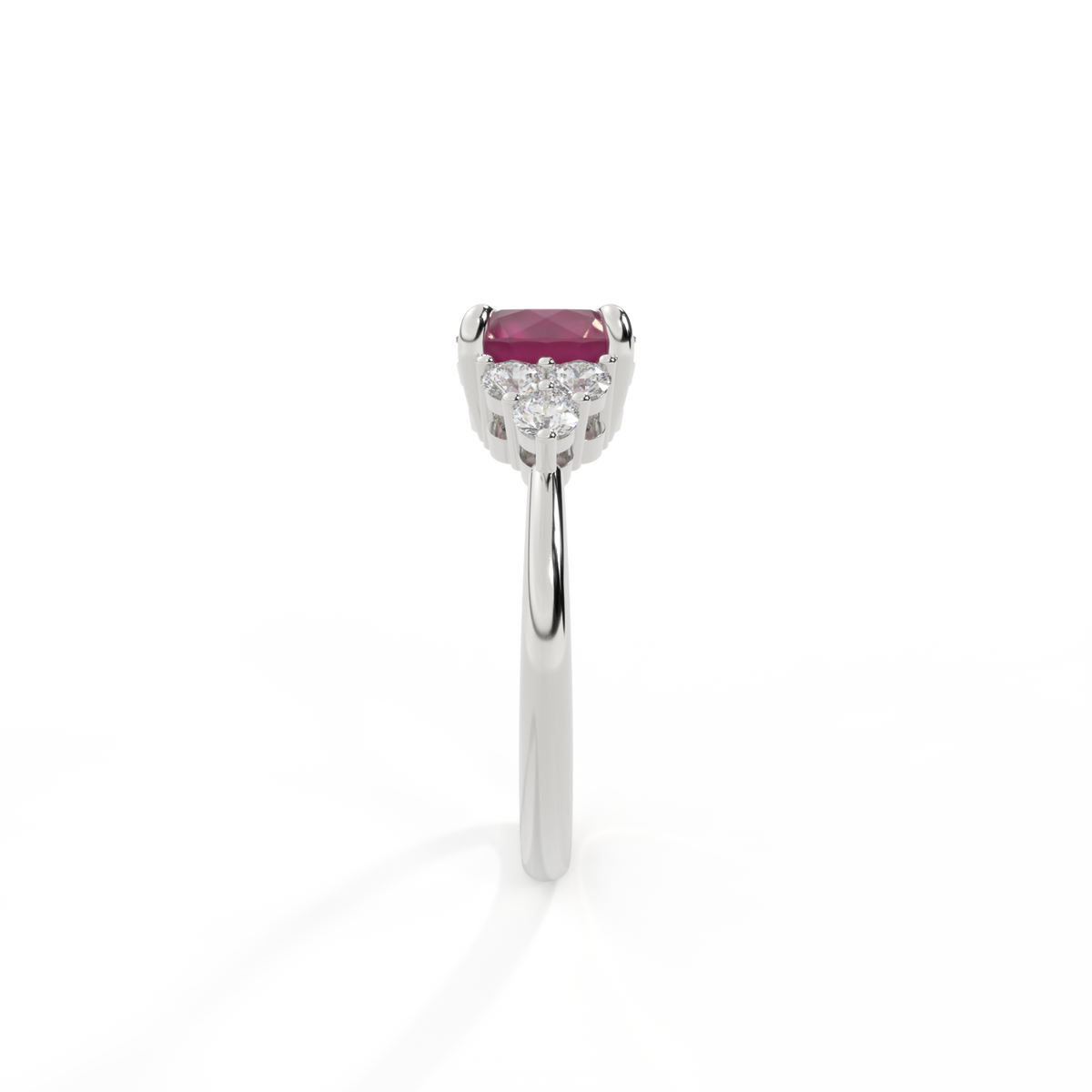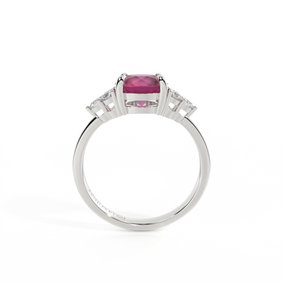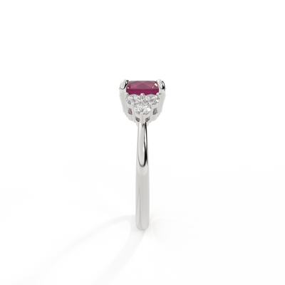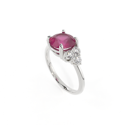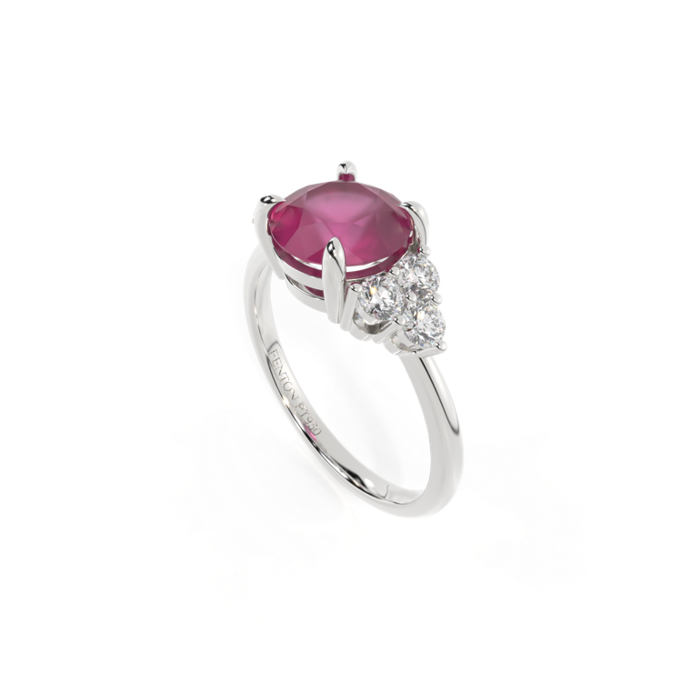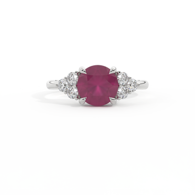 Your glistening Round cut Ruby is framed on either side by a trefoil cluster of three 1.8mm round brilliant cut GH/VS diamonds, each securely held into place in a claw setting. The design draws the eye to the glistening Ruby centre stone, sitting proudly in a classic open gallery setting crafted from solid, recycled 18K gold or platinum. The open setting of this design allows the light to reflect in all directions, creating a lustrous and sparkling look.